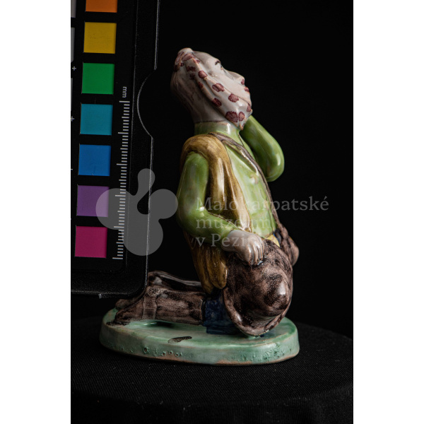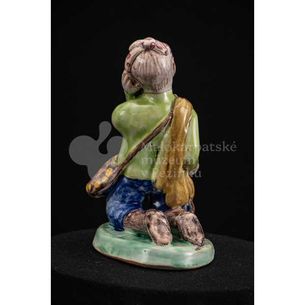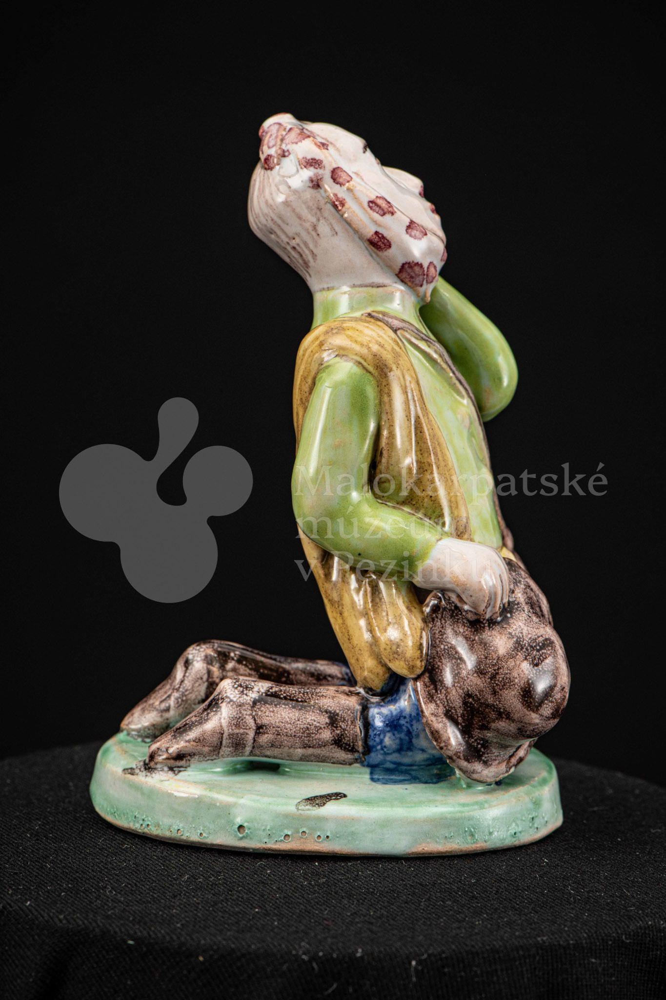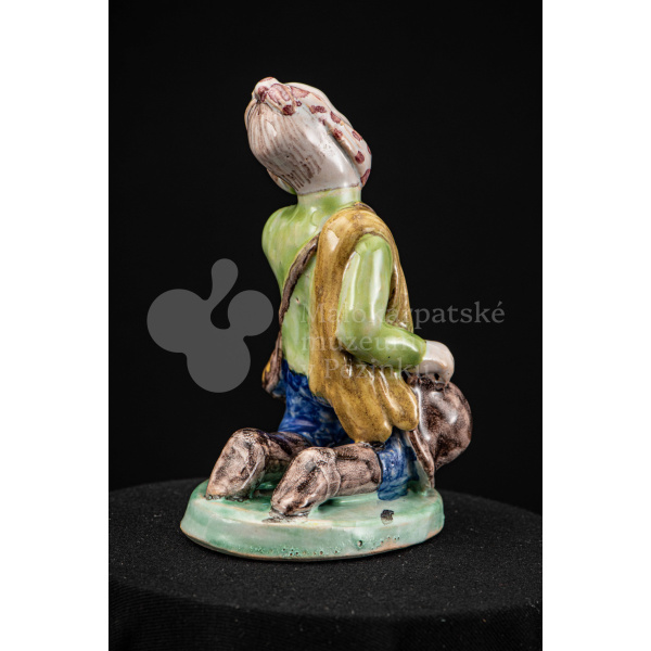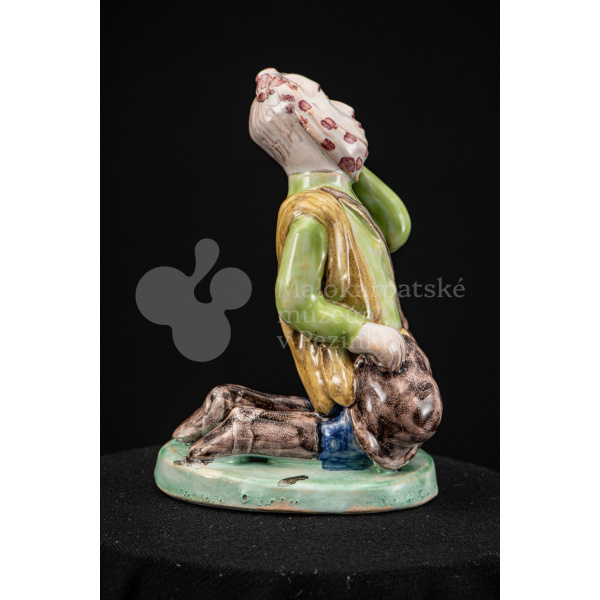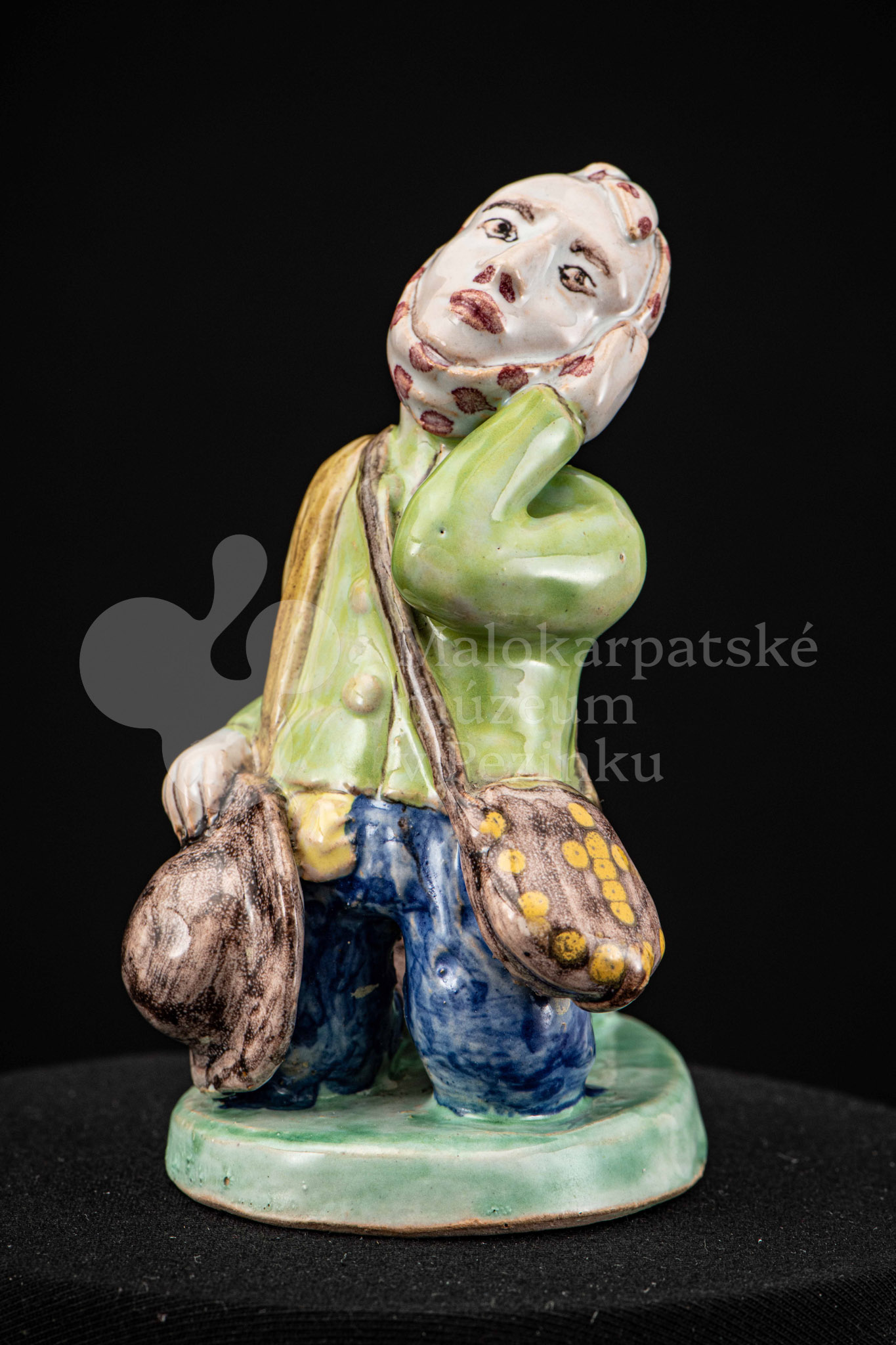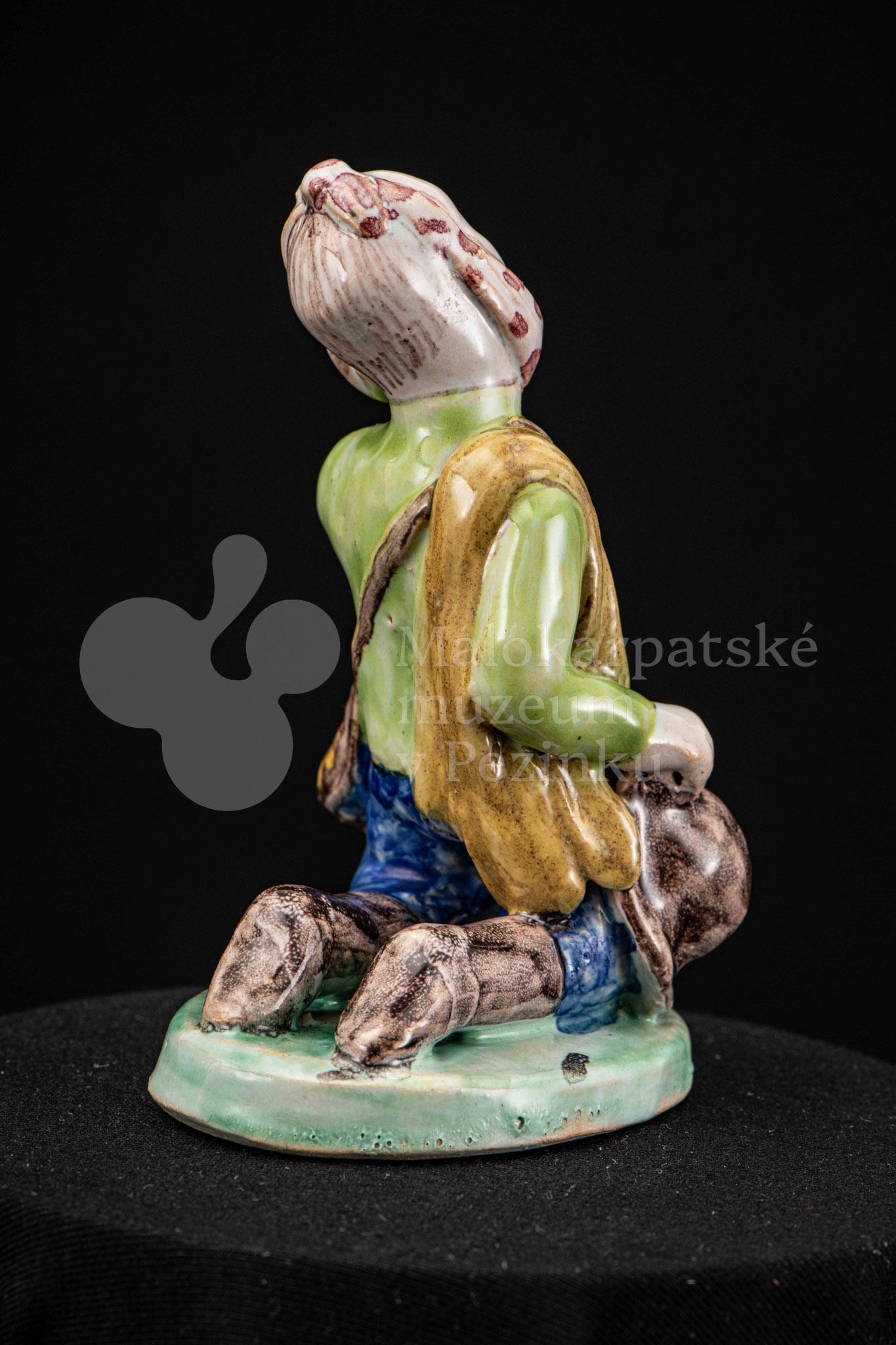 Plastika fajansová – kľačiaci muž, s tvárou obviazanou šatkou. Ľavou rukou si drží líce, v pravej klobúk. Postava je pestrofarebná, oválny podstavec je zelený. Na rube podstavca je značenie FK. ST.
