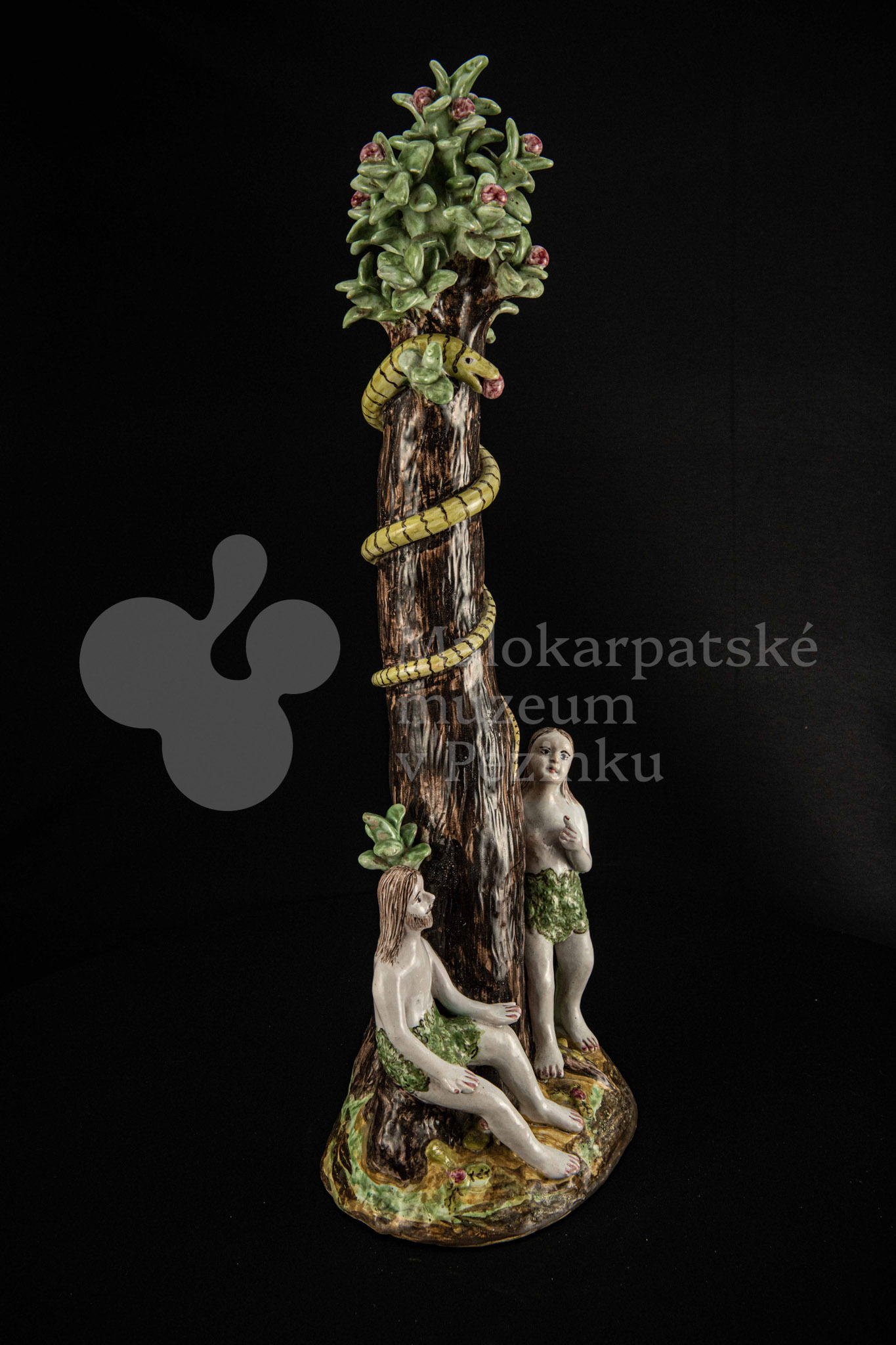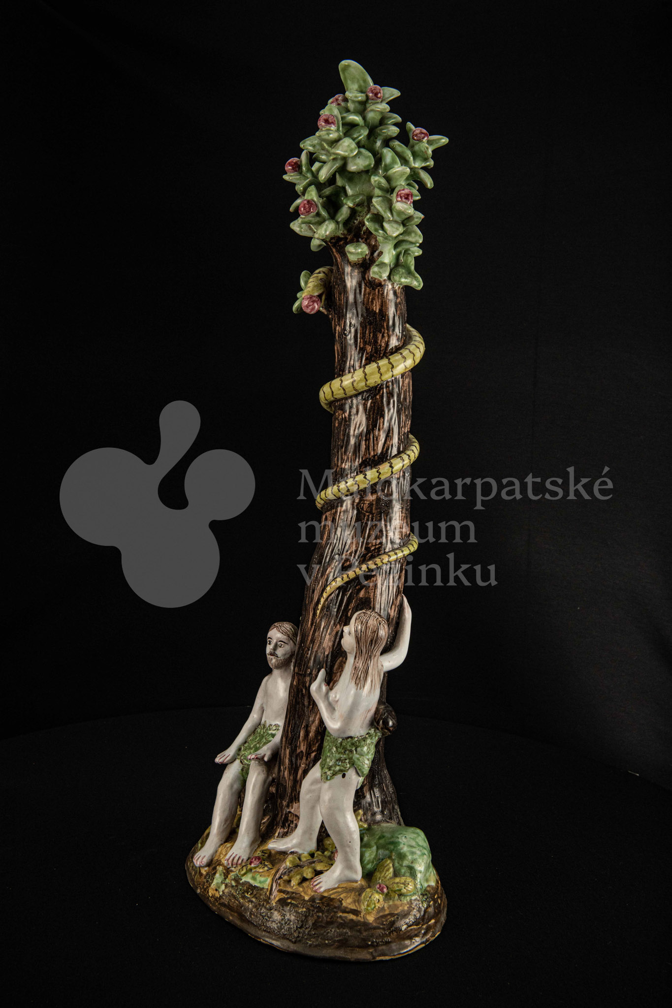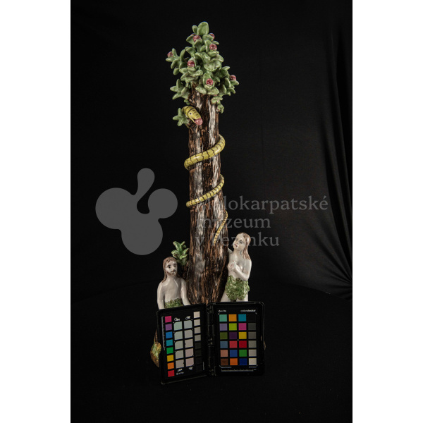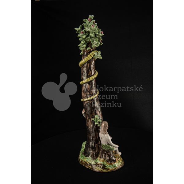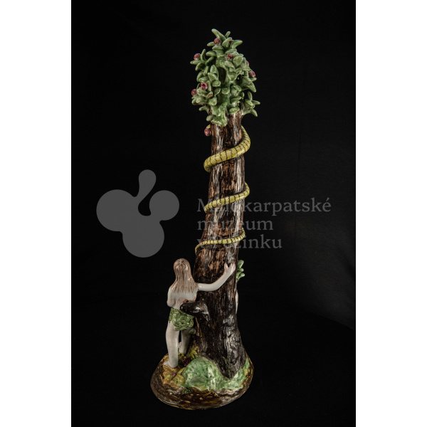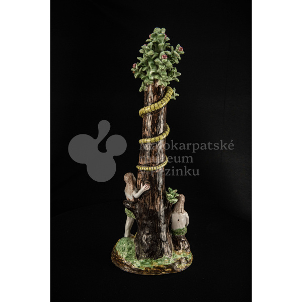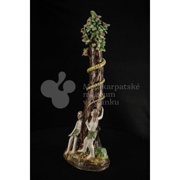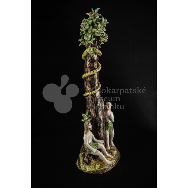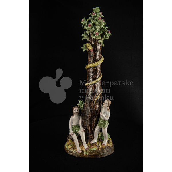 Súsošie fajansové – na oválnom podstavci veľký strom mangánovej farby – jabloň s hadom. Po ľavom boku stromu stojaca Eva a po pravom boku sediaci Adam sú v rozhovore. Farebnosť rôzna. Na rube podstavca je značenie FK.ST.