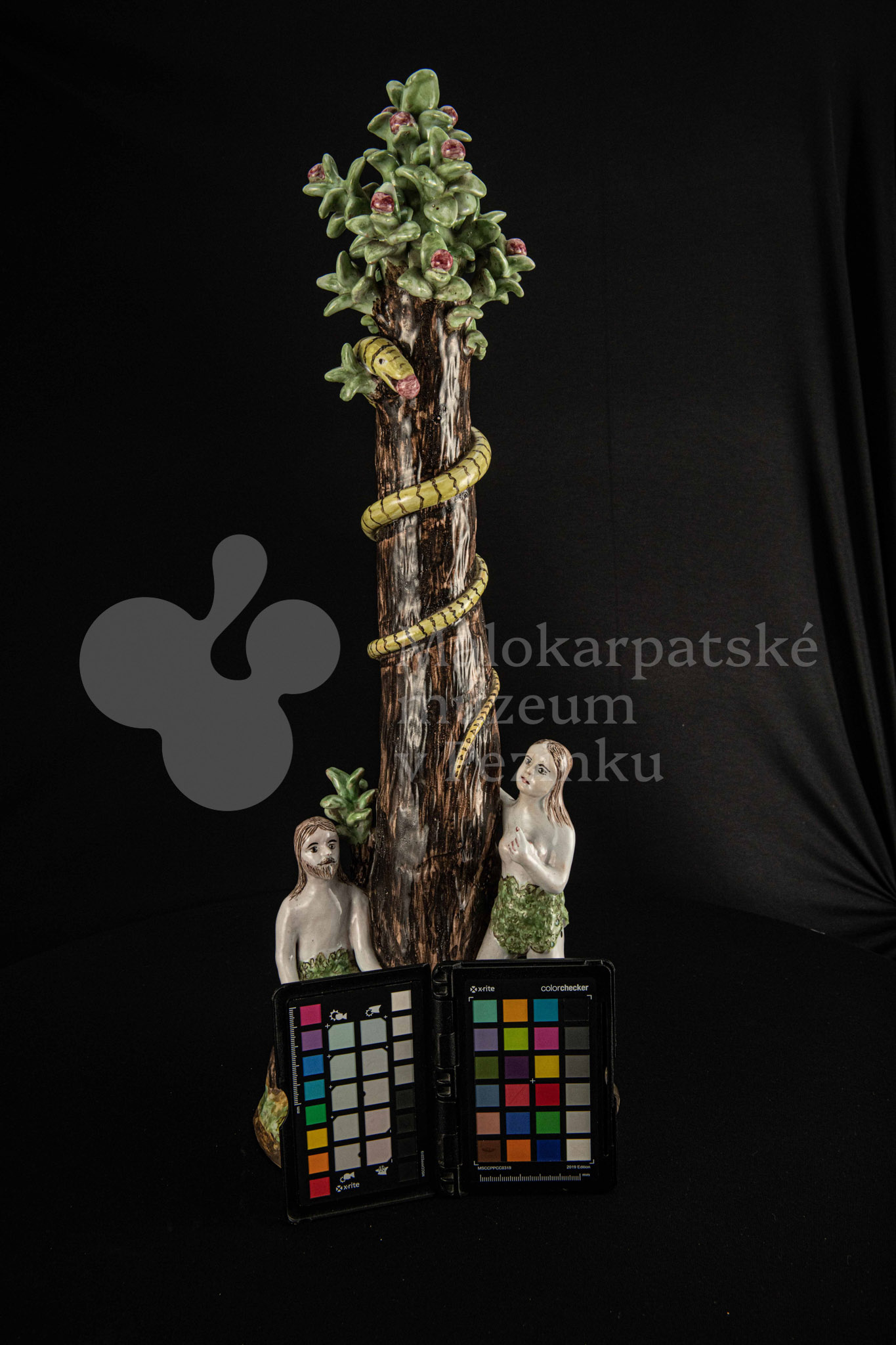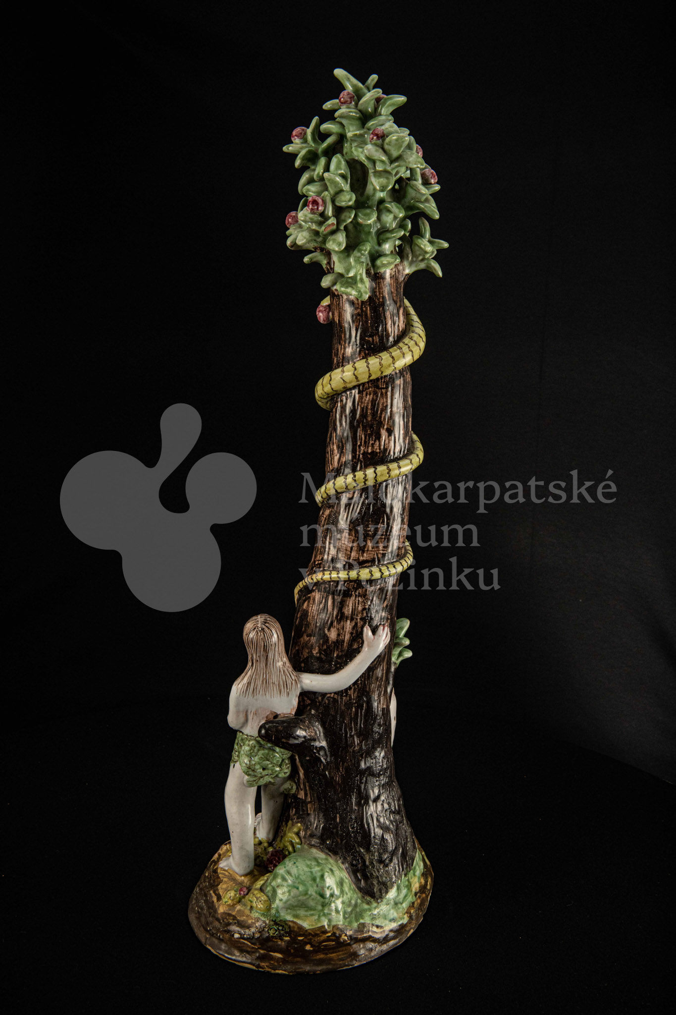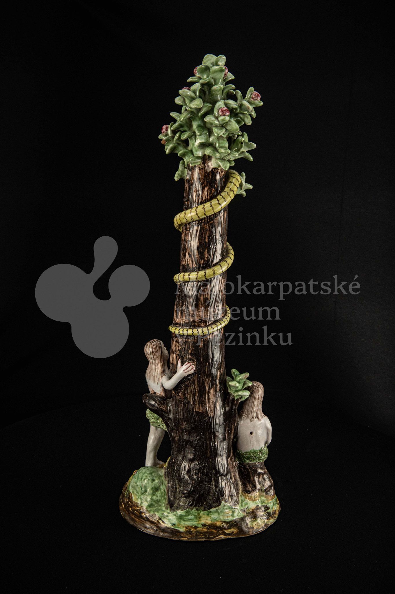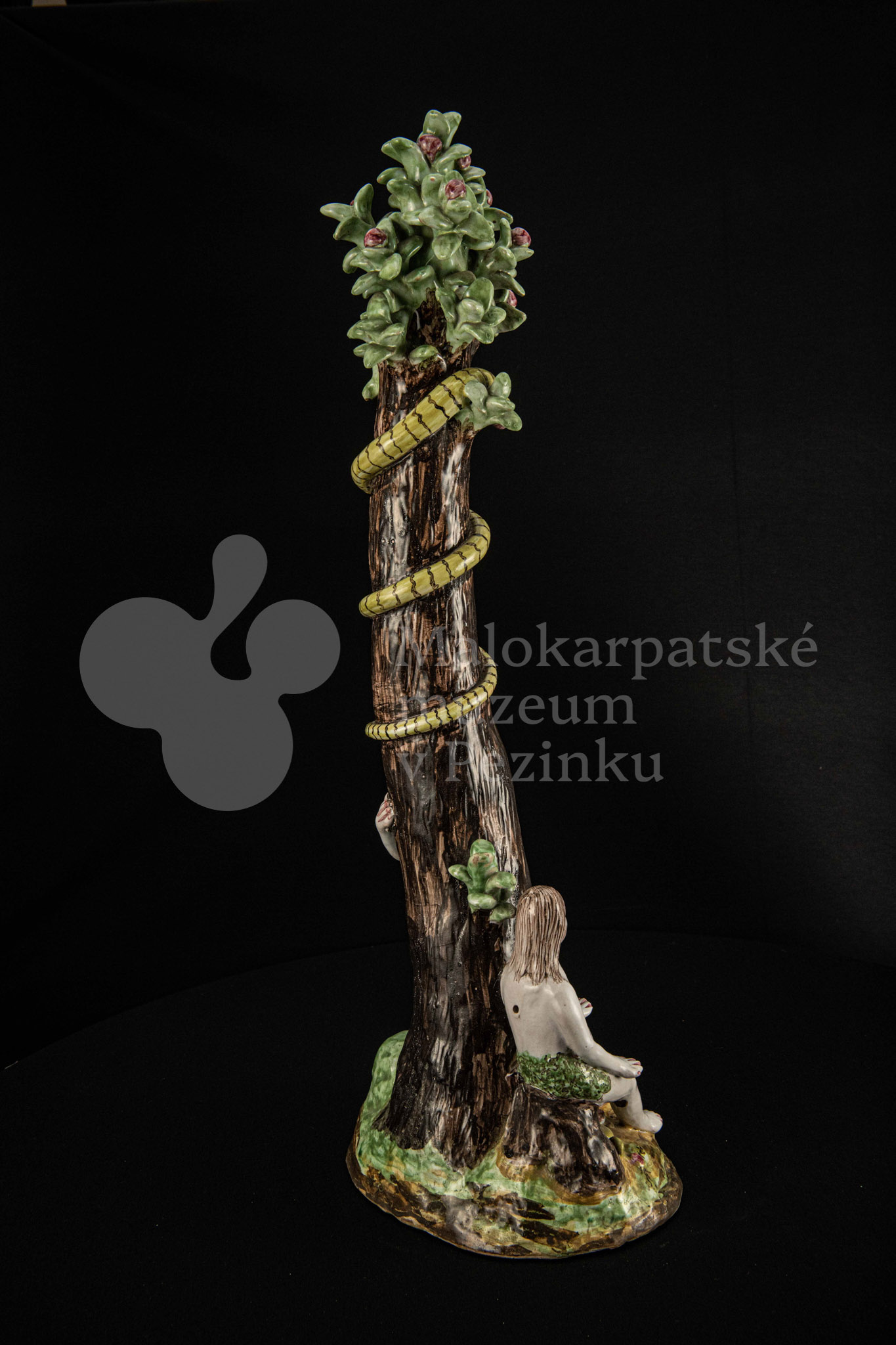 Súsošie fajansové – na oválnom podstavci veľký strom mangánovej farby – jabloň s hadom. Po ľavom boku stromu stojaca Eva a po pravom boku sediaci Adam sú v rozhovore. Farebnosť rôzna. Na rube podstavca je značenie FK.ST.