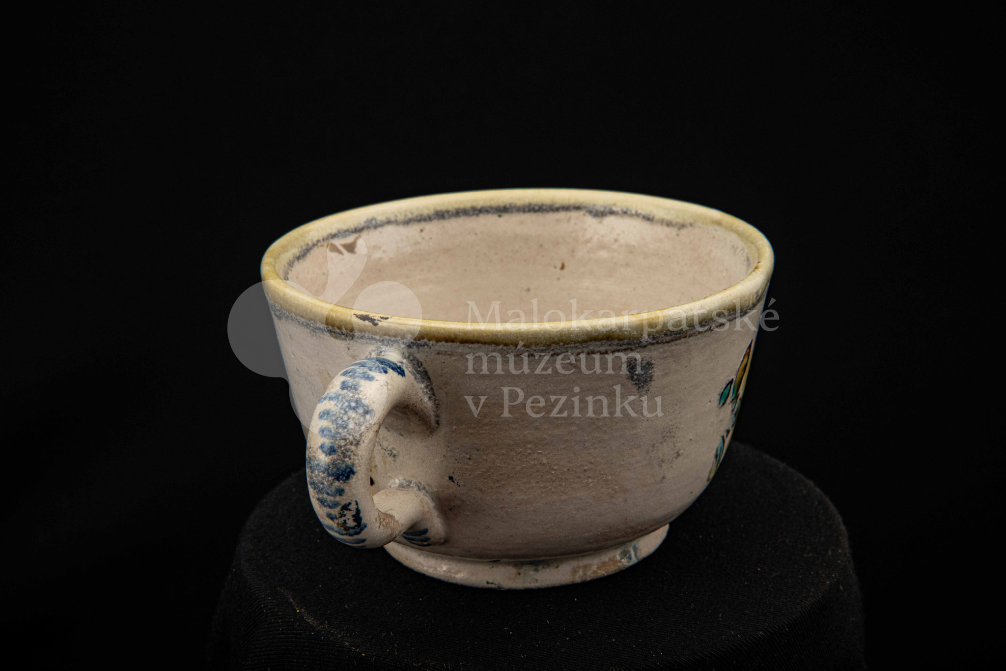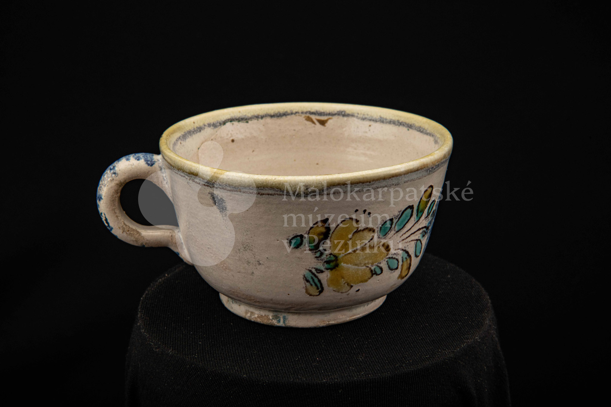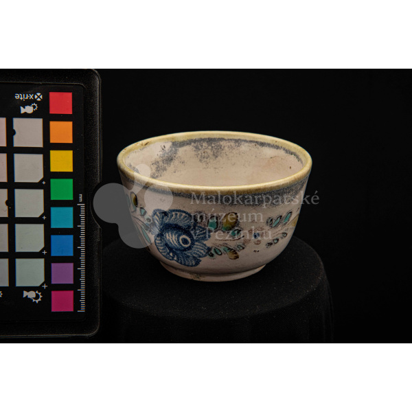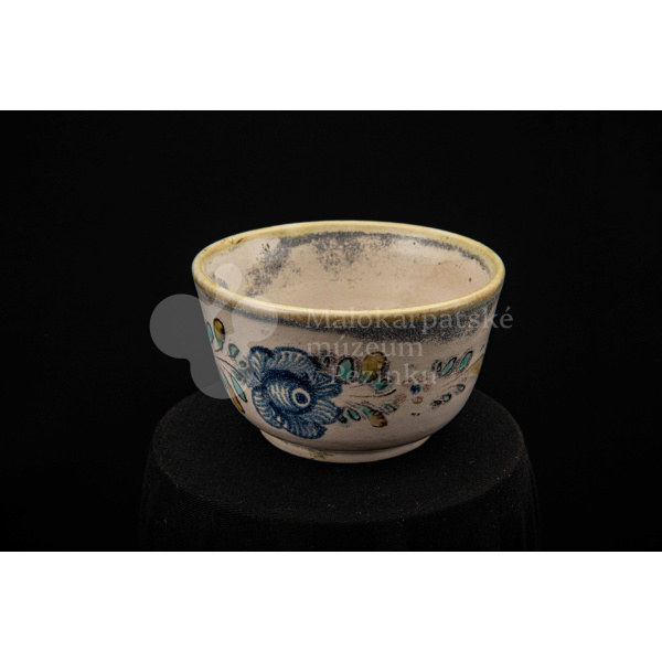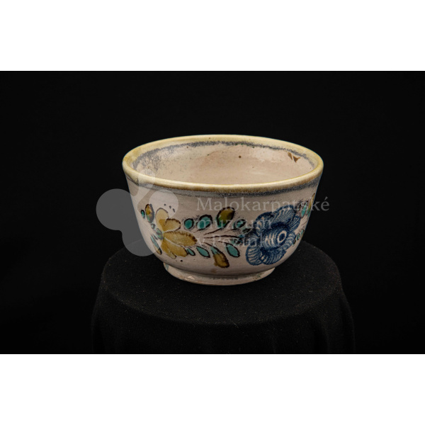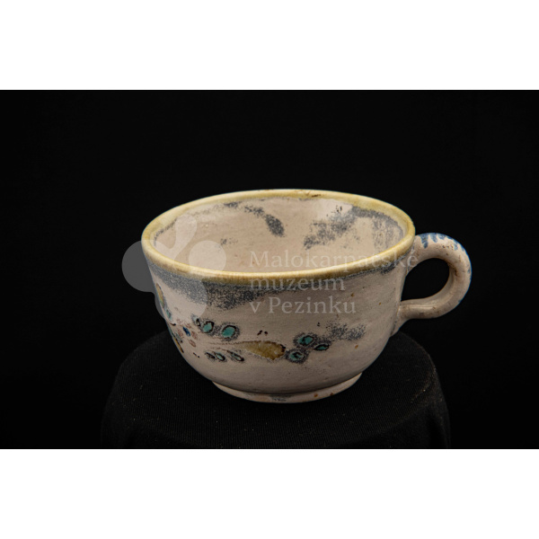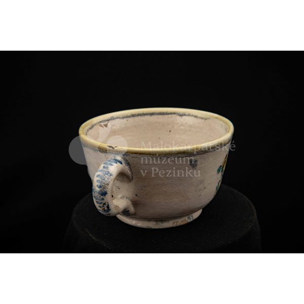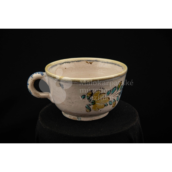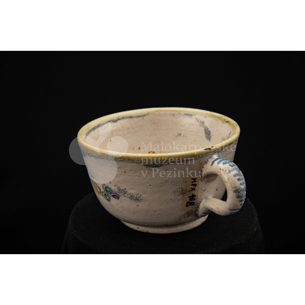 Šálka fajansová – s uškom, zdobená modrou ružou a žltým krajom. Bez značenia.