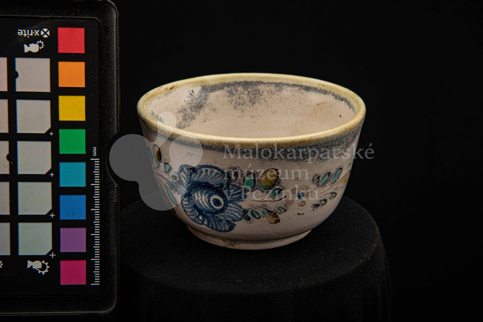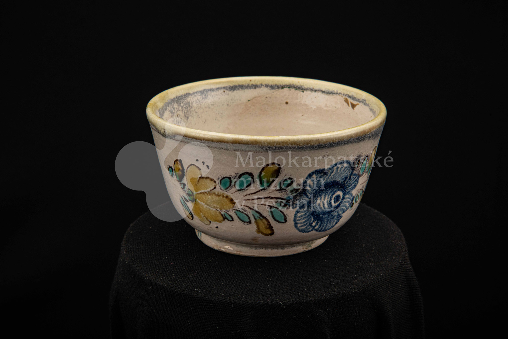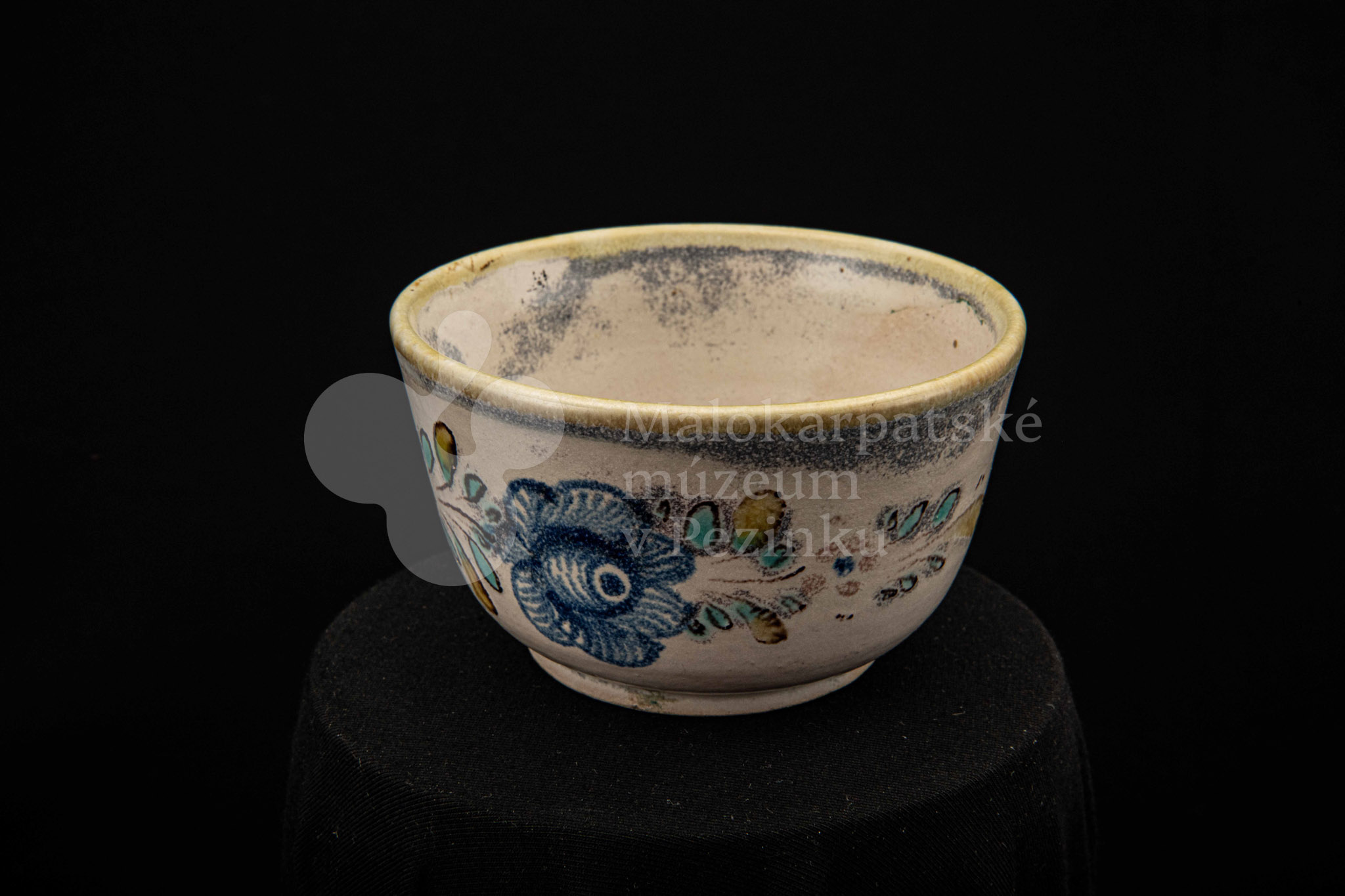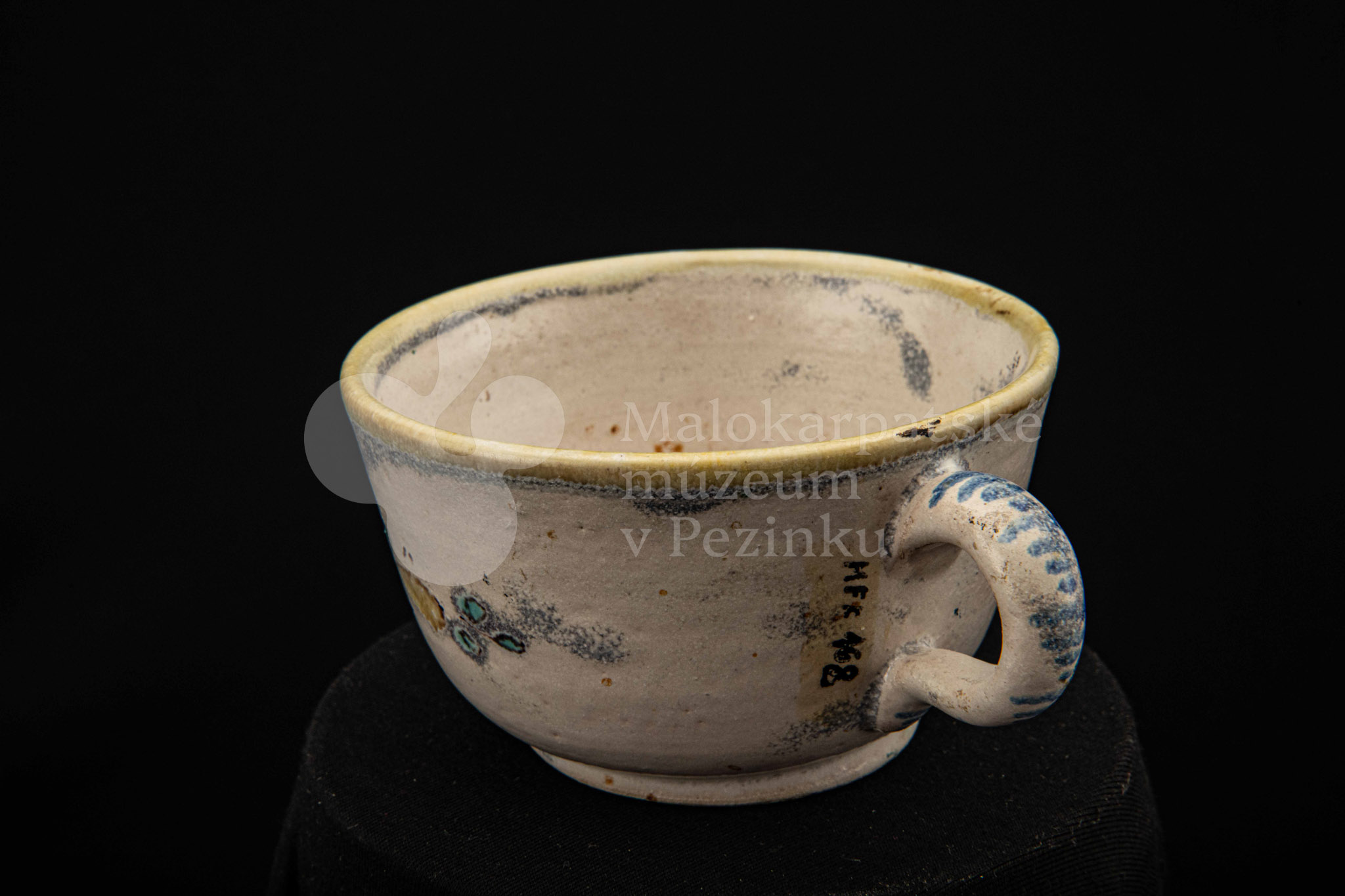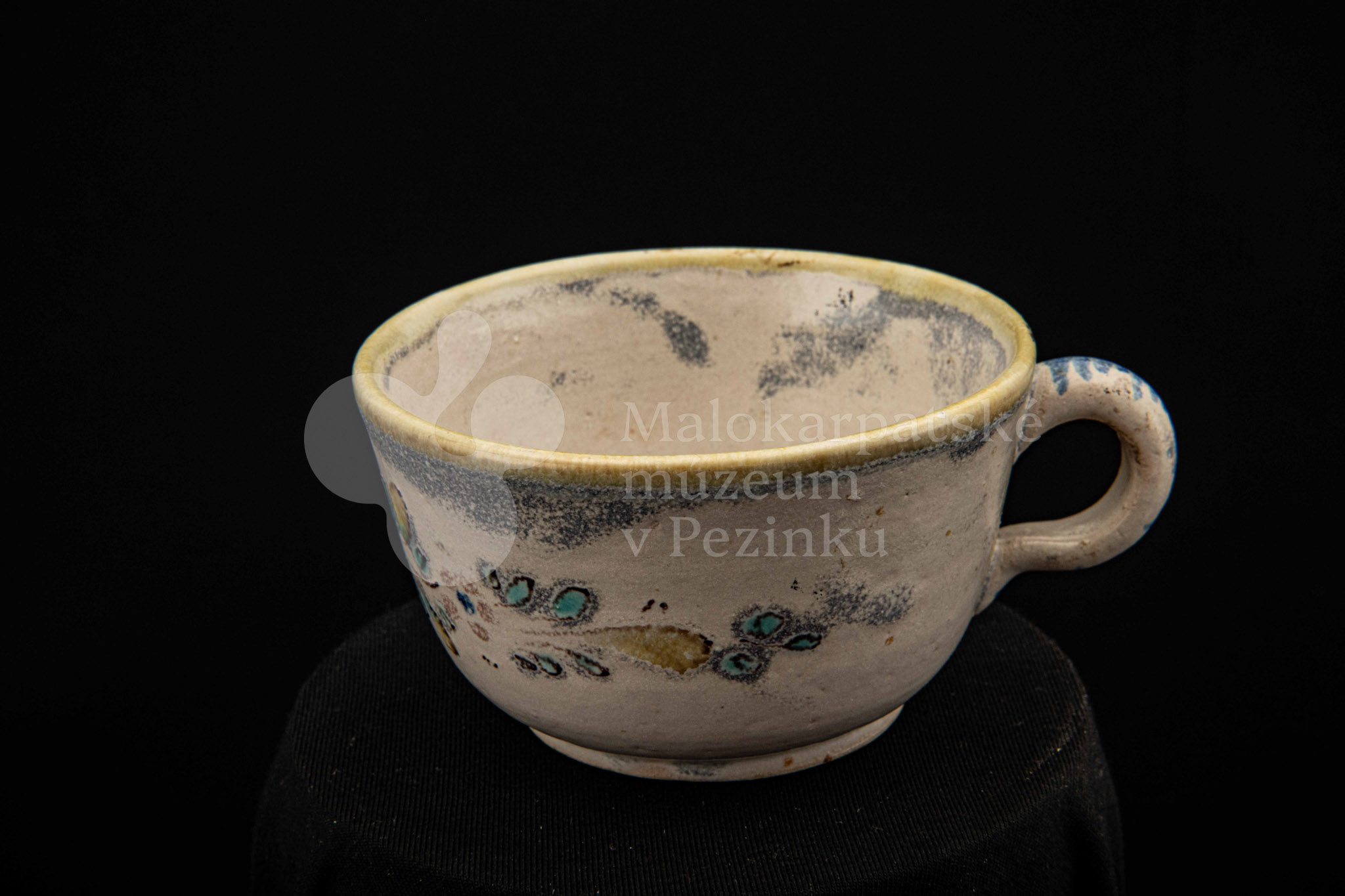 Šálka fajansová – s uškom, zdobená modrou ružou a žltým krajom. Bez značenia.