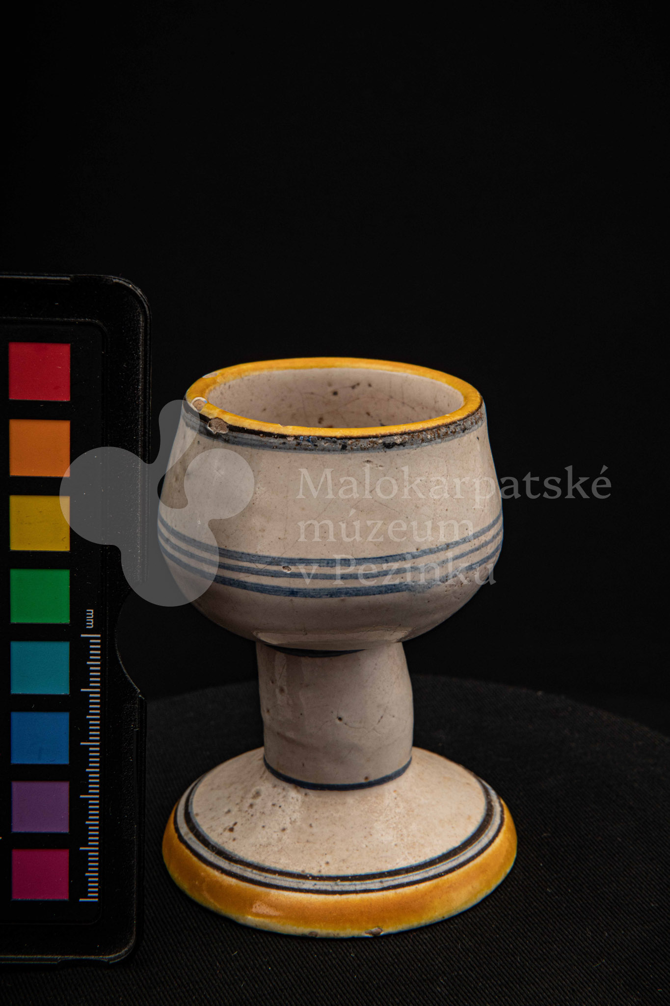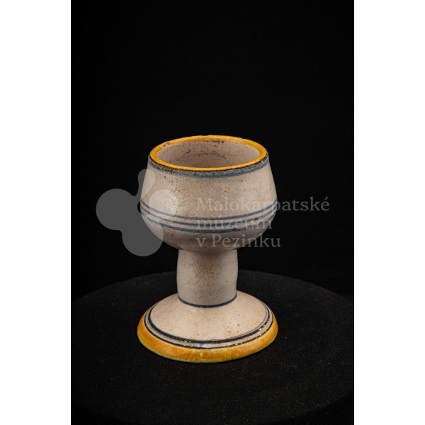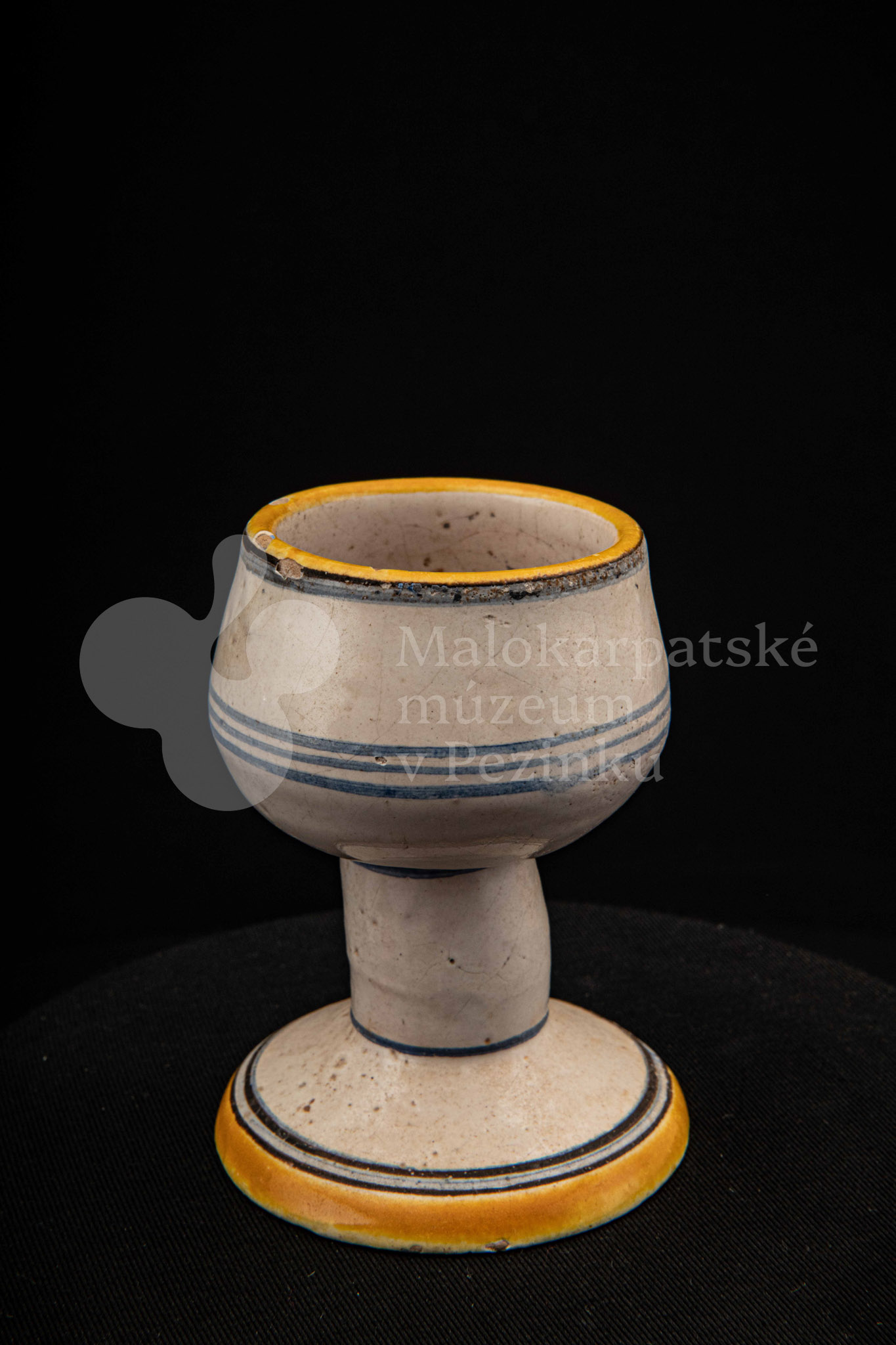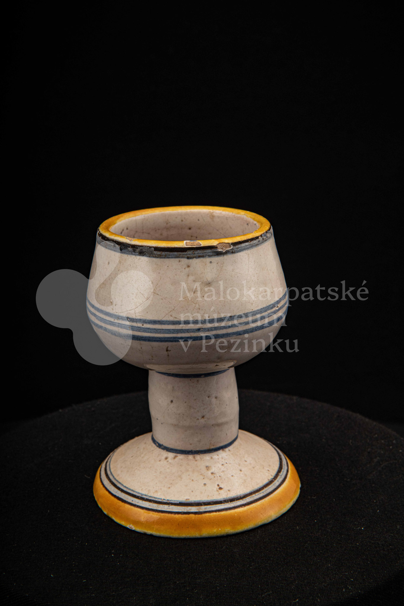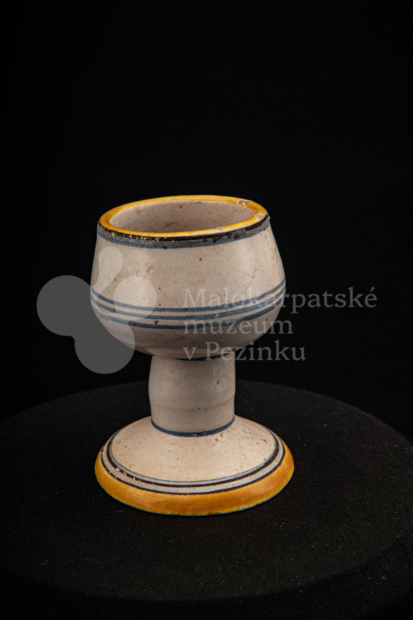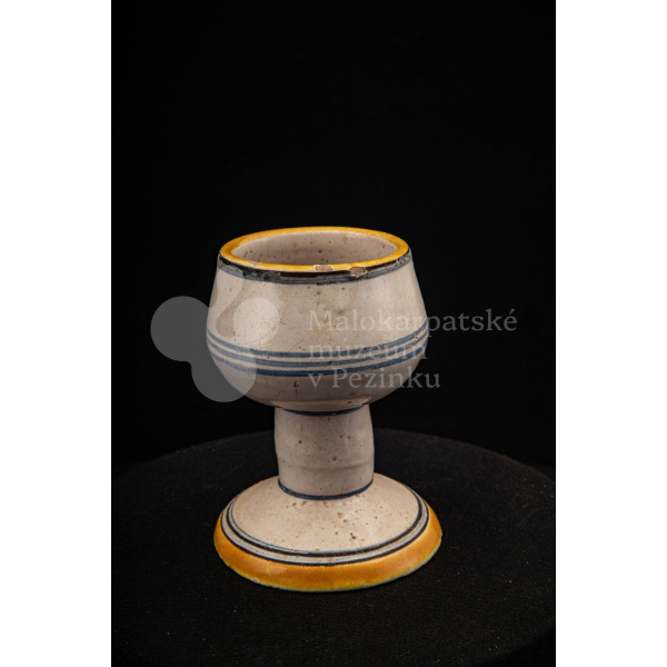 Nádobka fajansová – na celej ploche bieloglazovaná. Zdobená modrými a žltými pruhmi po obvode. Nádobka s vyššou nôžkou je postavená na okrúhlom podstavci. Na rube podstavca je značenie FK.ST.