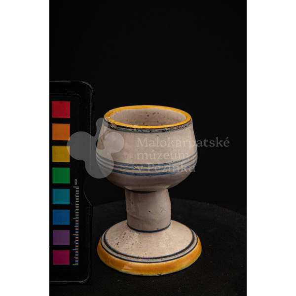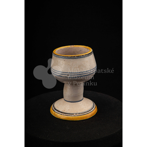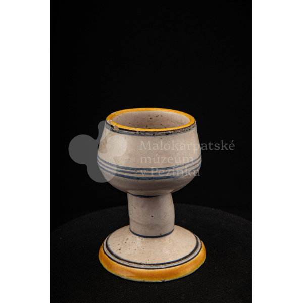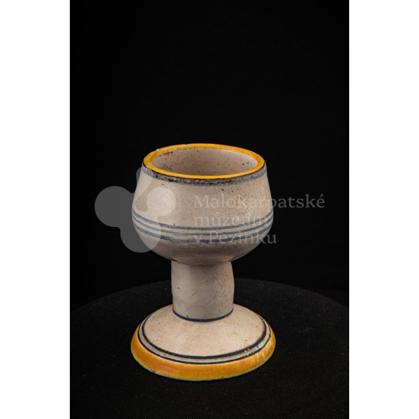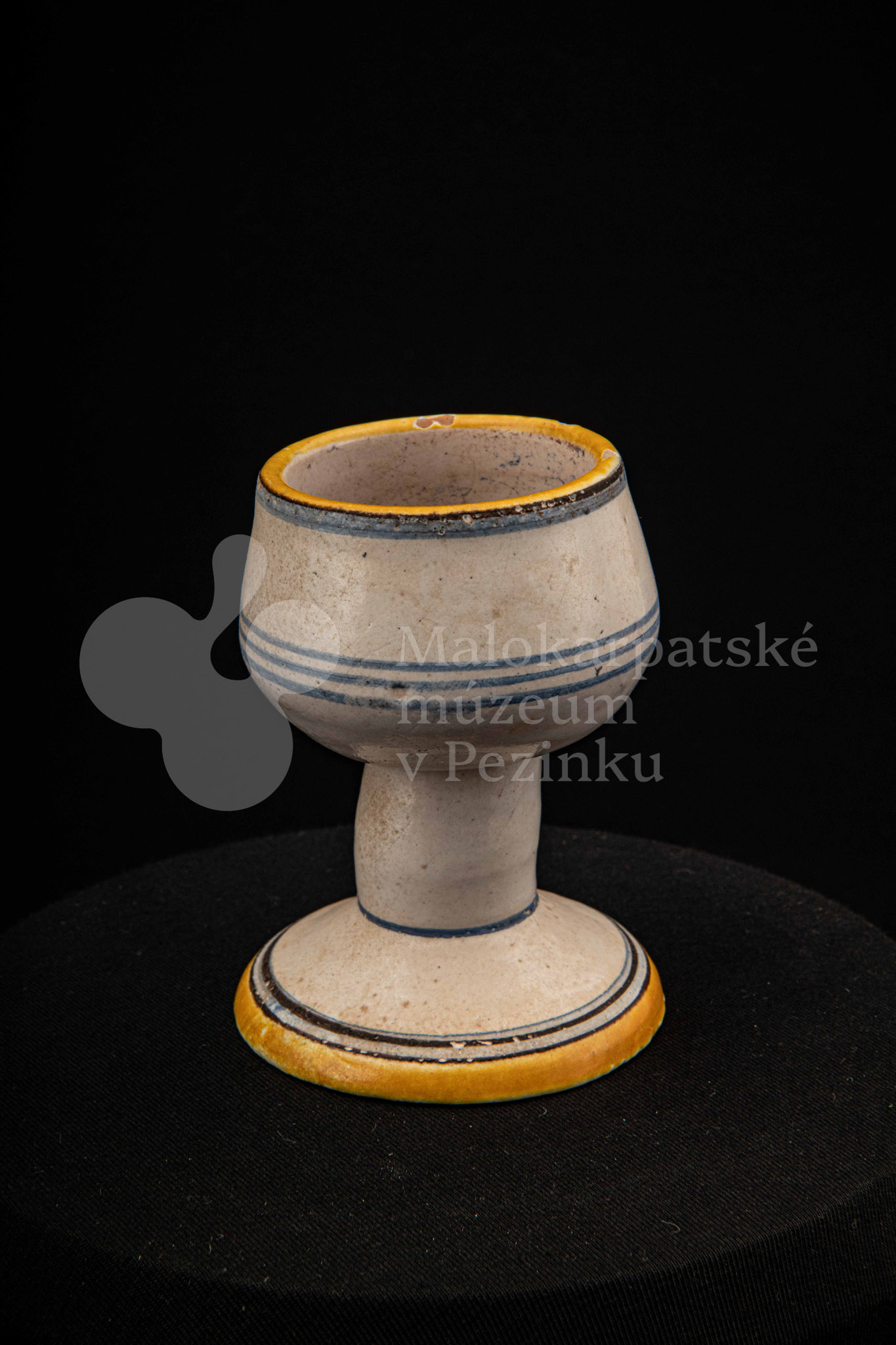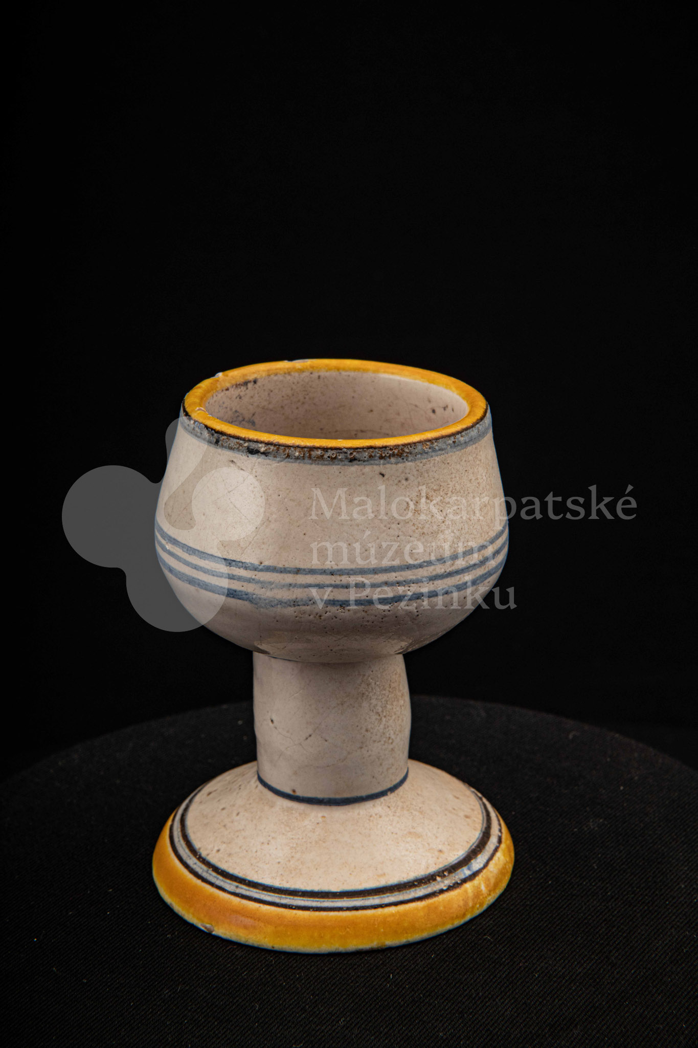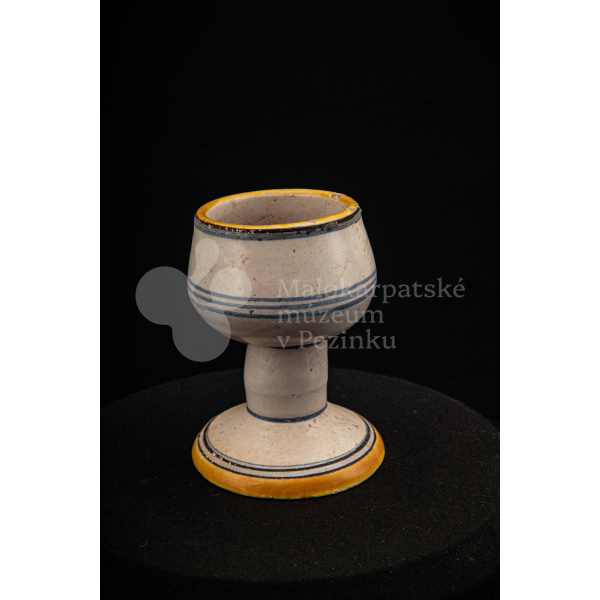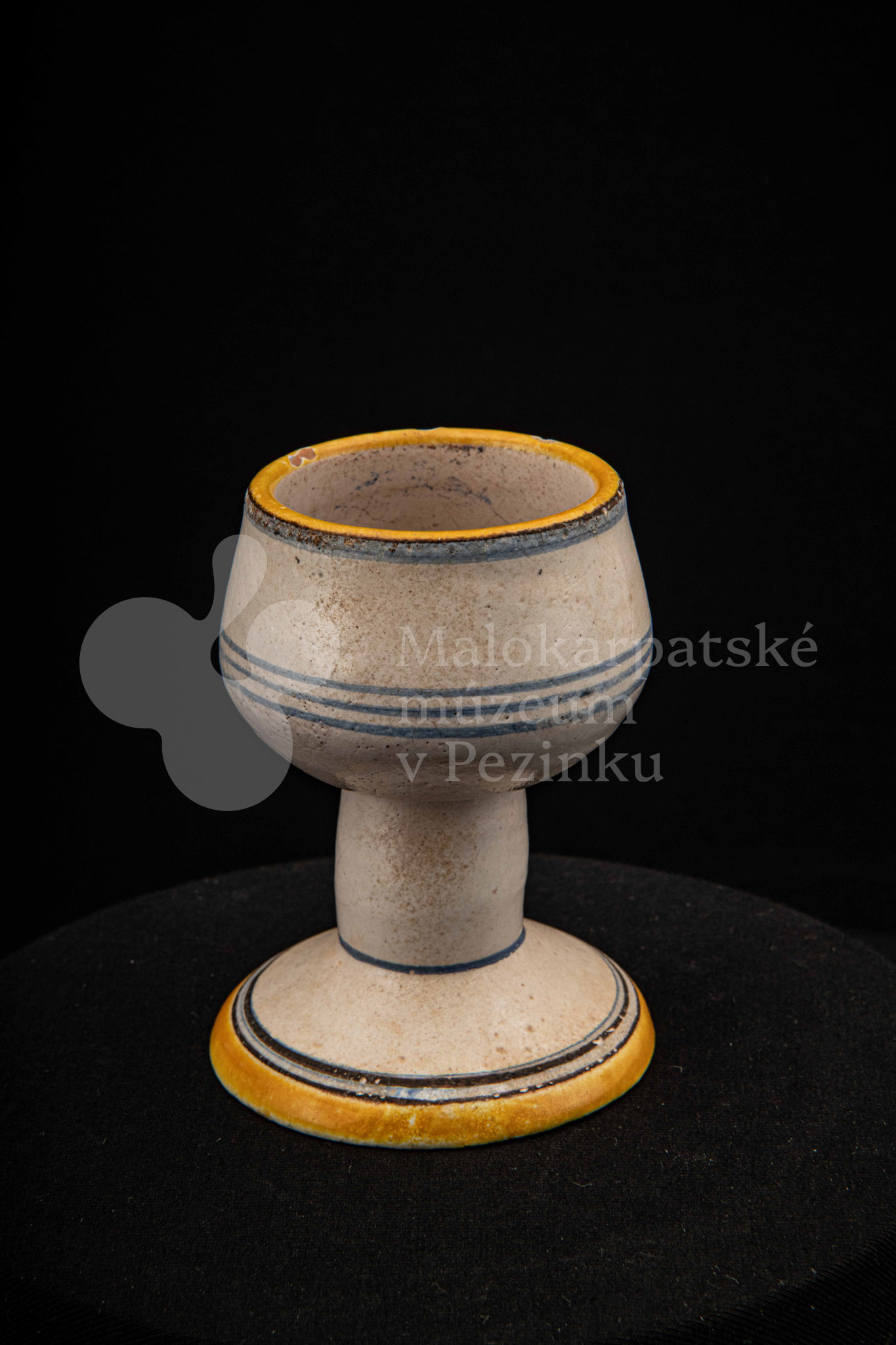 Nádobka fajansová – na celej ploche bieloglazovaná. Zdobená modrými a žltými pruhmi po obvode. Nádobka s vyššou nôžkou je postavená na okrúhlom podstavci. Na rube podstavca je značenie FK.ST.