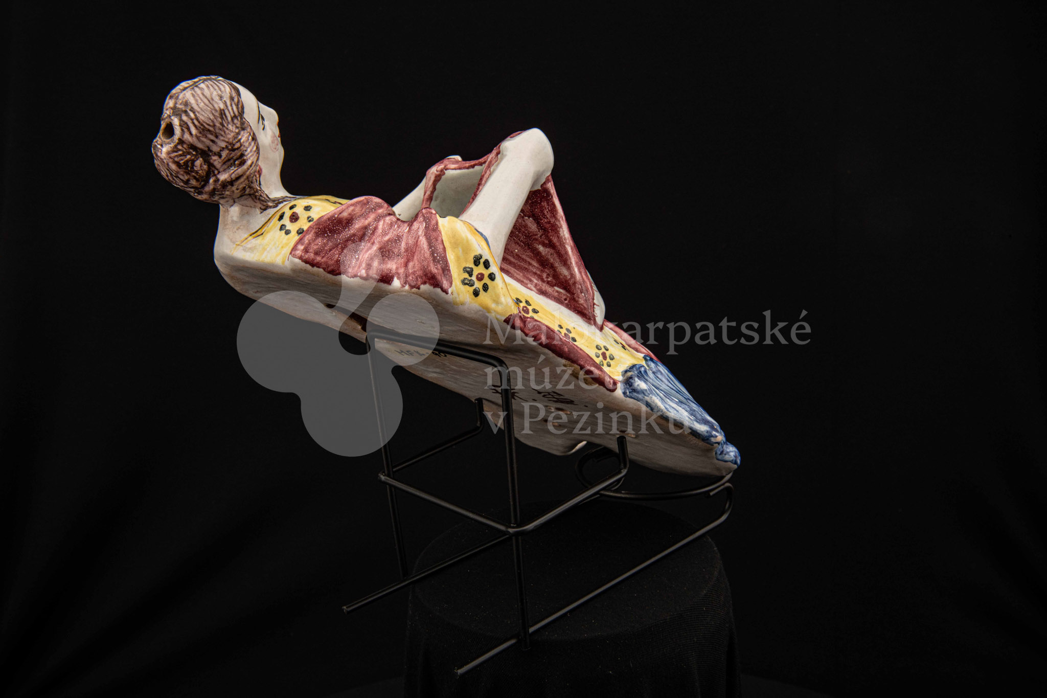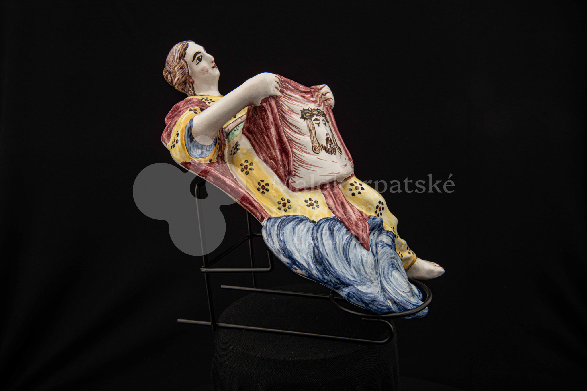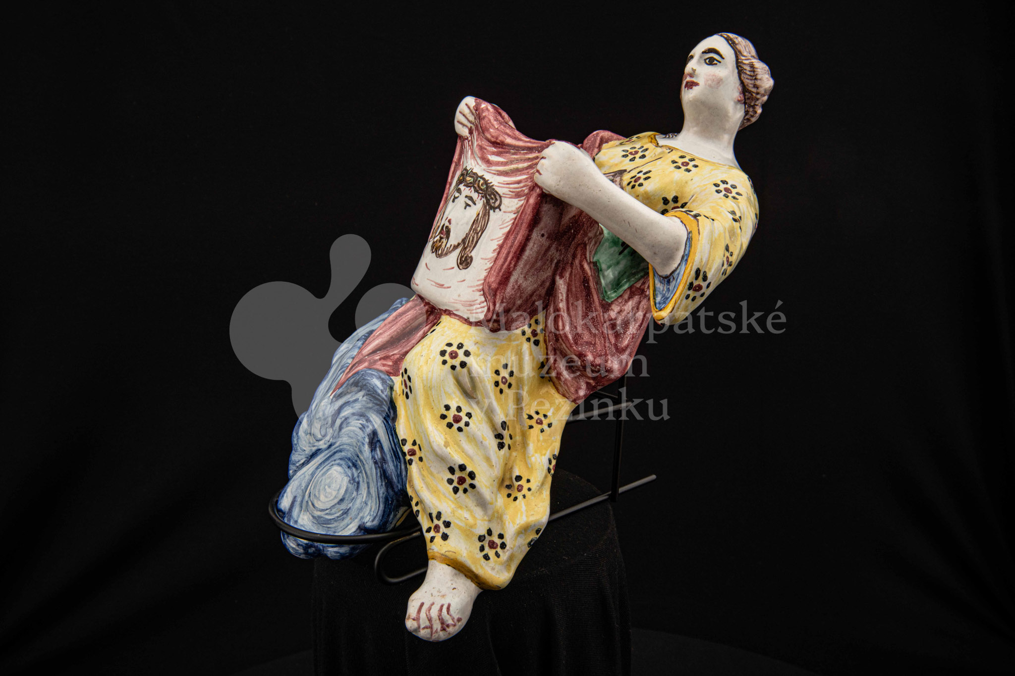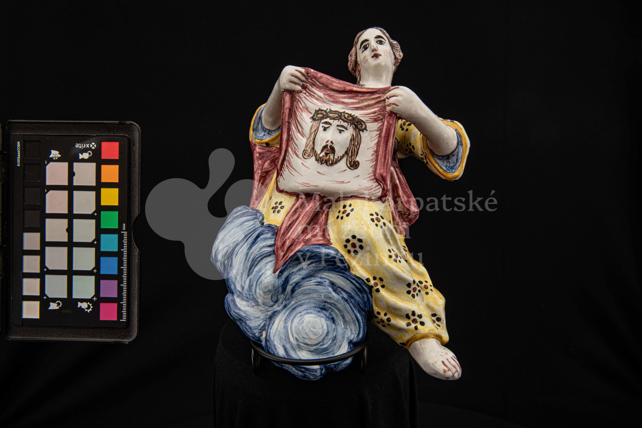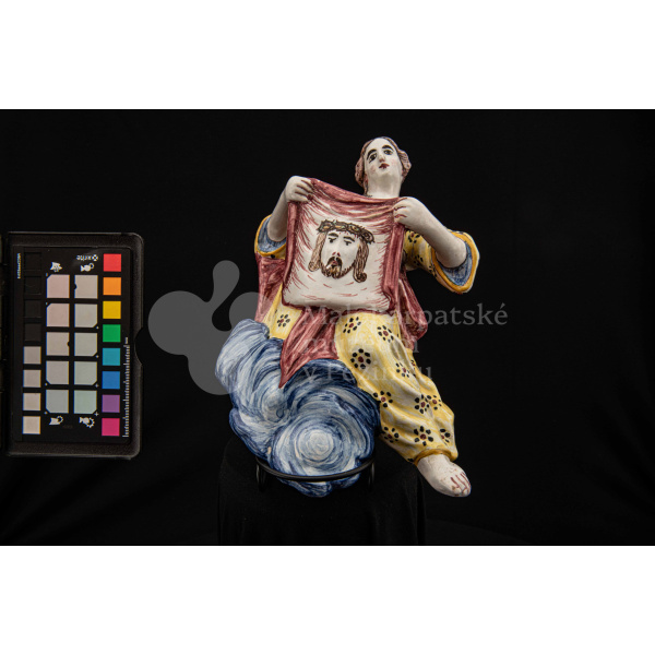 Kropenka nástenná fajansová, po celej ploche plastická – sv. Veronika drží v rukách šatku s obrazom Kristovej tváre, z ktorej je vytvorená nádobka na vodu. Farebnosť je rôzna, s prevahou bledožltej. Na rube značenie FK.ST.