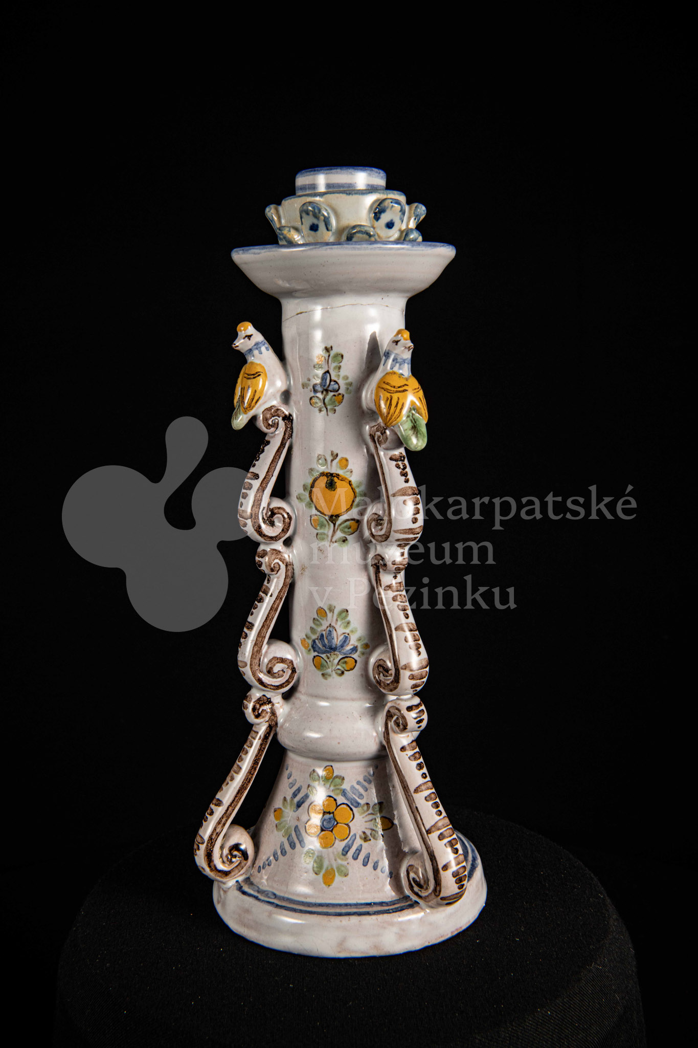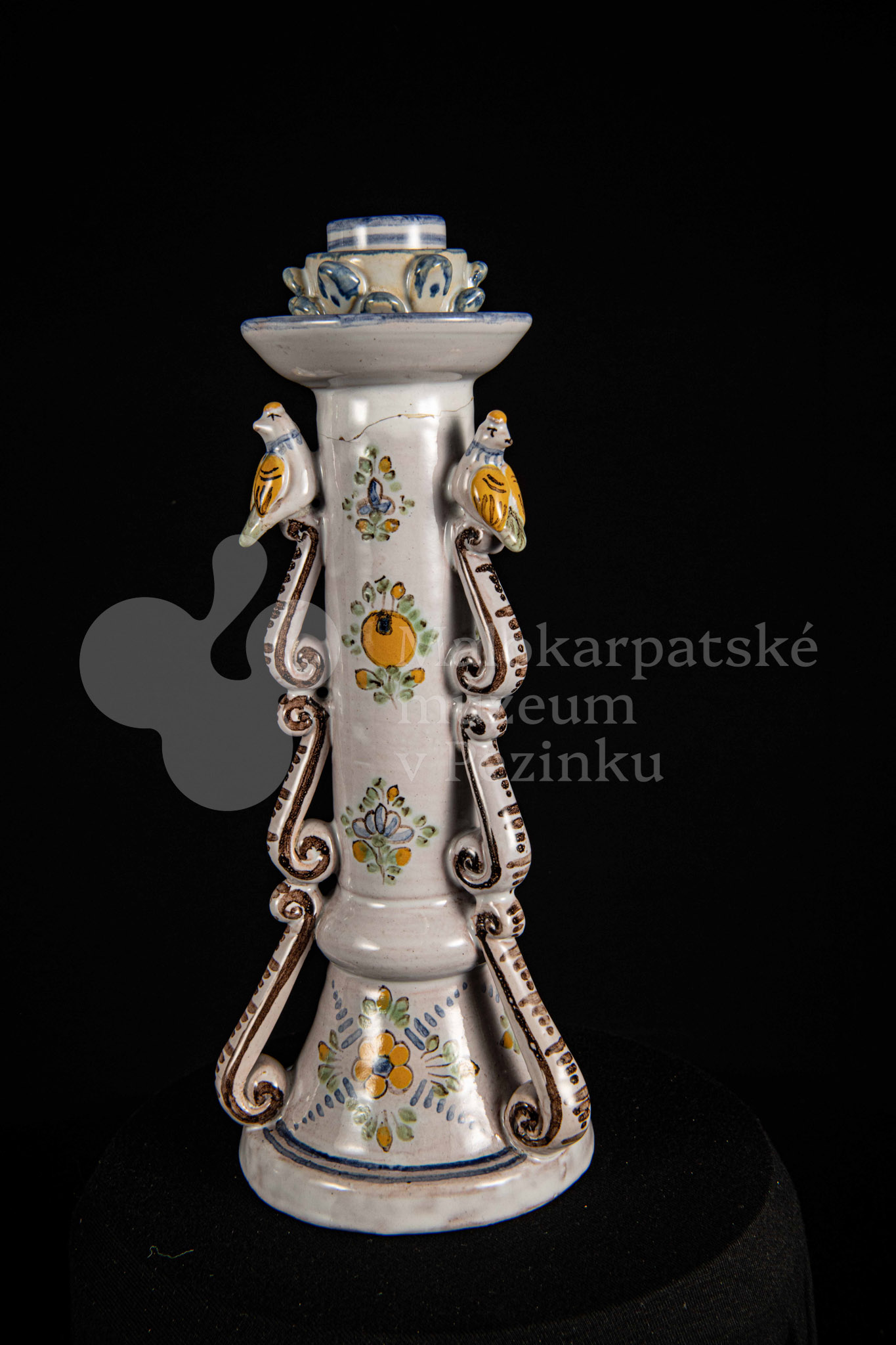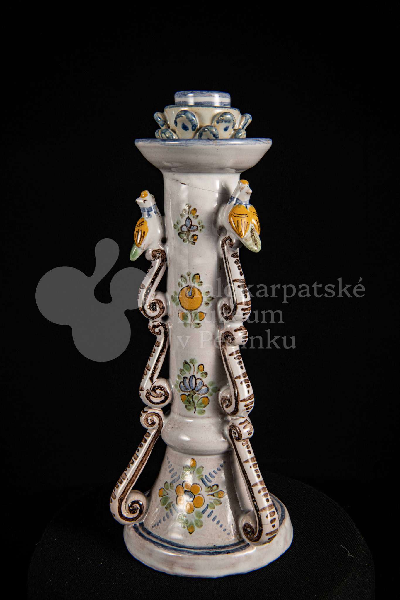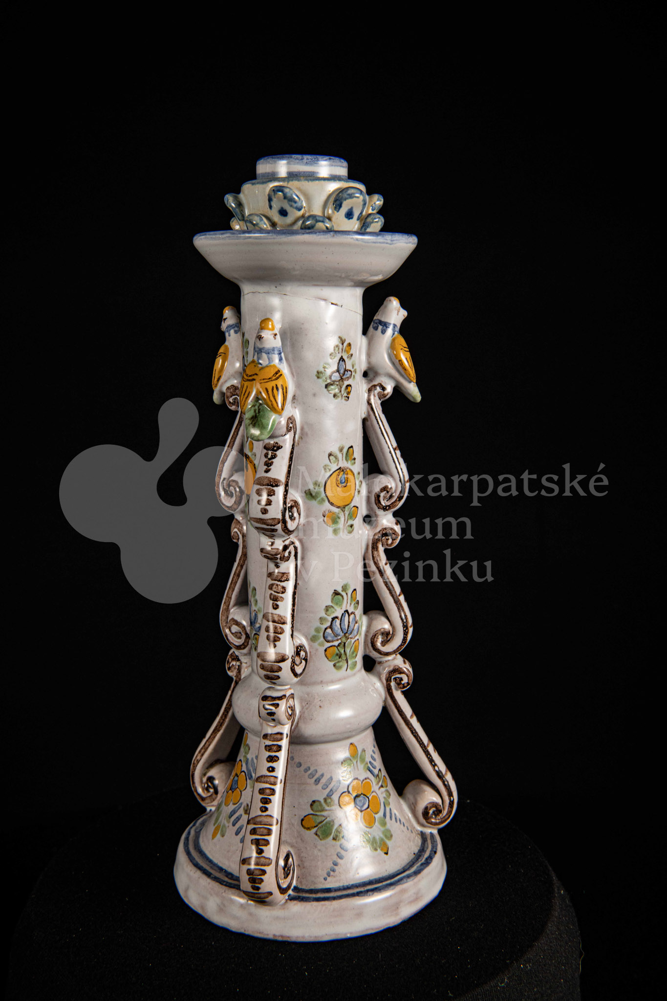 Svietnik fajansový – zvaný „vtáčkový“, má plastickú výzdobu pozostávajúcu z troch radov stĺpikov a troch vtáčkov. Po celej ploche bielo glazovaný s vysokožiarovým dekorom. Zvýraznená je farba mangánová. V hornej časti je poškodený a opravovaný. Bez značenia.