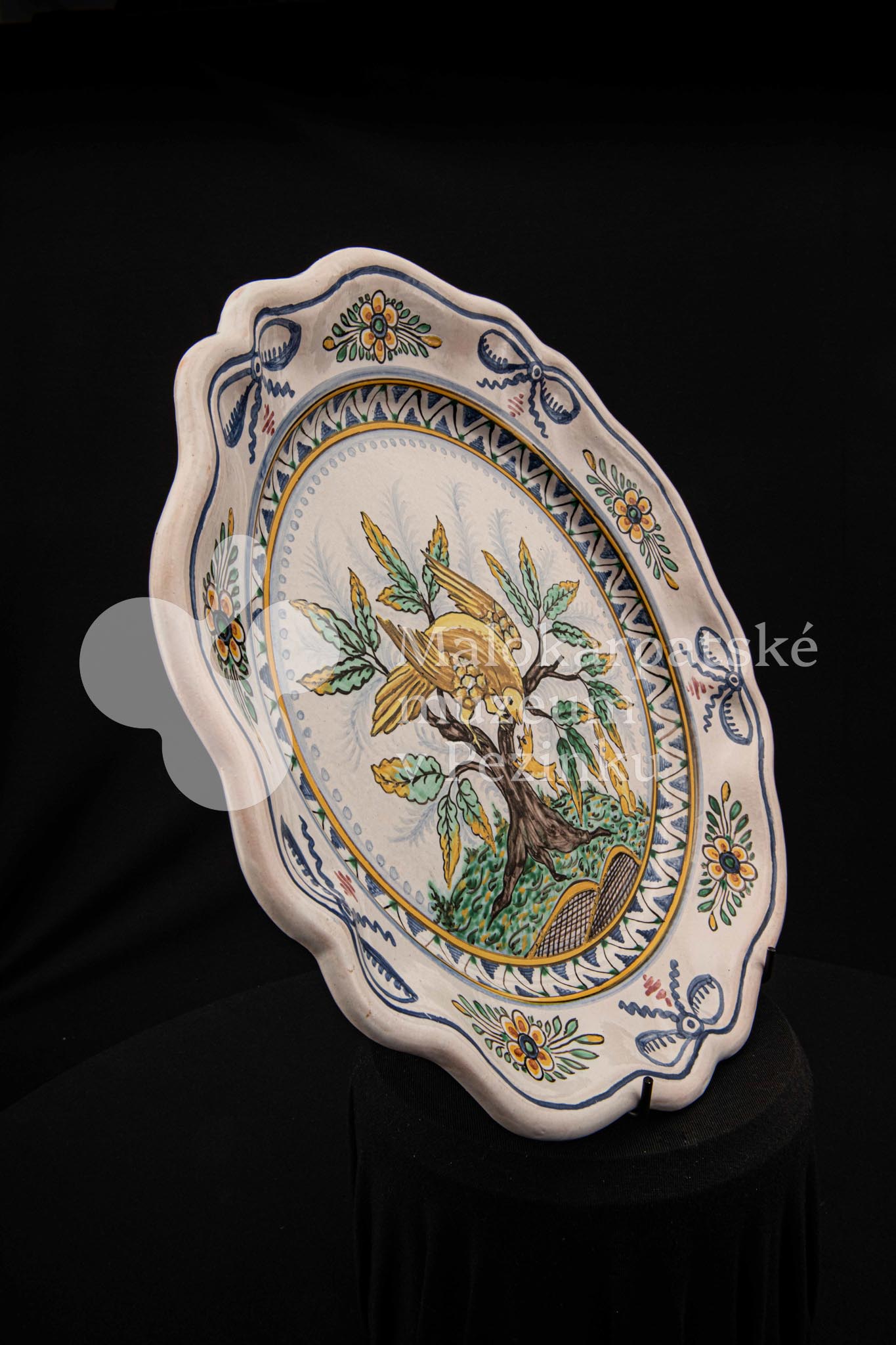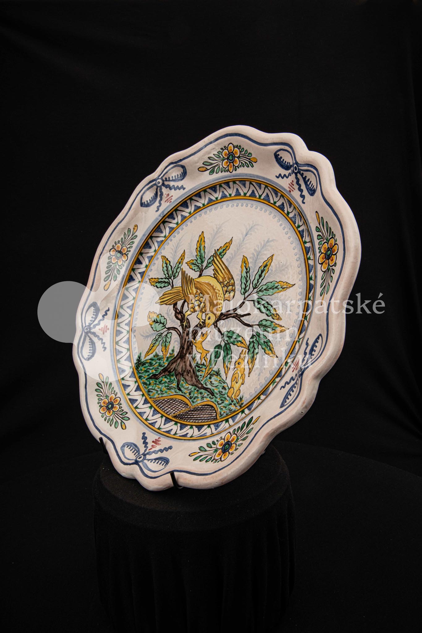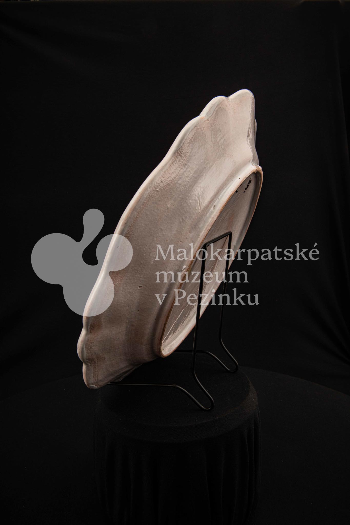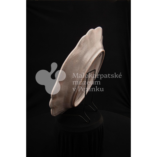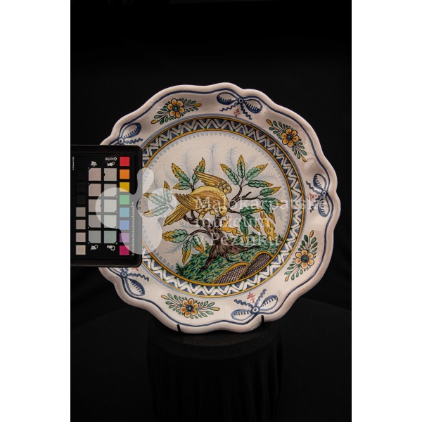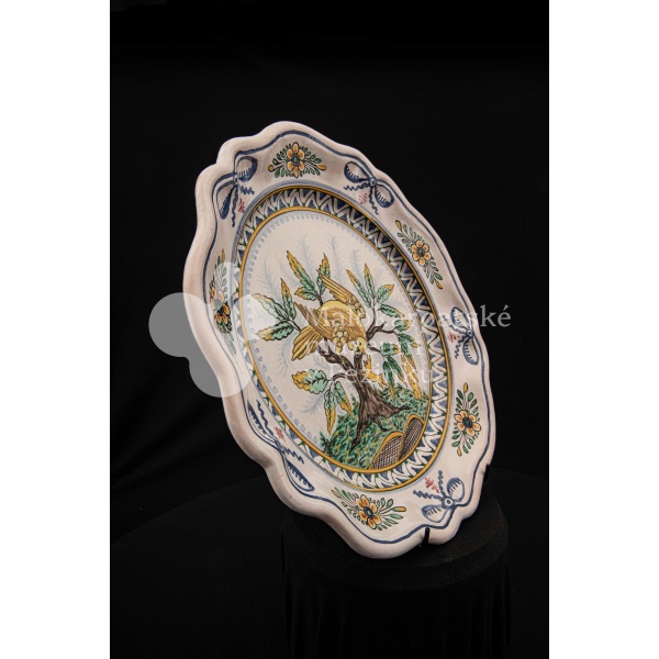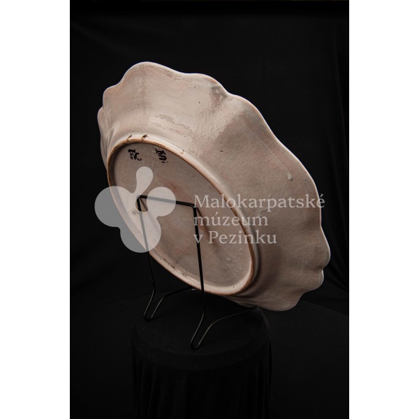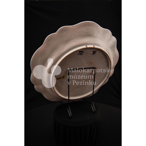 Tanier fajansový s prelamovaným okrajom. Bielo glazovaný, rôznofarebný vysokožiarový dekor, v strede zobrazujúci orla poľujúceho na zajaca. Na dne značený FK.ST.