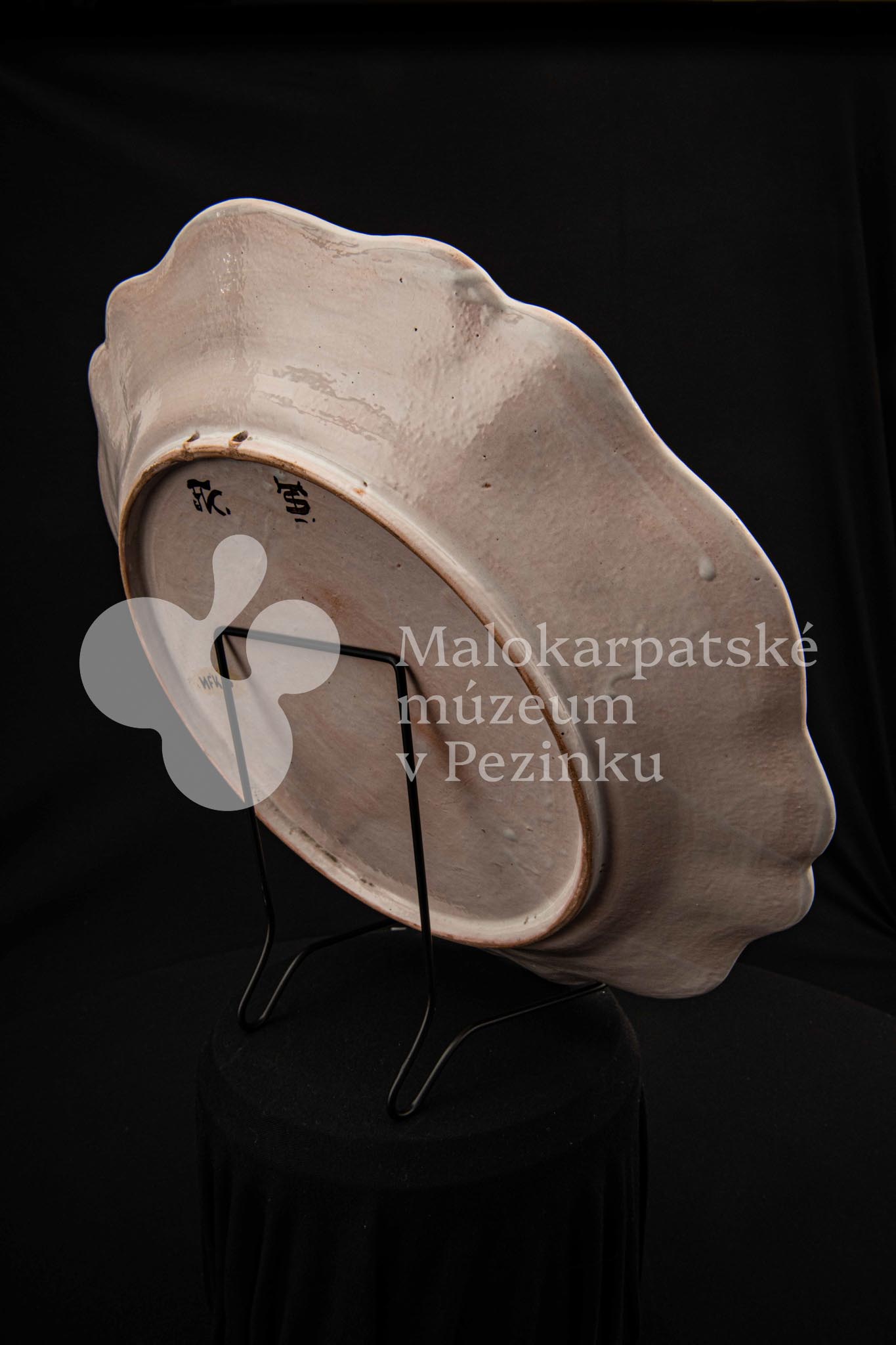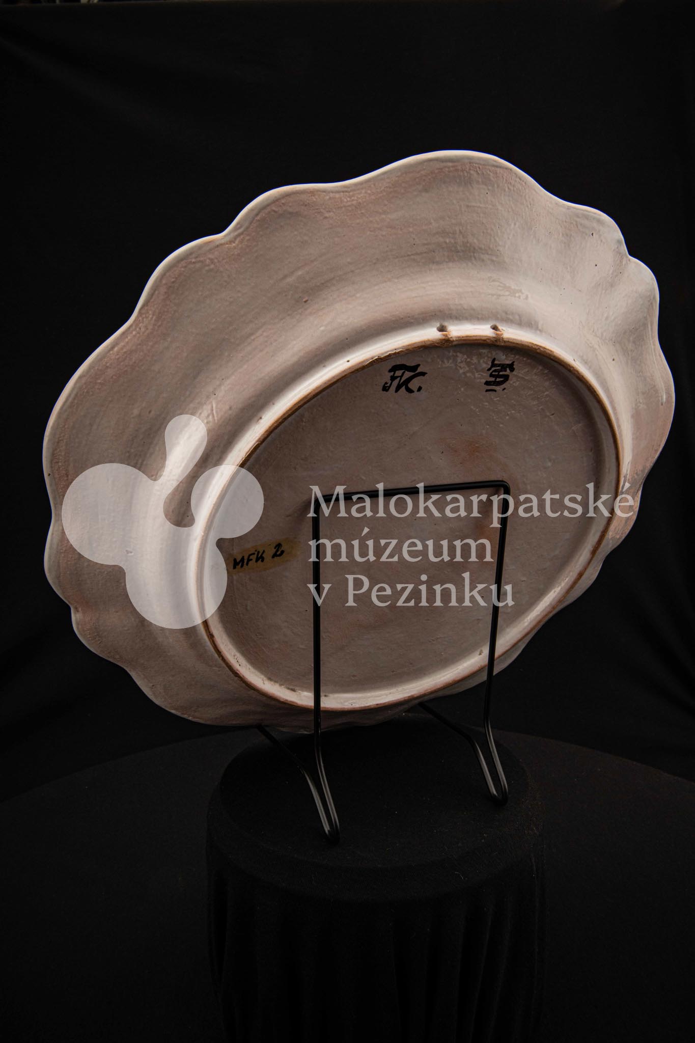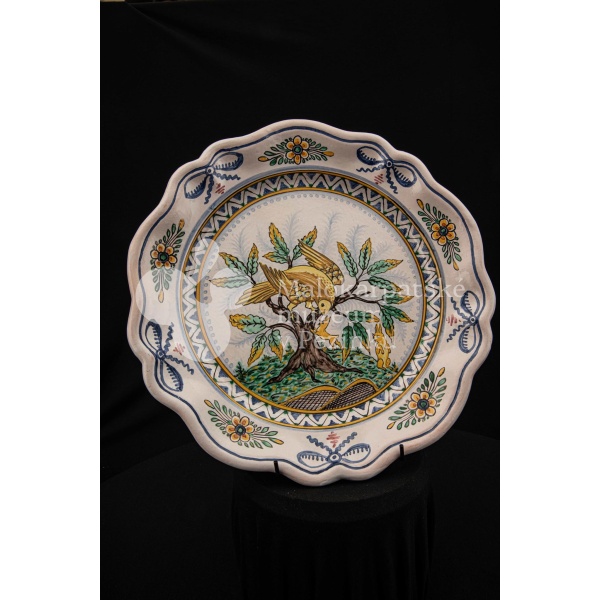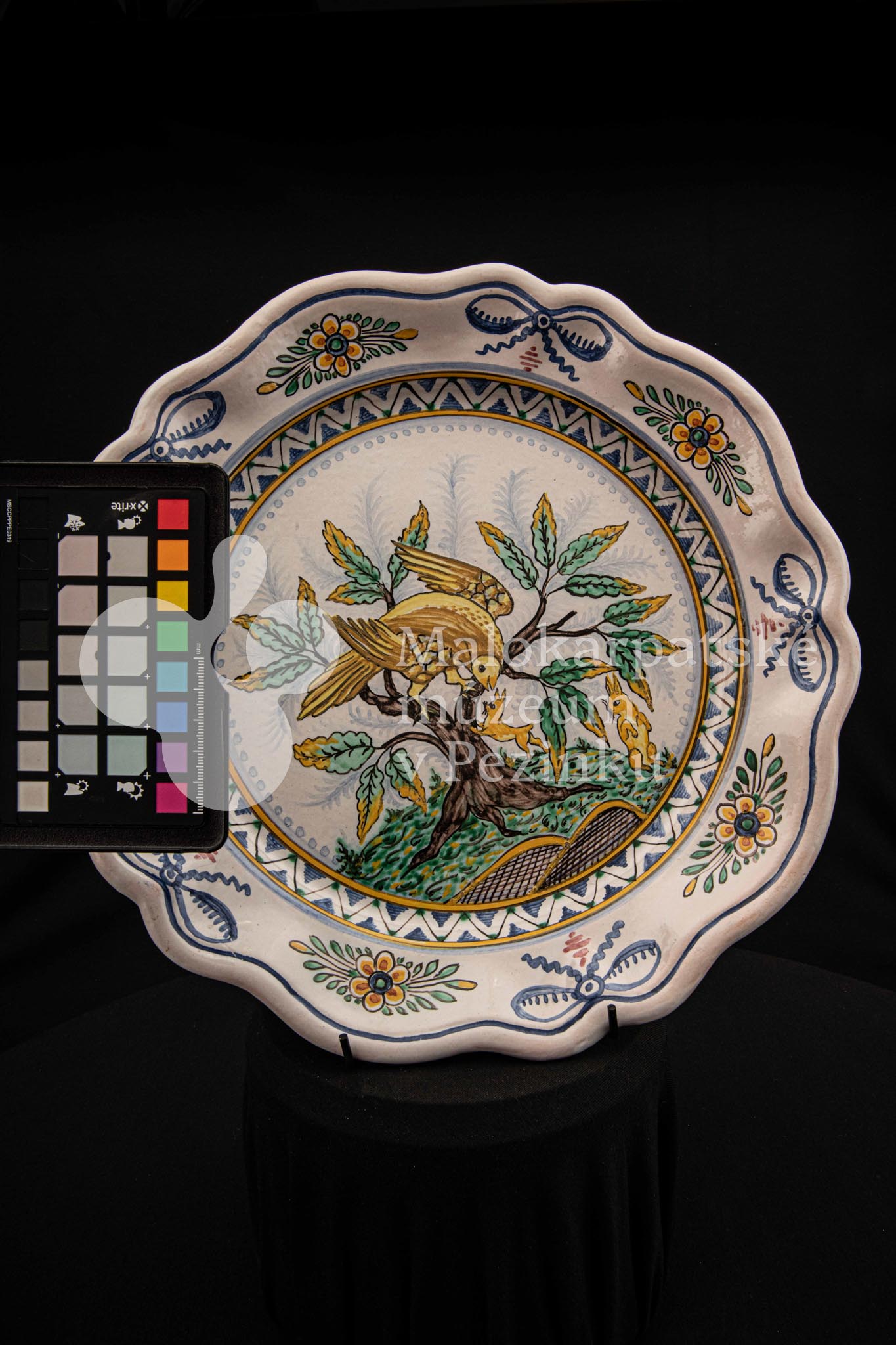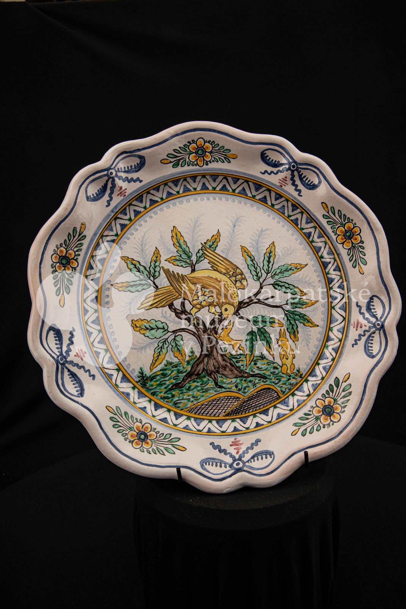 Tanier fajansový s prelamovaným okrajom. Bielo glazovaný, rôznofarebný vysokožiarový dekor, v strede zobrazujúci orla poľujúceho na zajaca. Na dne značený FK.ST.