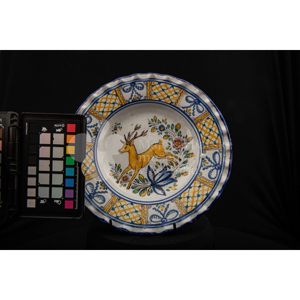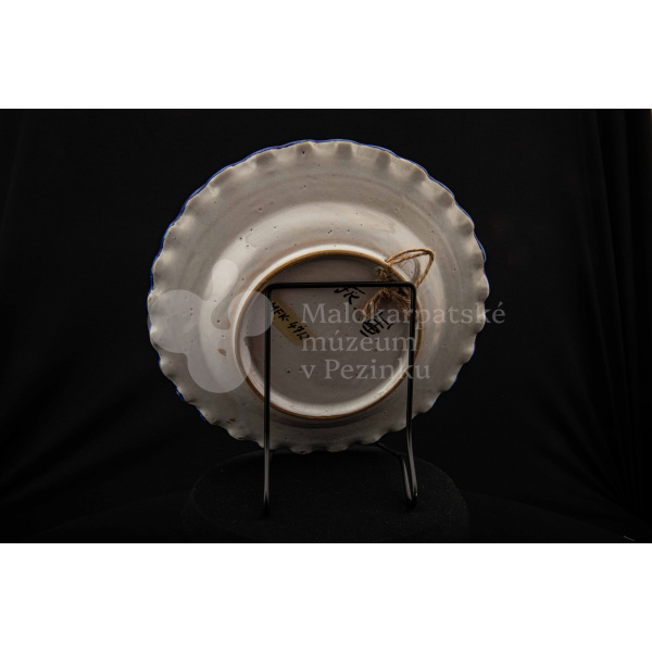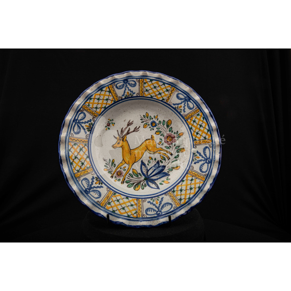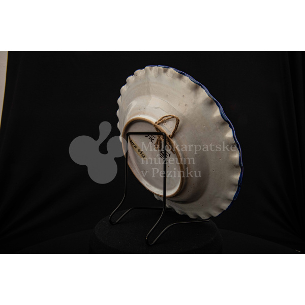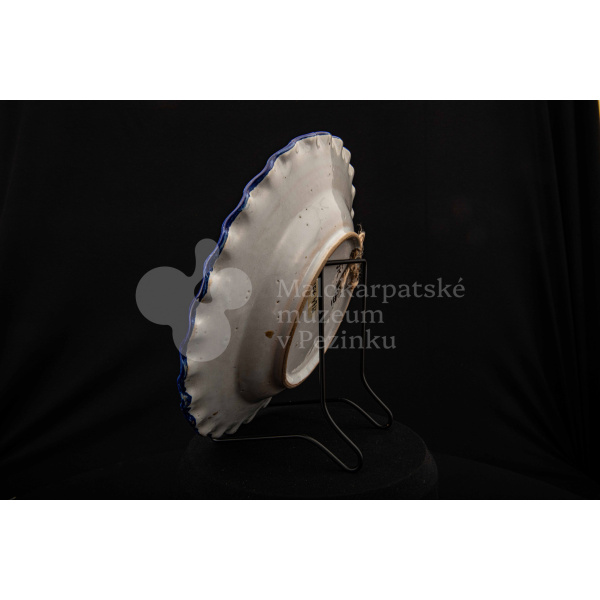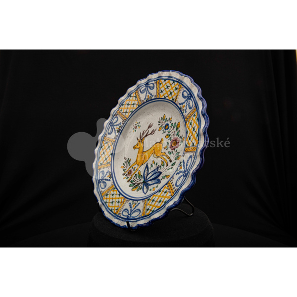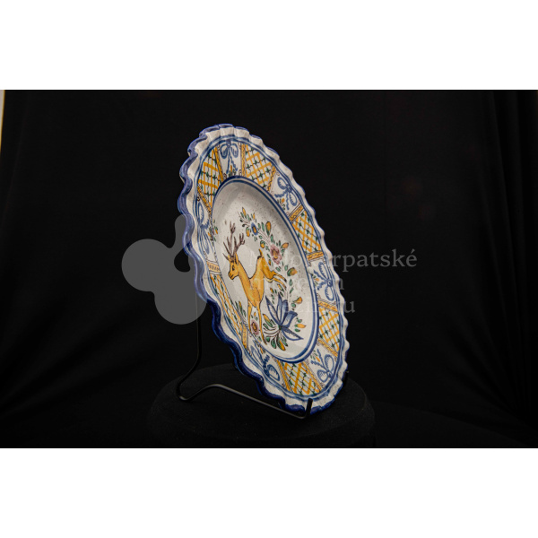 Tanier fajansový s vlnovým okrajom sýtomodrej farby. Vysokožiarový dekor s motívom skáčuceho jeleňa. Po celej ploche bieloglazovaný. Kvetinový dekor pestrých farieb s výrazným modrým tulipánom. Na dne je značenie FK.ST.