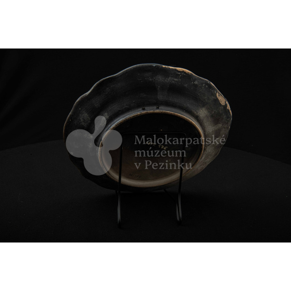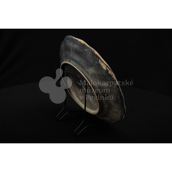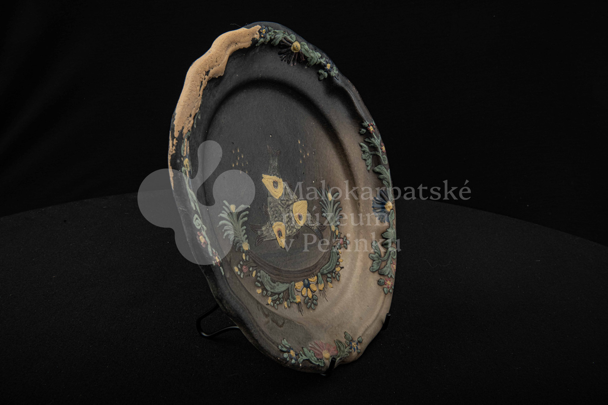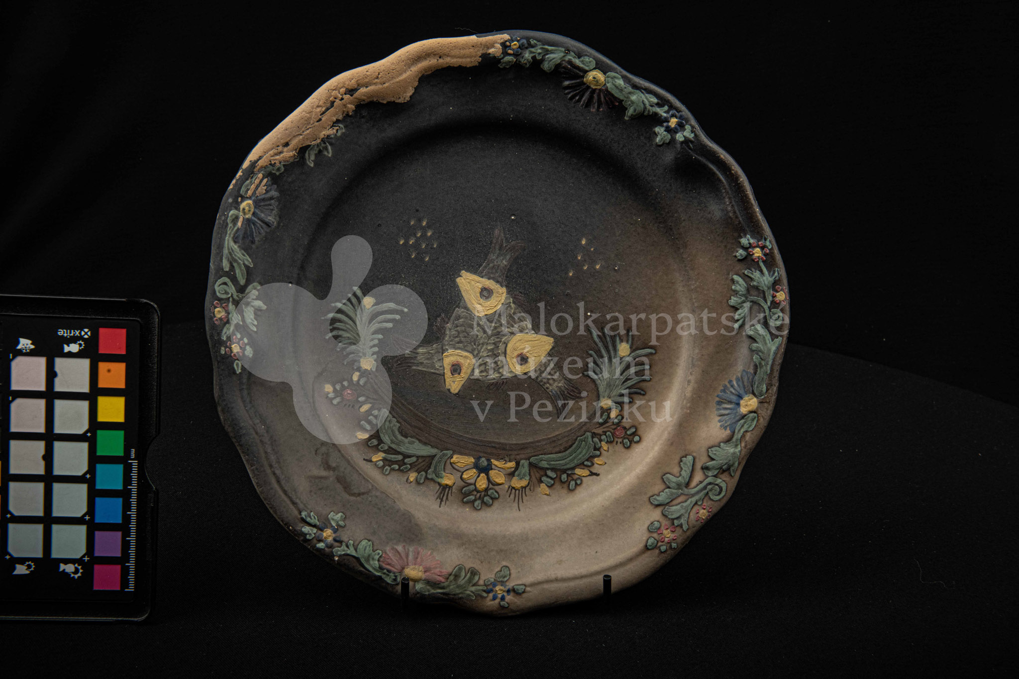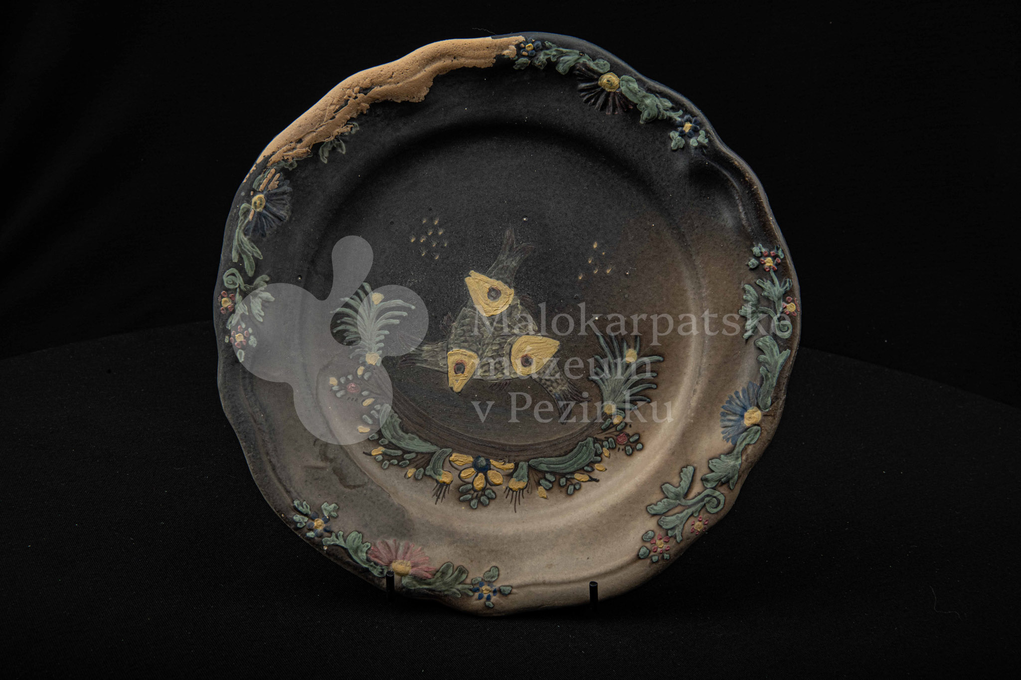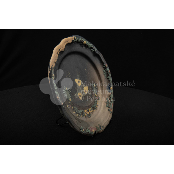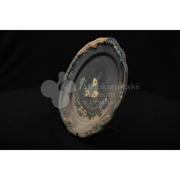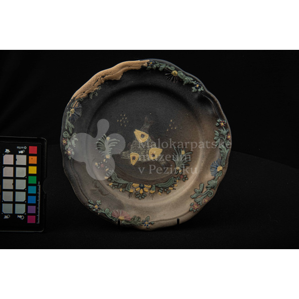Tanier keramický – zadymený, v strede sú namaľované tri prekrížené rybky s kvetinovým dekorom. Okraj je slabo prelamovaný s plastickým kvetinovým dekorom. Poškodený povrch. Bez značenia.