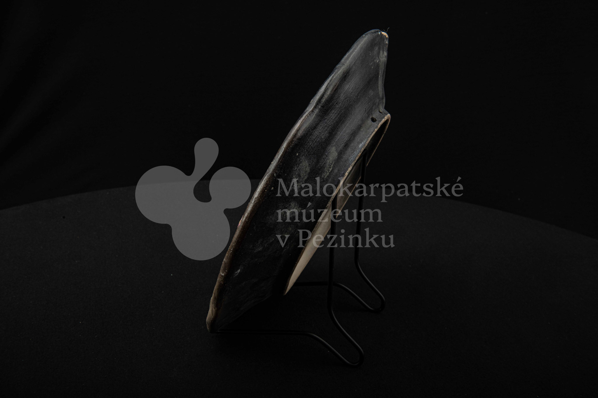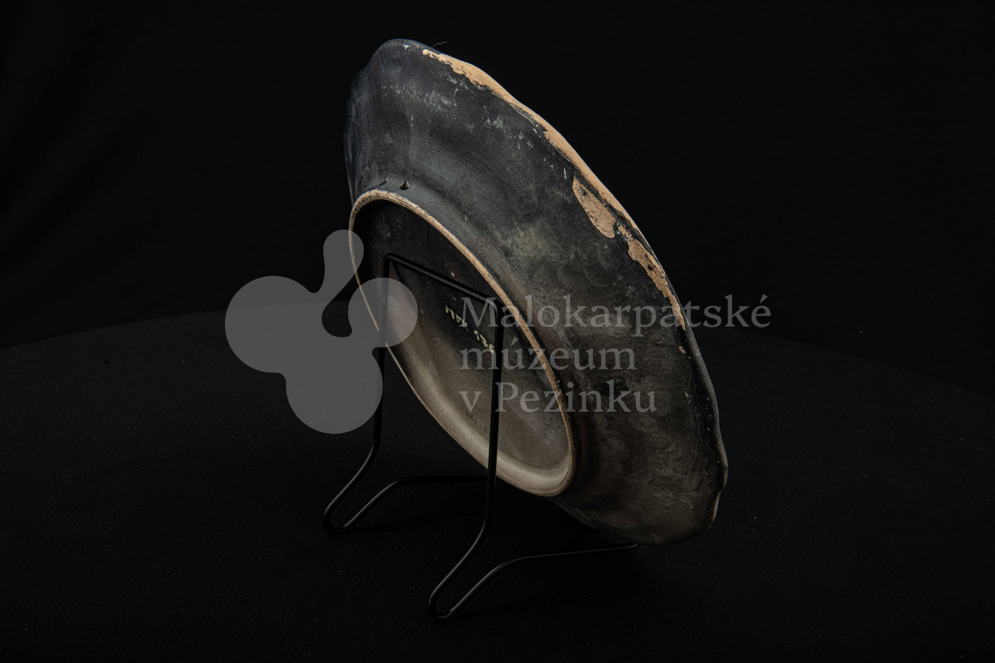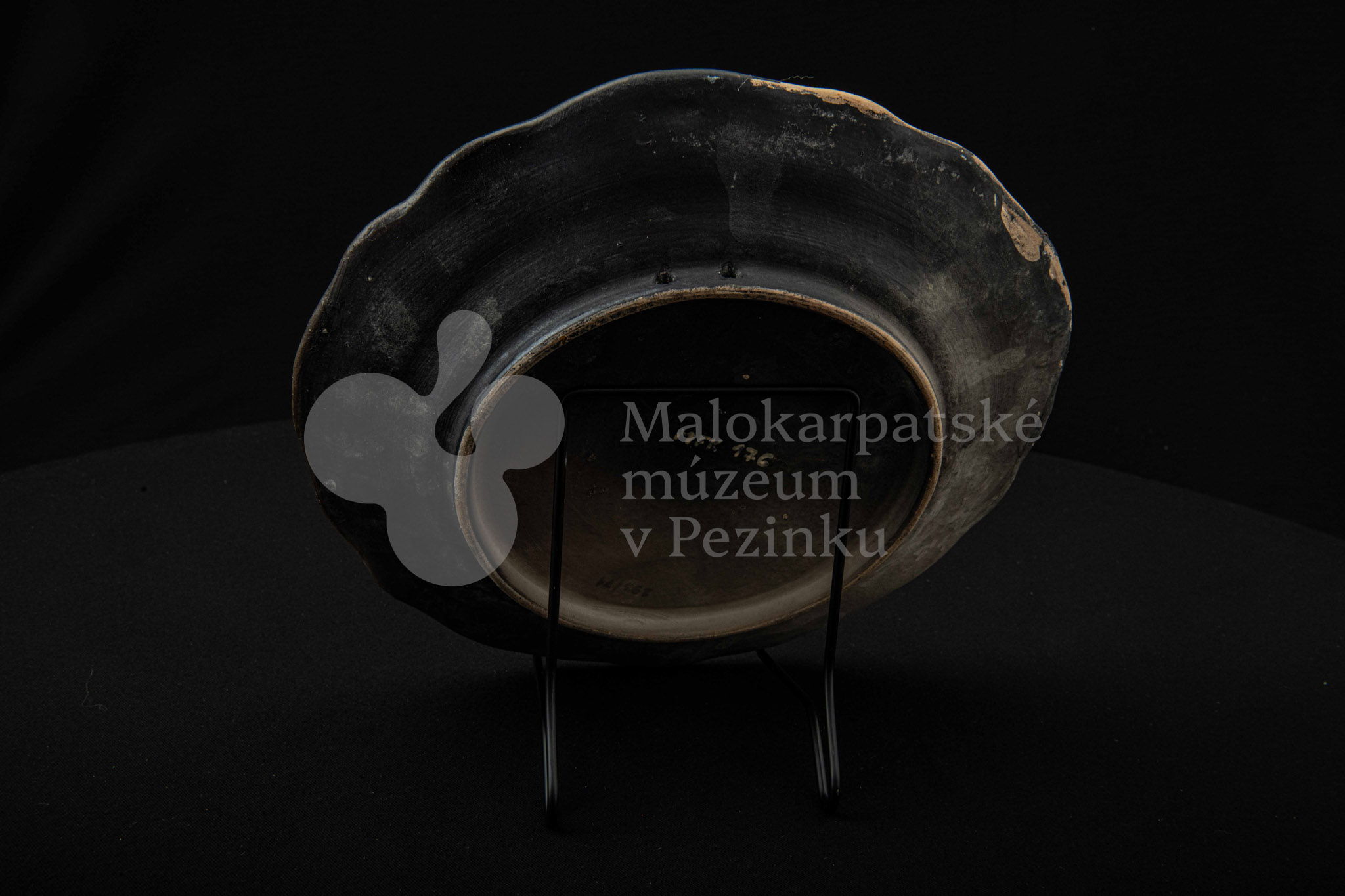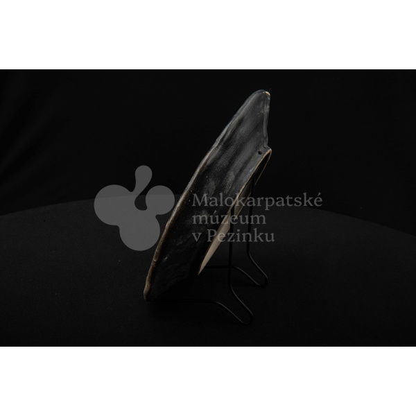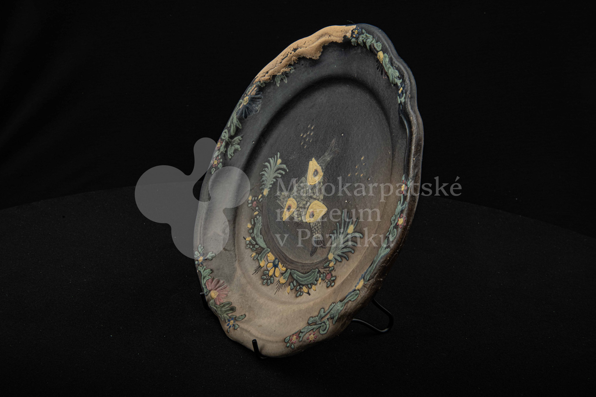 Tanier keramický – zadymený, v strede sú namaľované tri prekrížené rybky s kvetinovým dekorom. Okraj je slabo prelamovaný s plastickým kvetinovým dekorom. Poškodený povrch. Bez značenia.