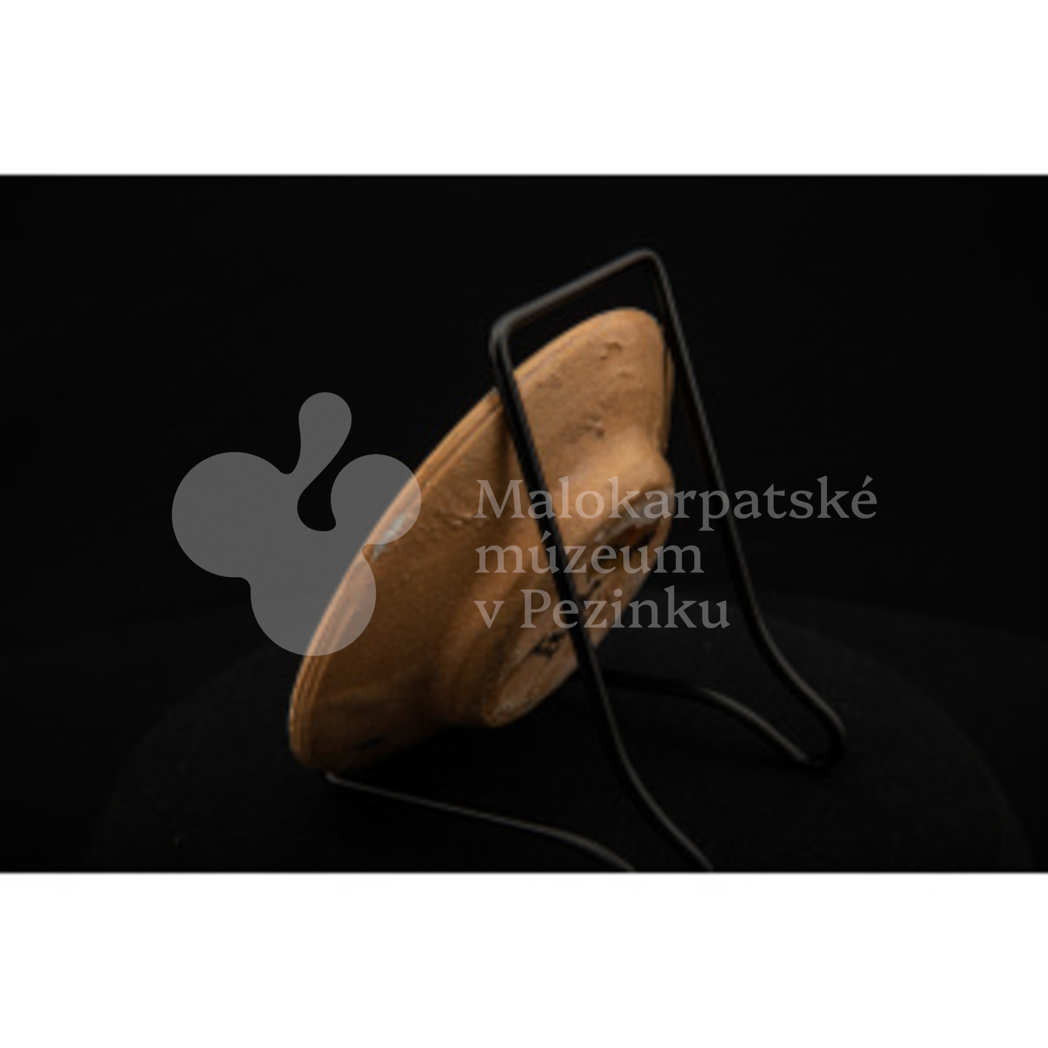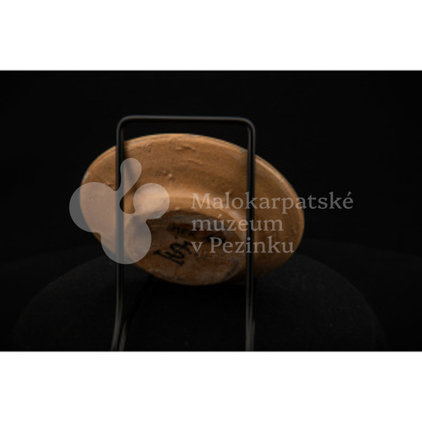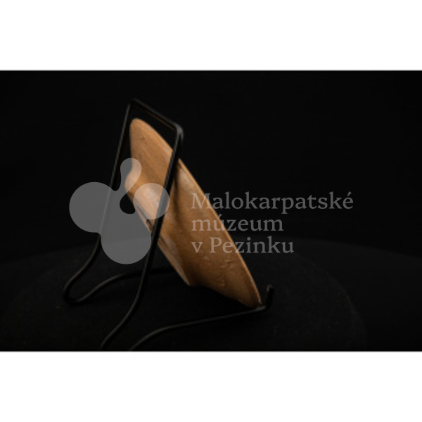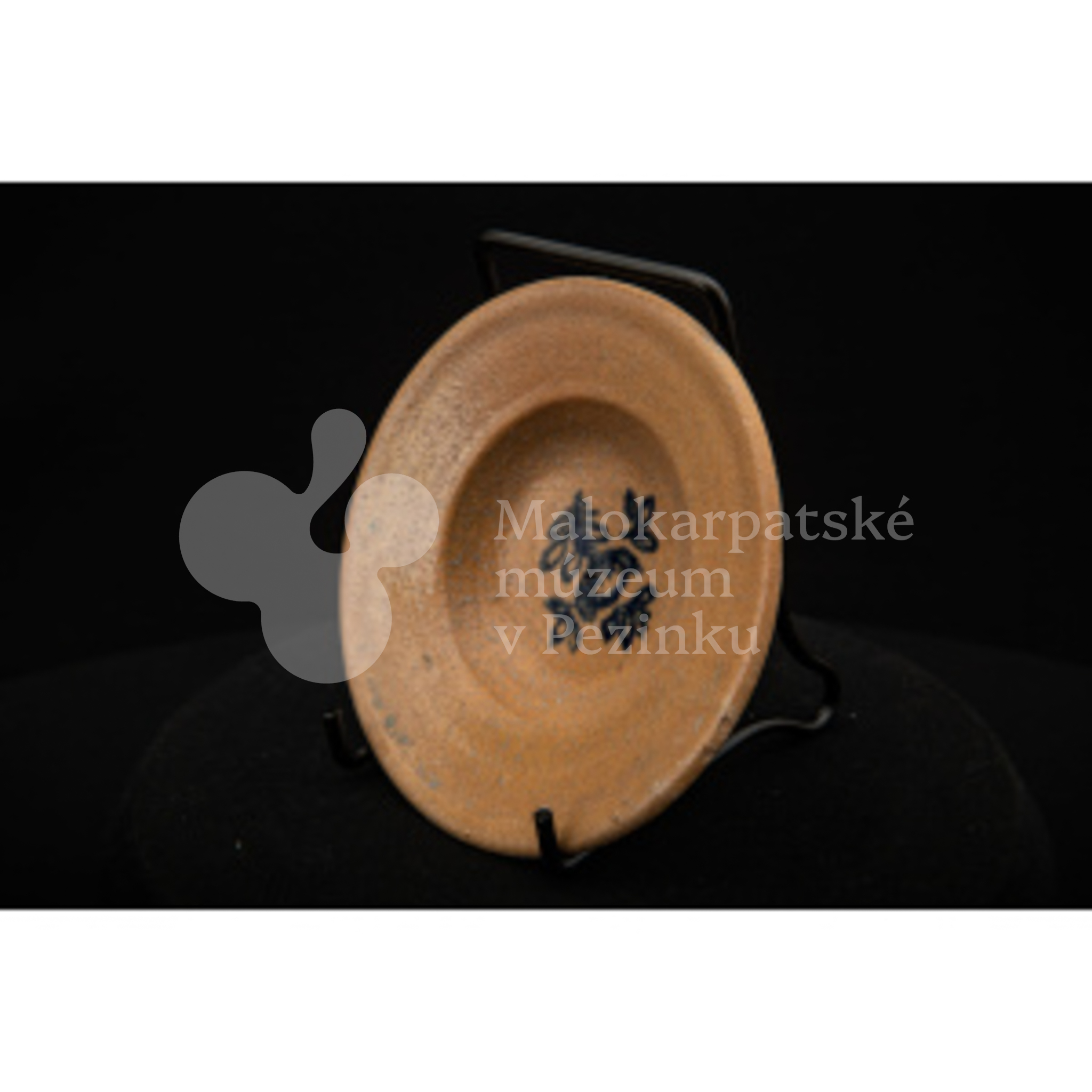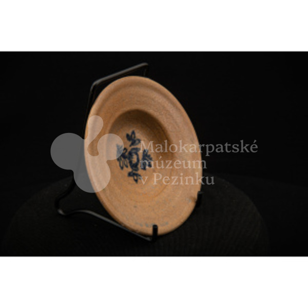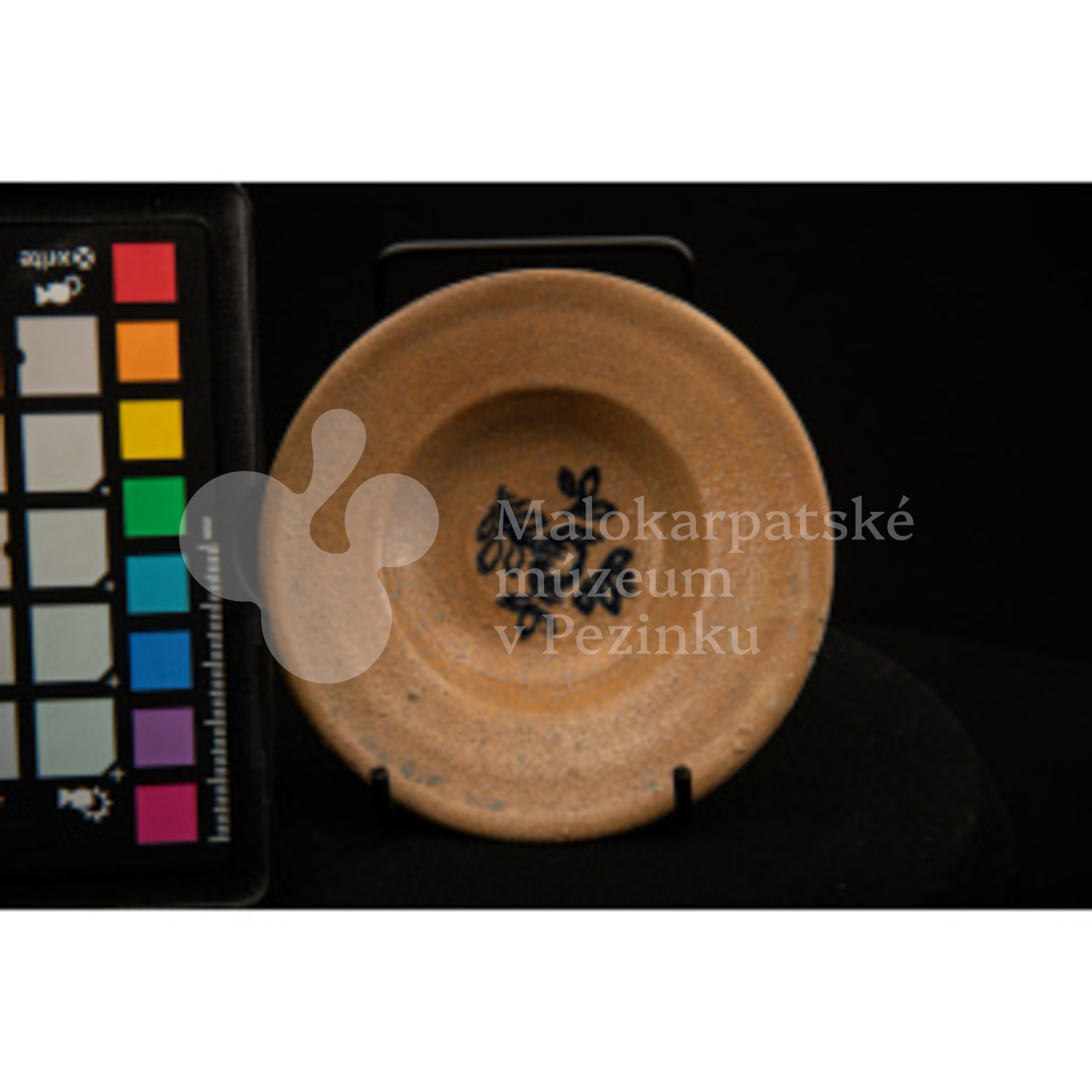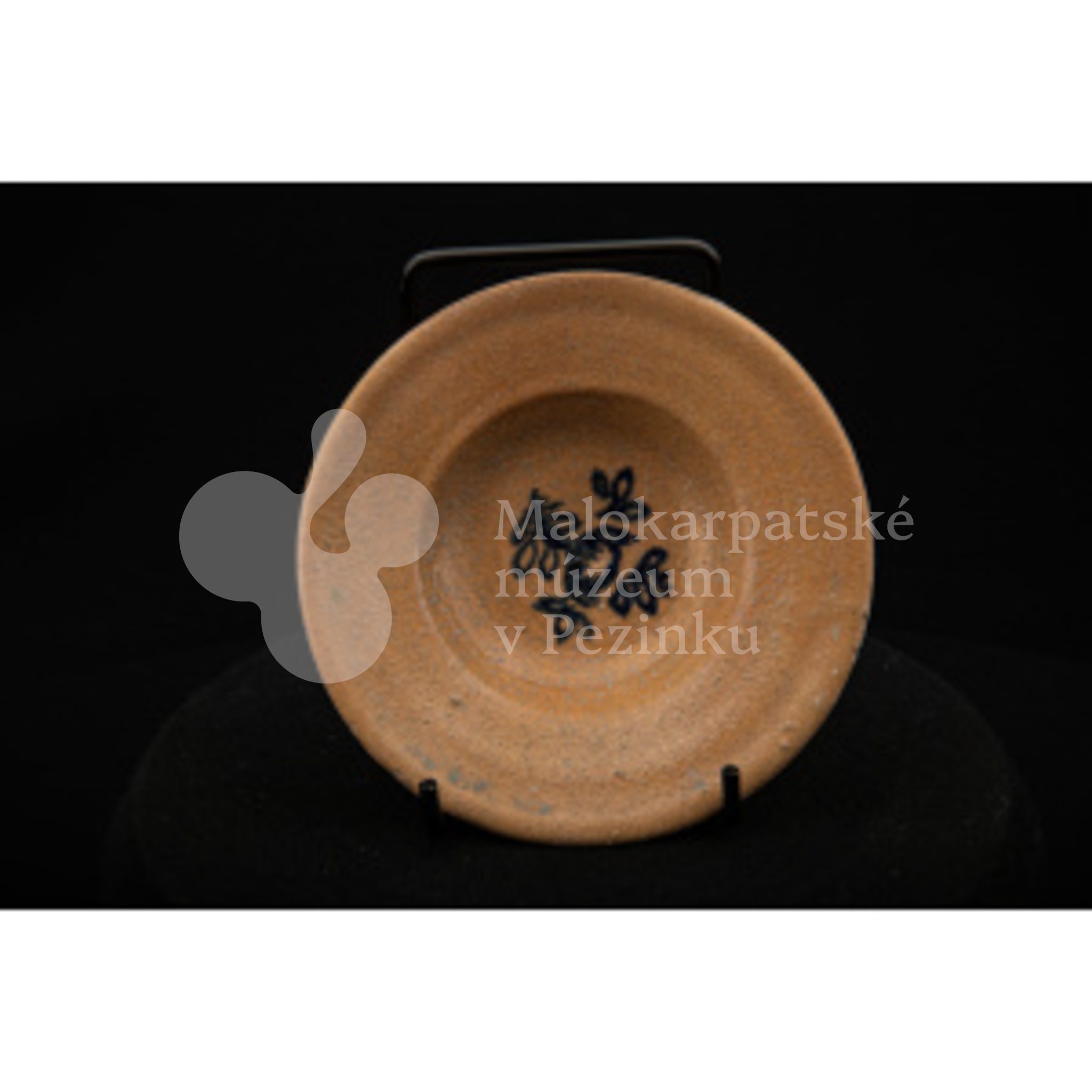 Dva tanieriky malé – fajansové, hlbšie, okraj rovný, dekor farby bordovej, zelenej a modrej. Bez značenia.