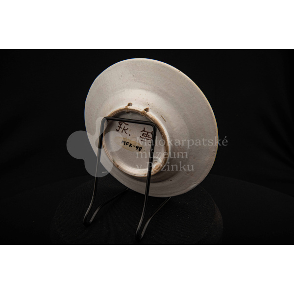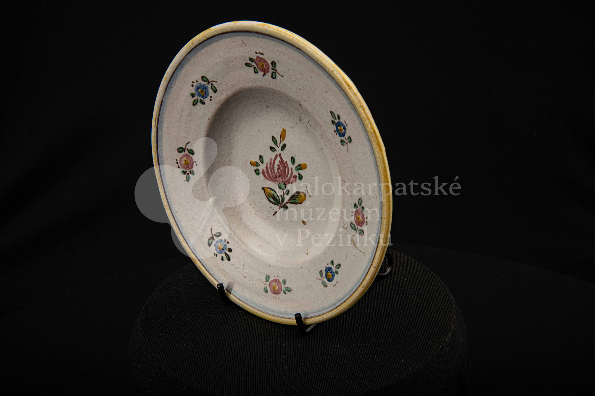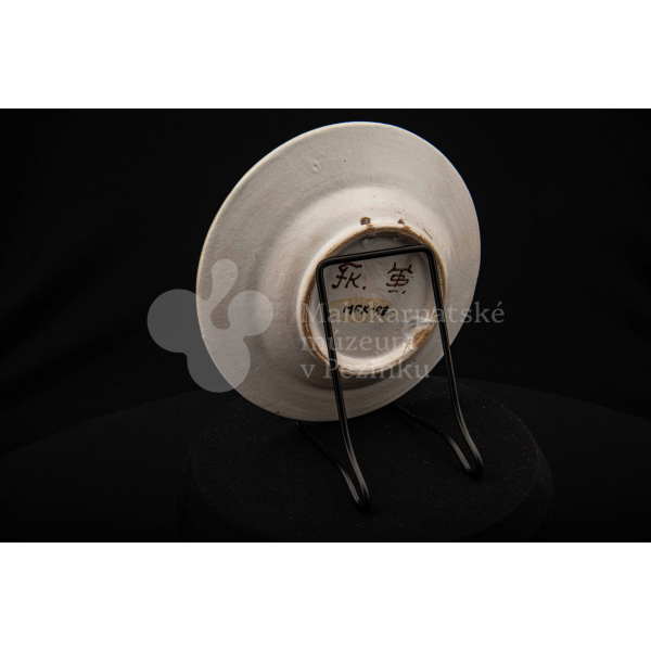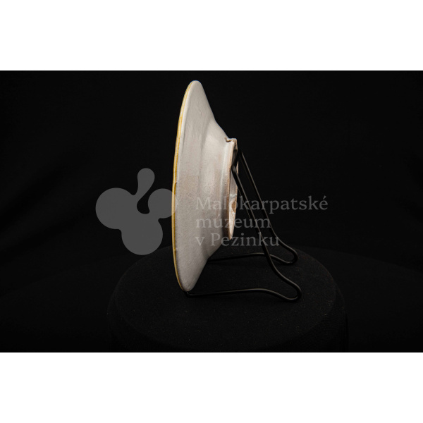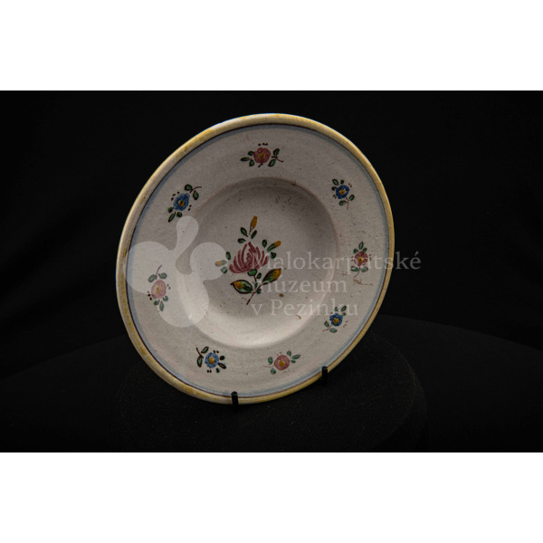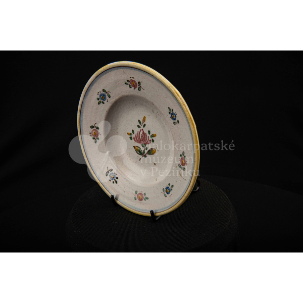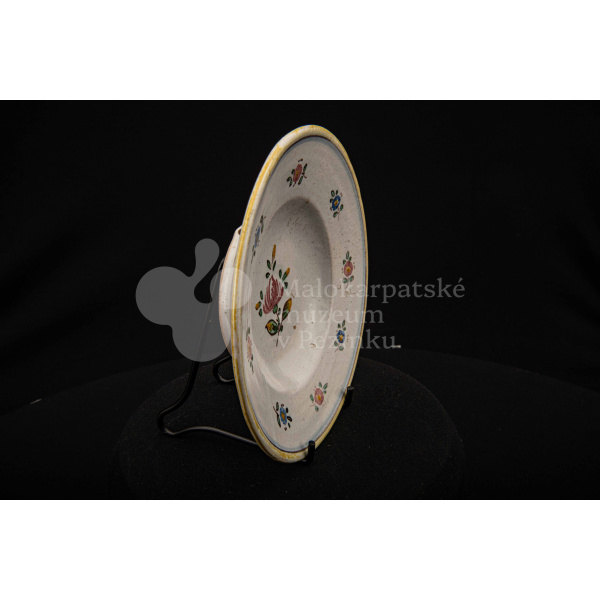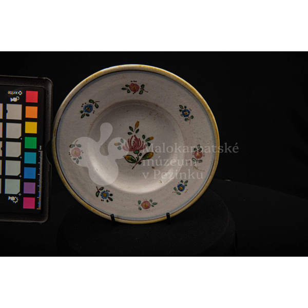 Tanierik fajansový – hlbší, so žltým rovným okrajom. Po celej ploche bielo glazovaný s kvetinovým dekorom v červenej, modrej, zelenej a žltej farbe. Na dne značený FK.ST.