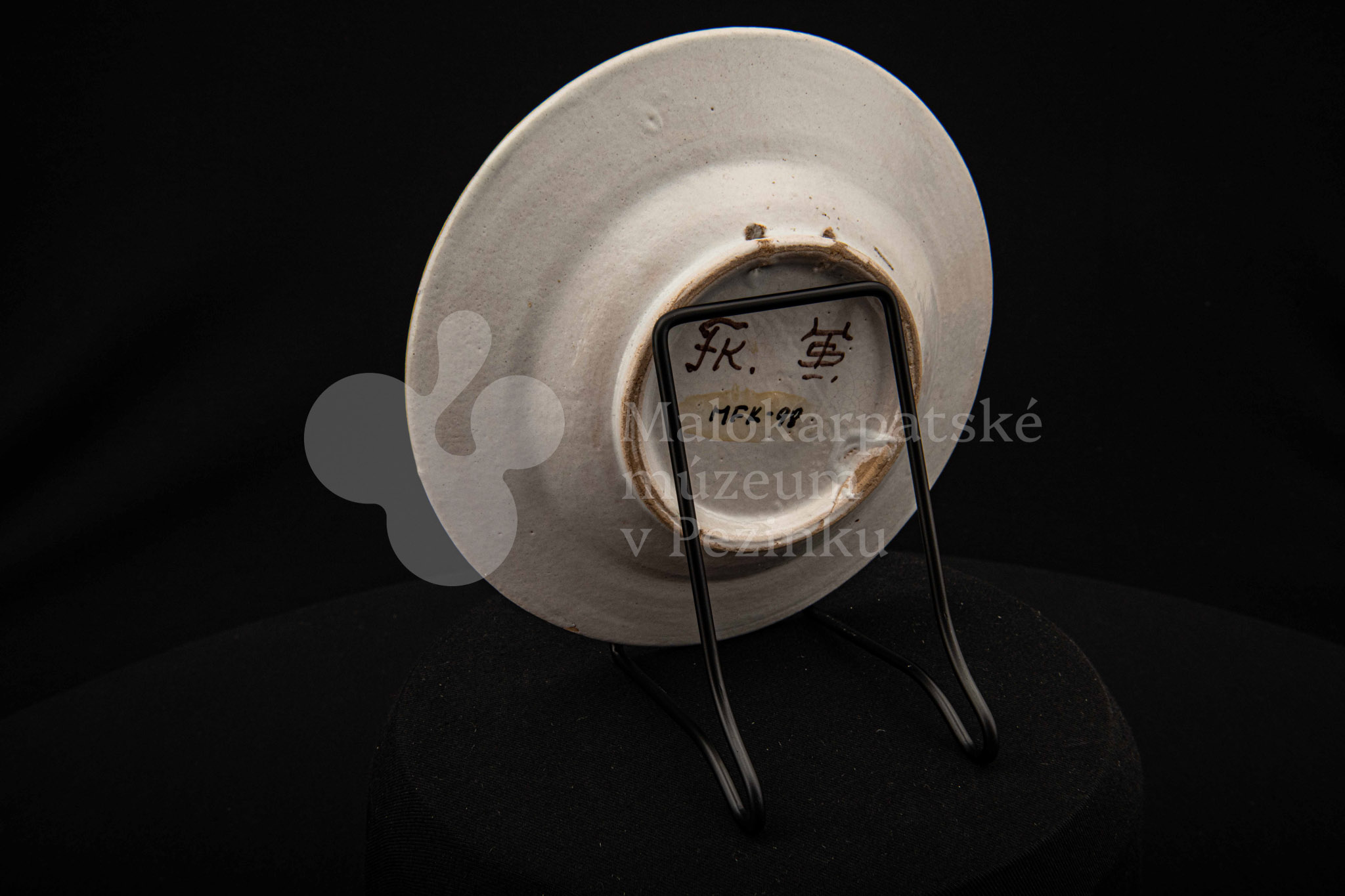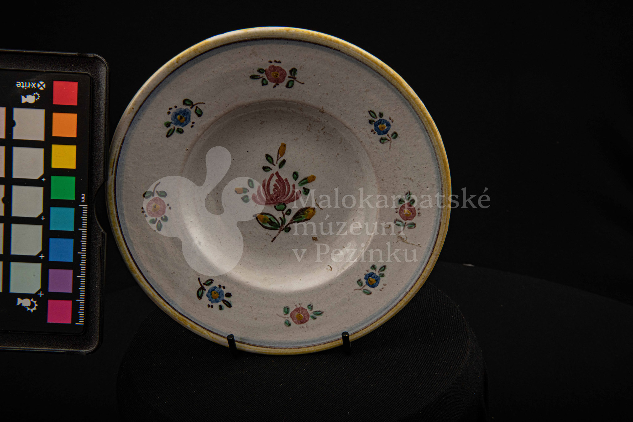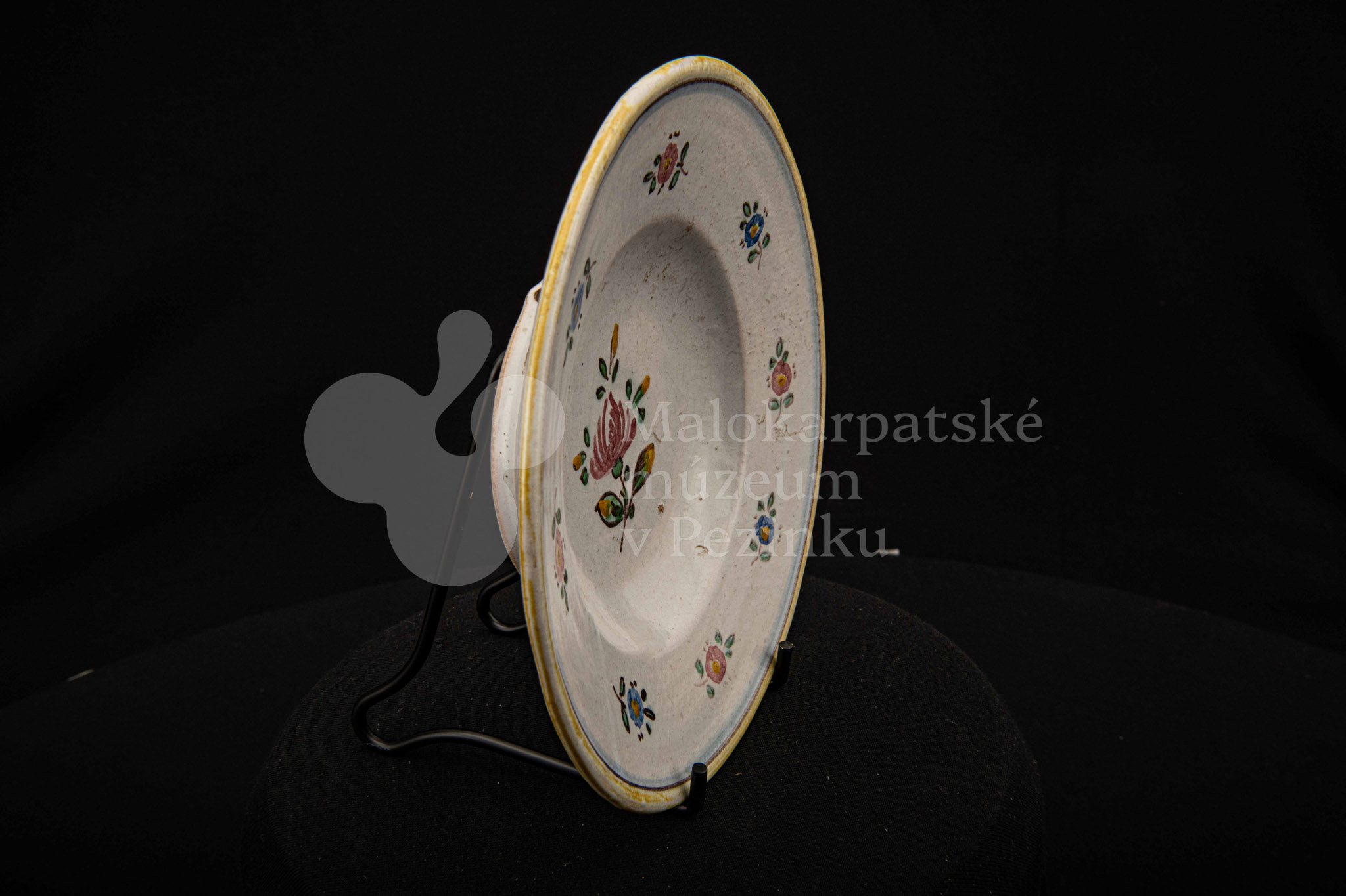 Tanierik fajansový – hlbší, so žltým rovným okrajom. Po celej ploche bielo glazovaný s kvetinovým dekorom v červenej, modrej, zelenej a žltej farbe. Na dne značený FK.ST.