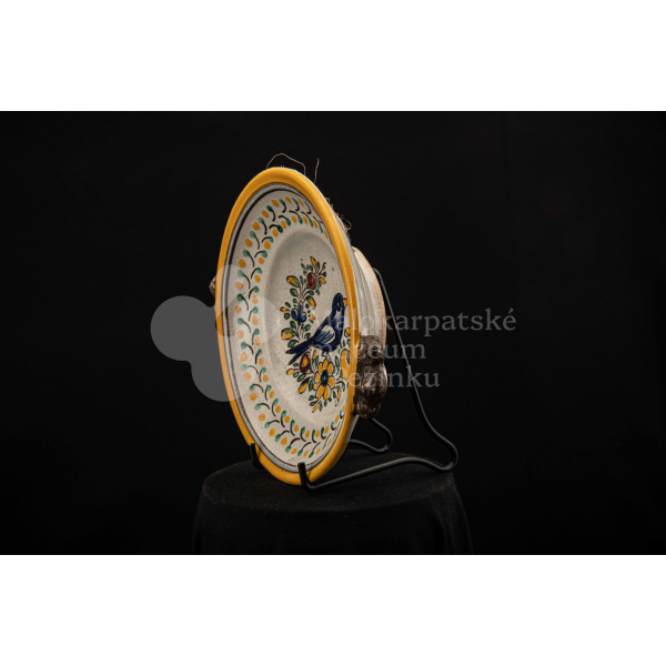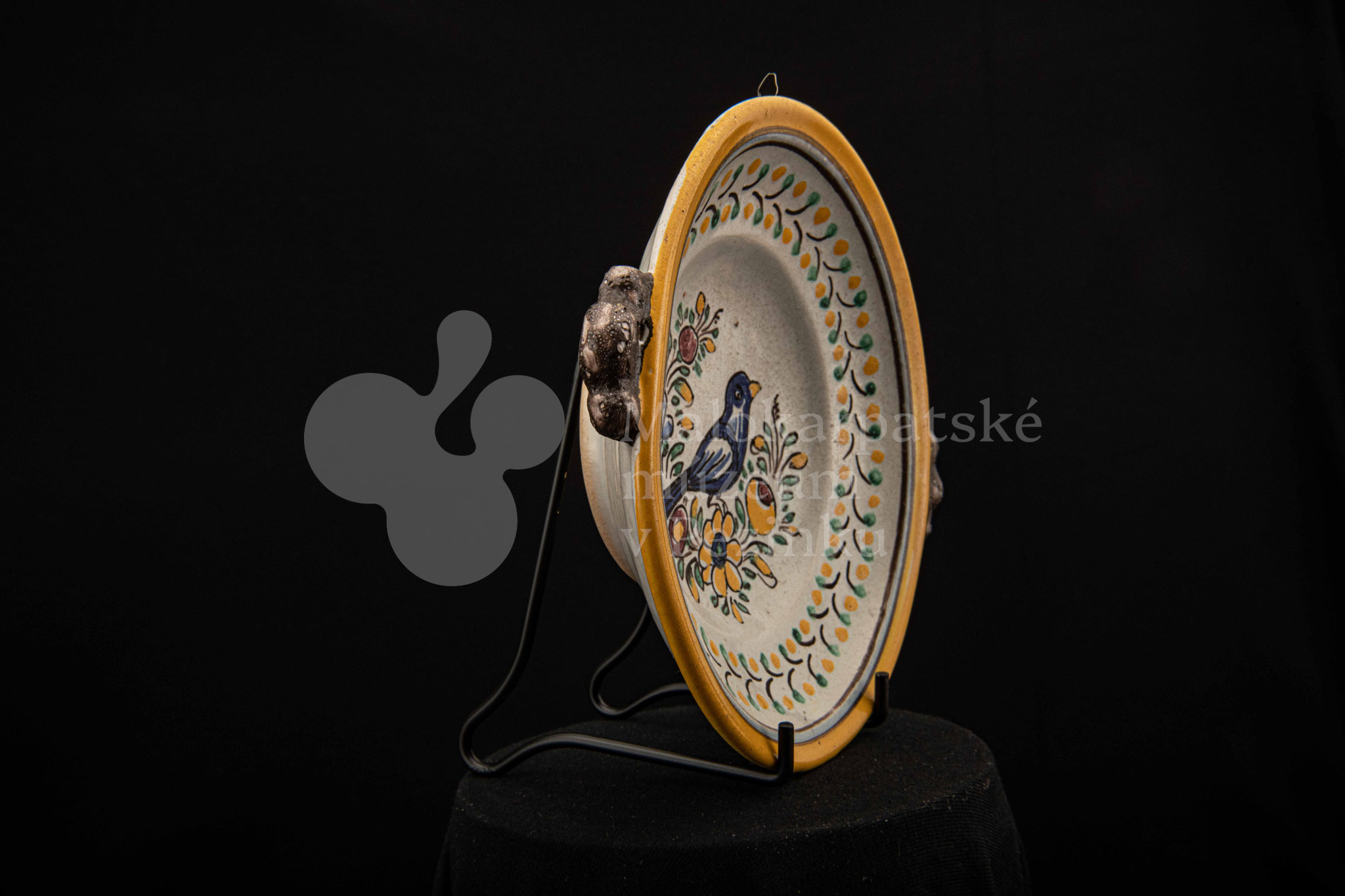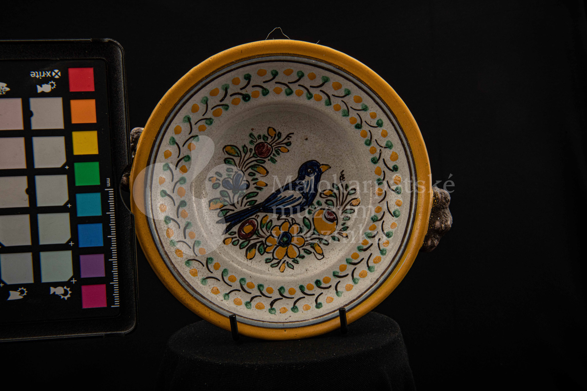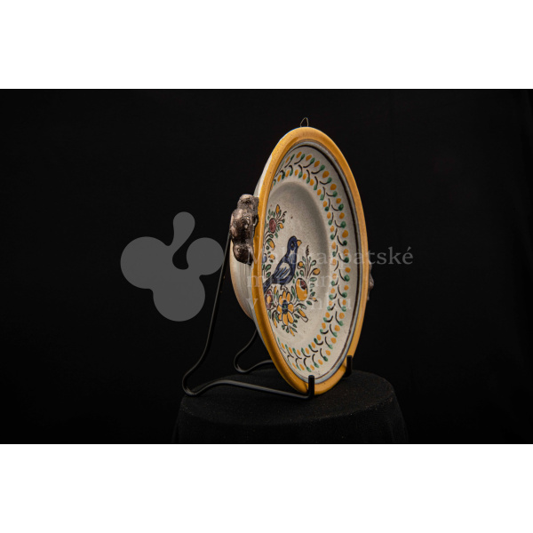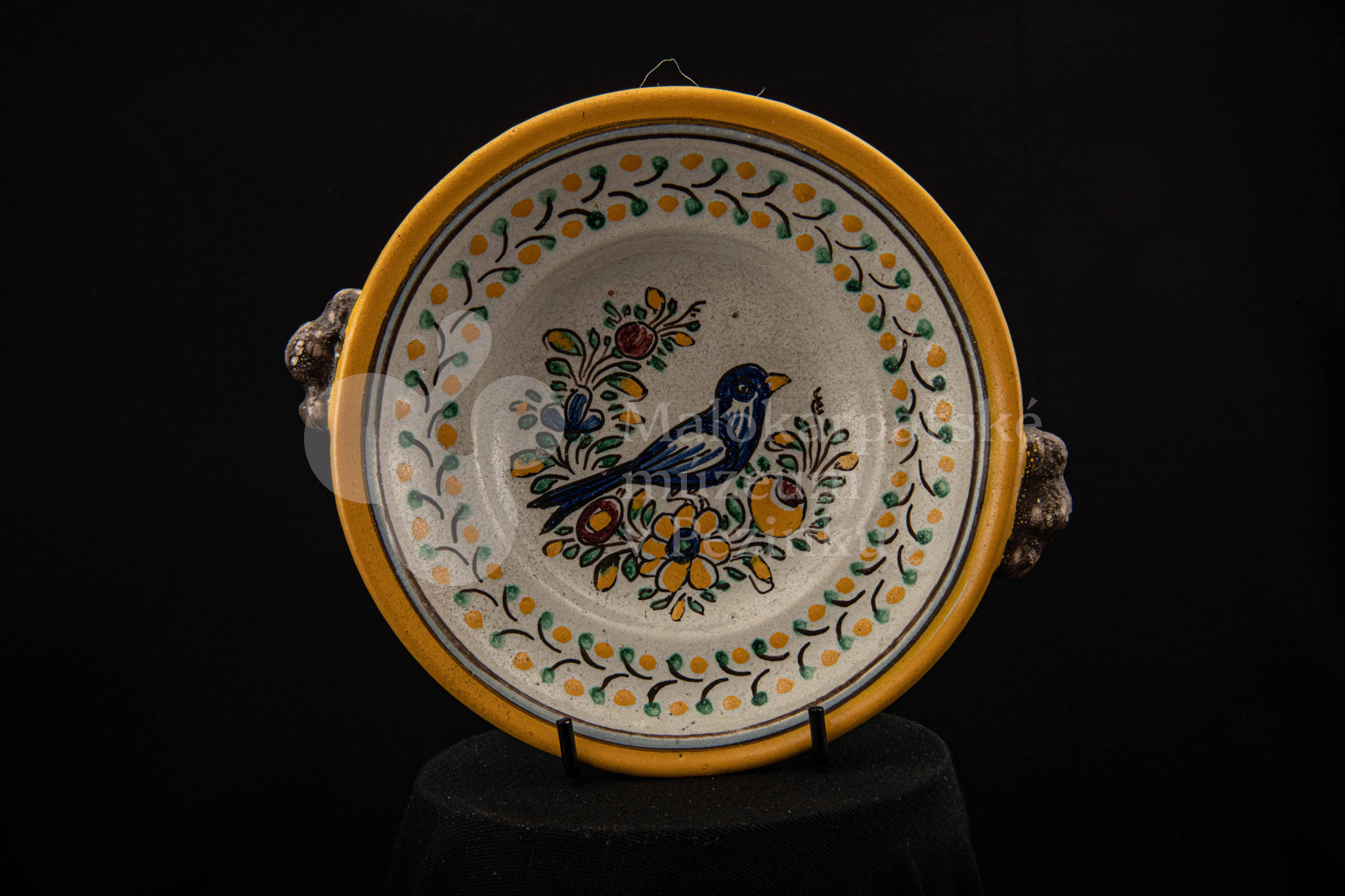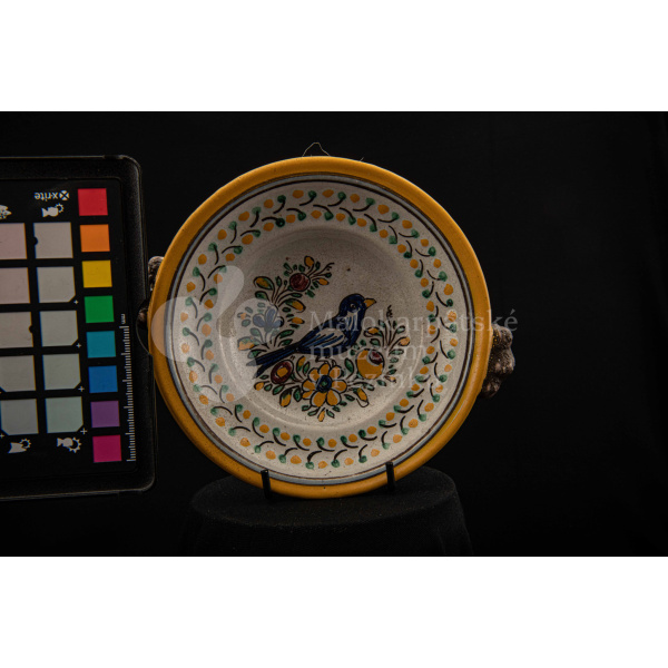 Tanierik fajansový s dvoma ozdobnými uškami mangánovej farby. V strede je maľovaný modrý vtáčik s kvetinovým dekorom pestrých farieb. Žltý rovný okraj zdobený zelenými a žltými bobuľkami. Na dne značený FK.ST.