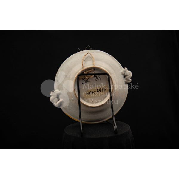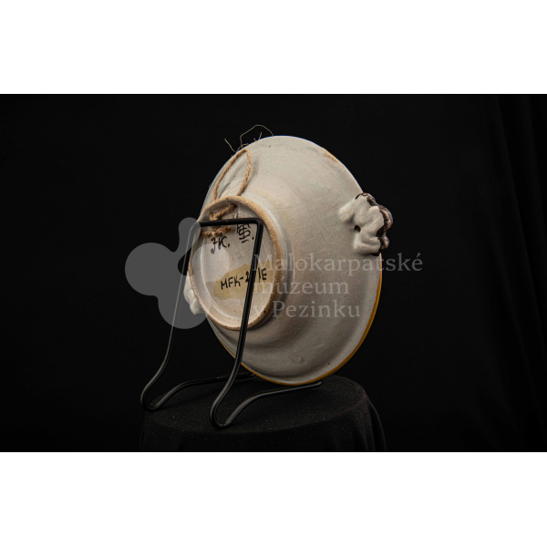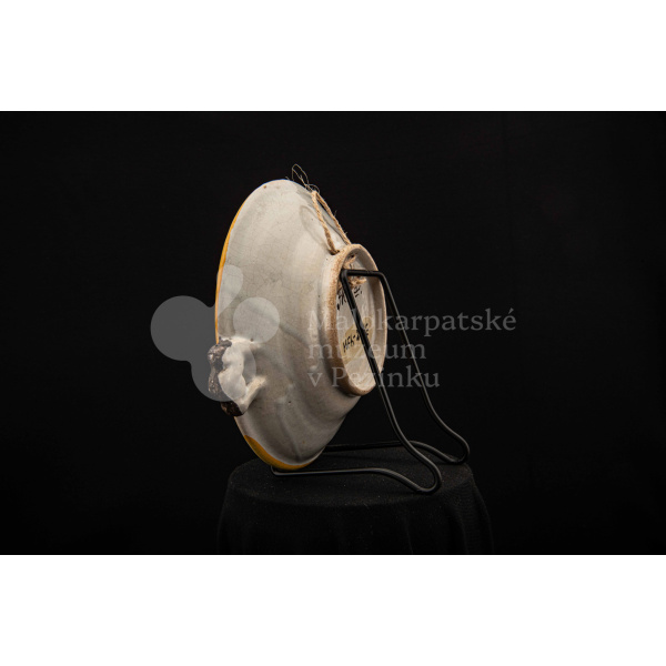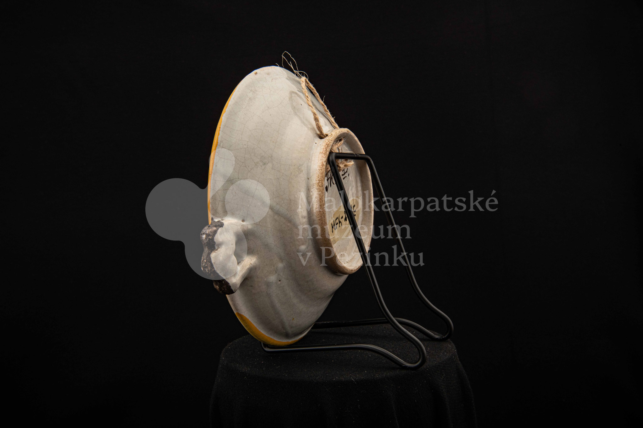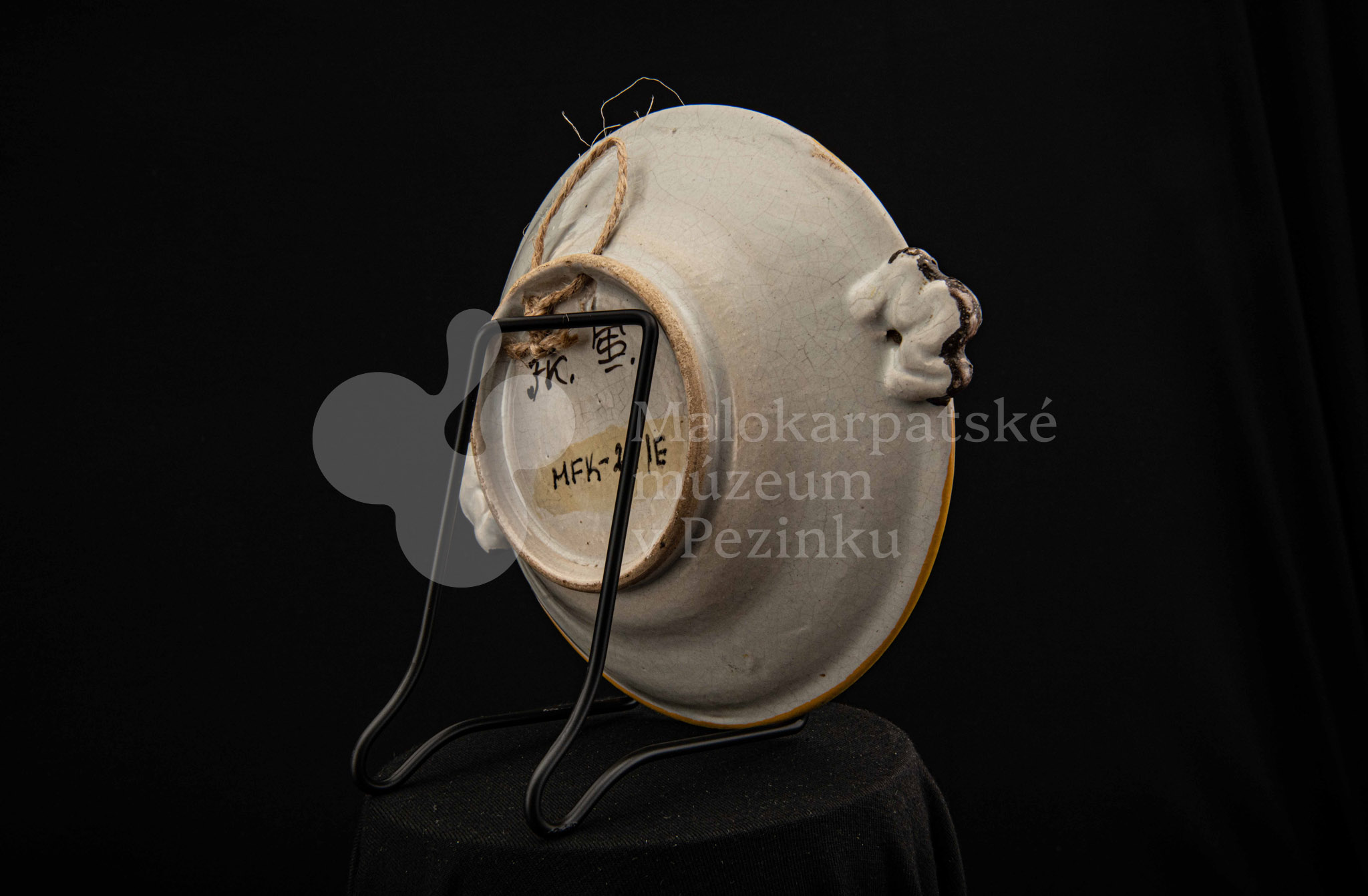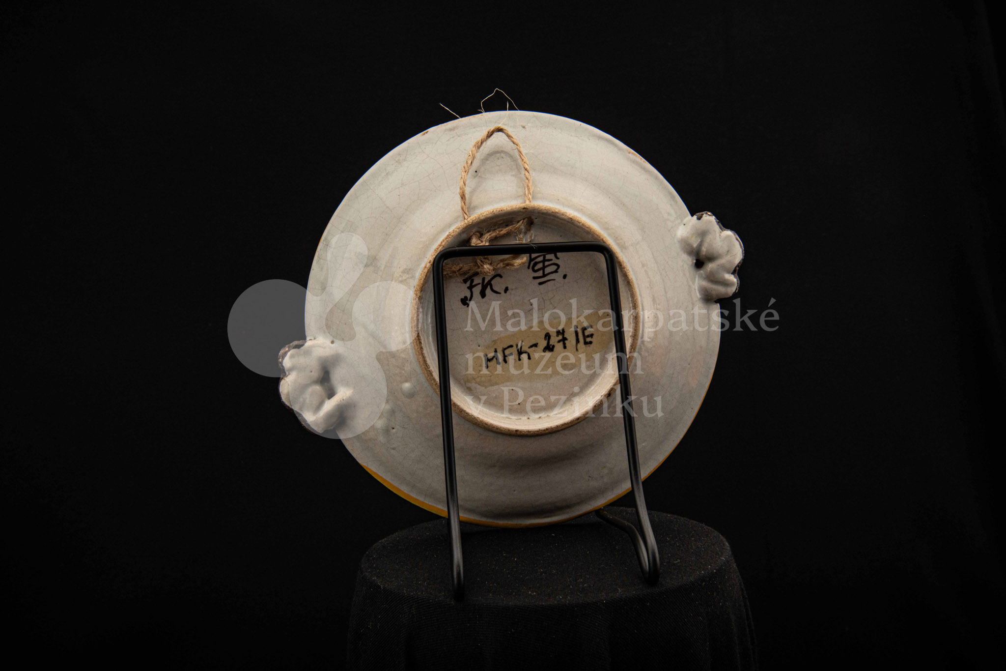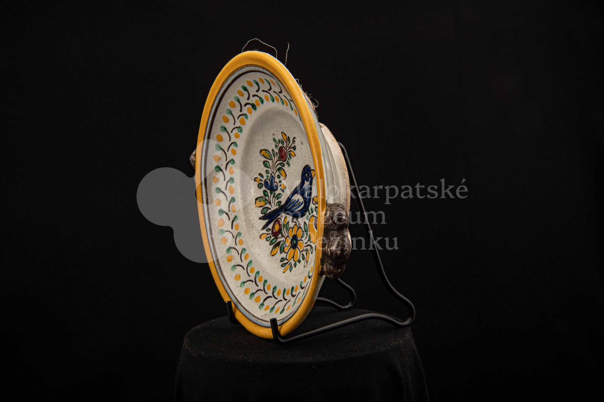 Tanierik fajansový s dvoma ozdobnými uškami mangánovej farby. V strede je maľovaný modrý vtáčik s kvetinovým dekorom pestrých farieb. Žltý rovný okraj zdobený zelenými a žltými bobuľkami. Na dne značený FK.ST.