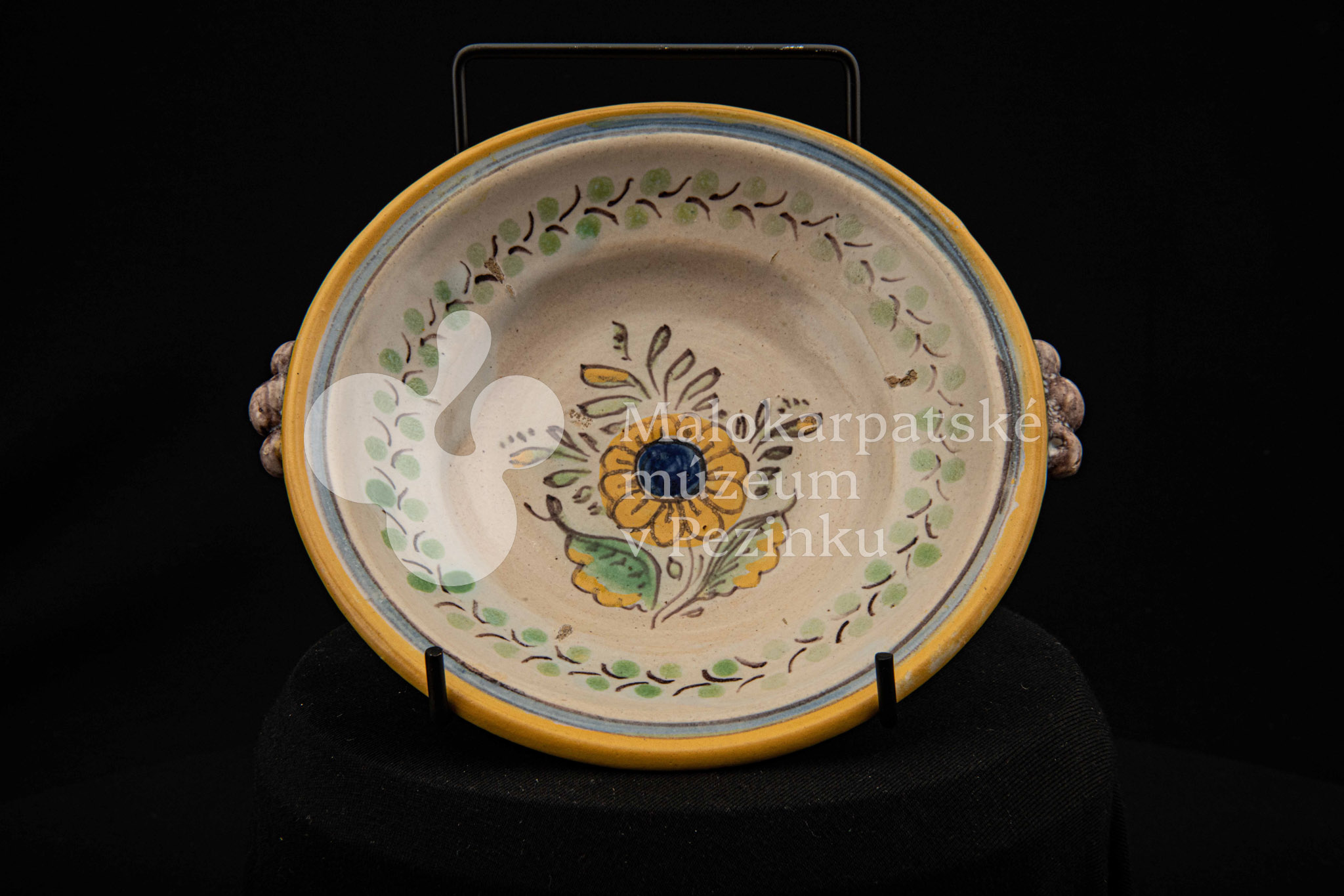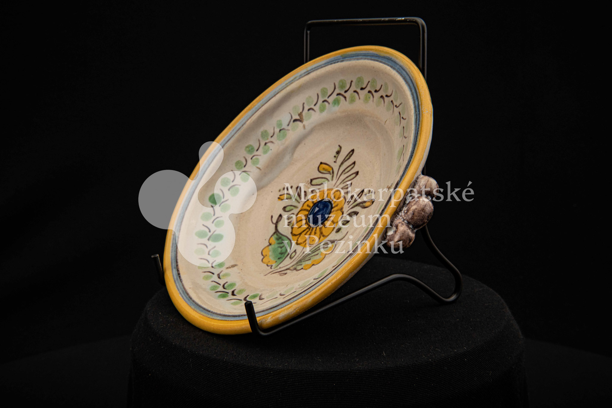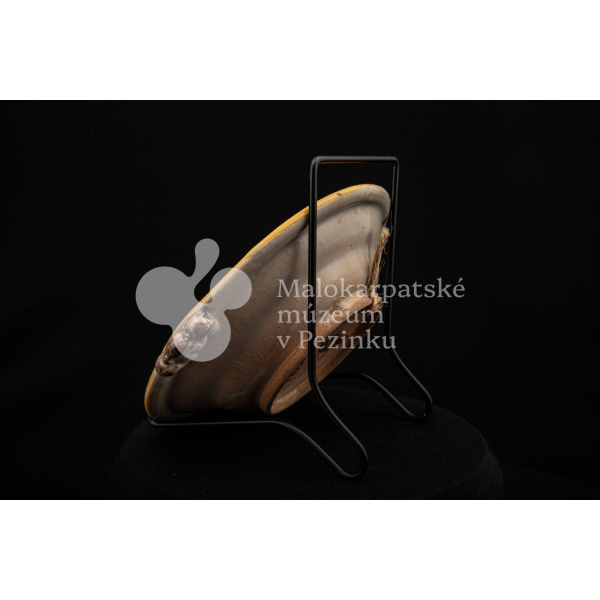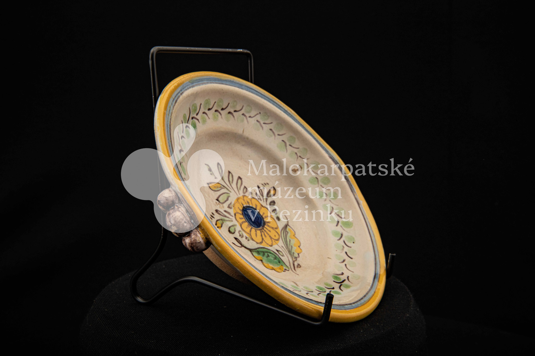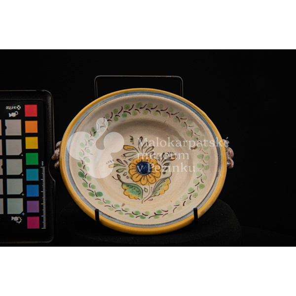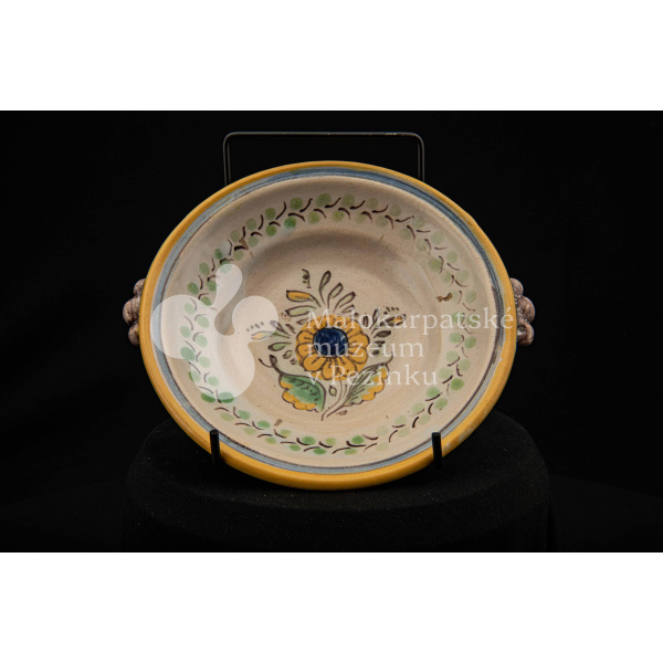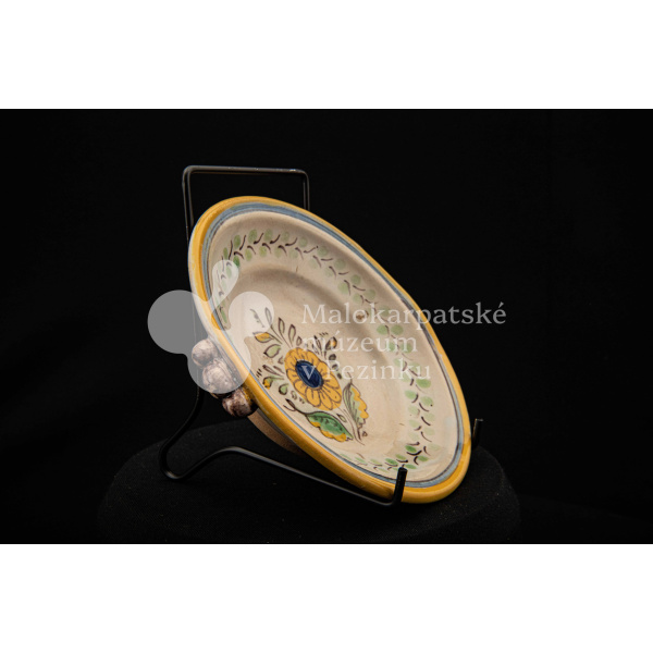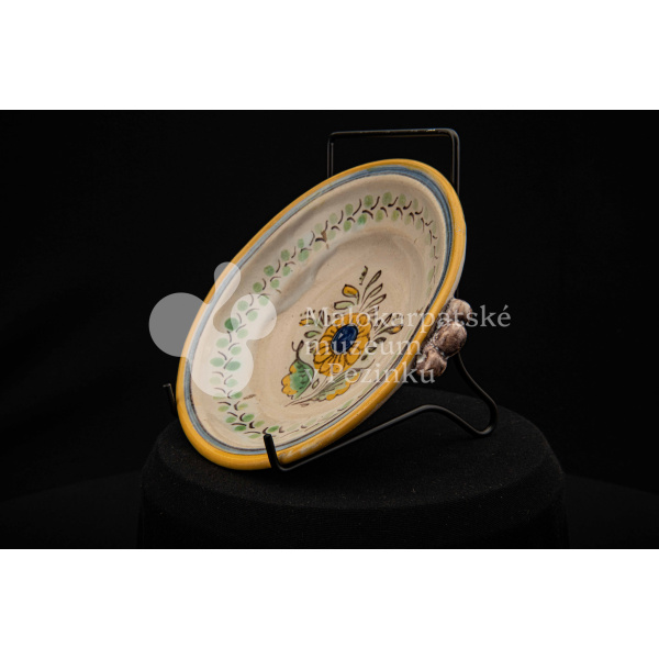 Tanierik fajansový – hlbší, rovný okraj so žltým lemovaním, zdobený zelenými bobuľkami. Má dve ozdobené ušká mangánovej farby. V strede má žlto-modrý kvet so zelenými listami. Na dne značenie FK.ST.