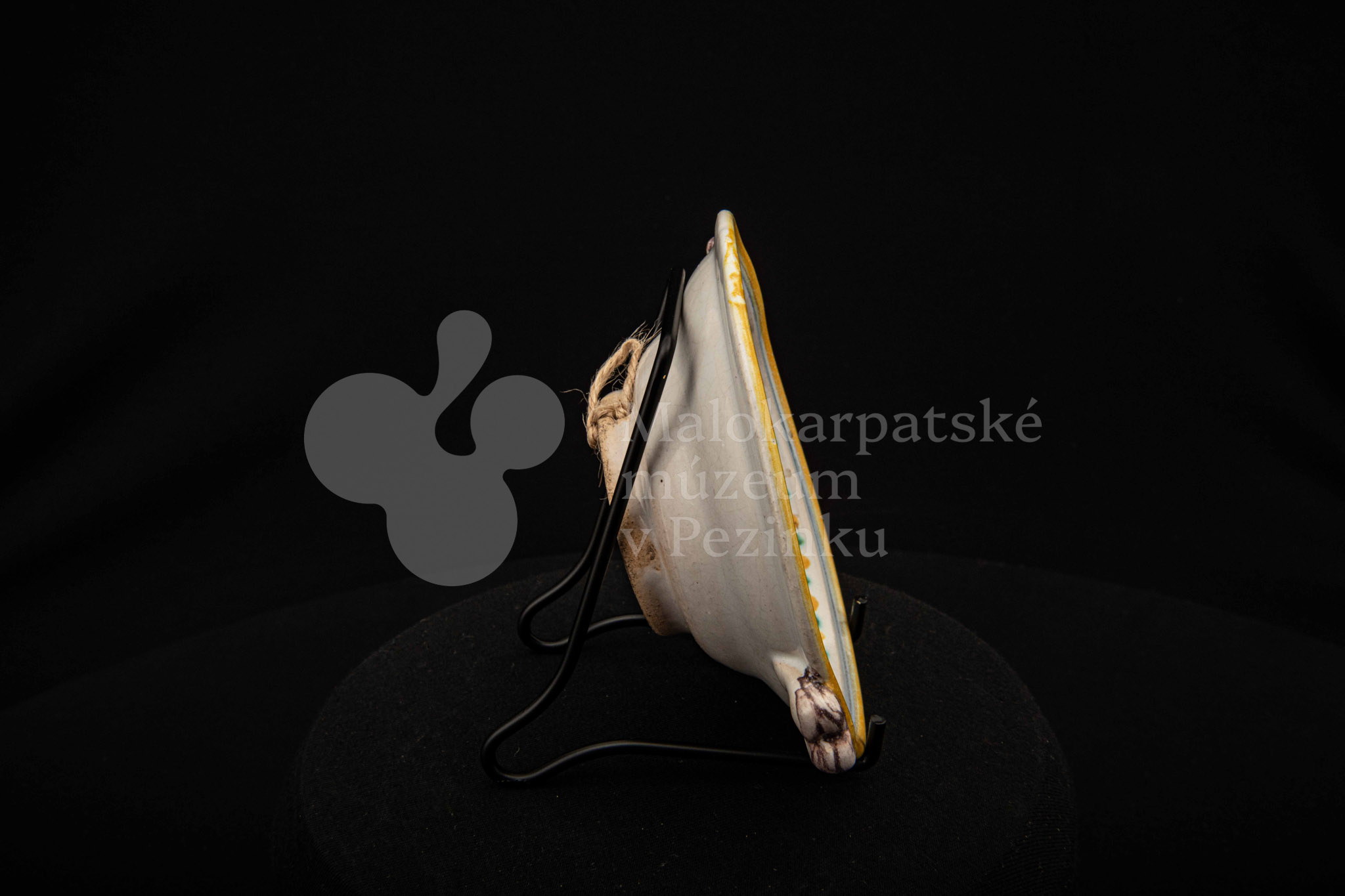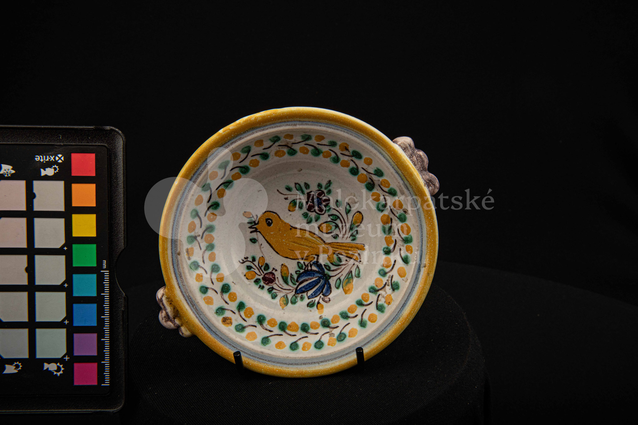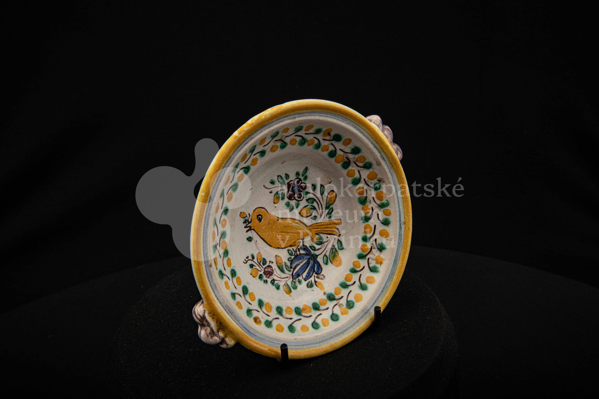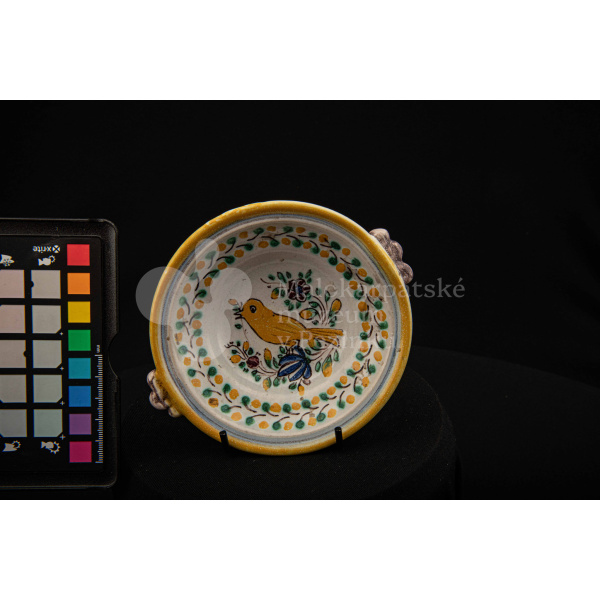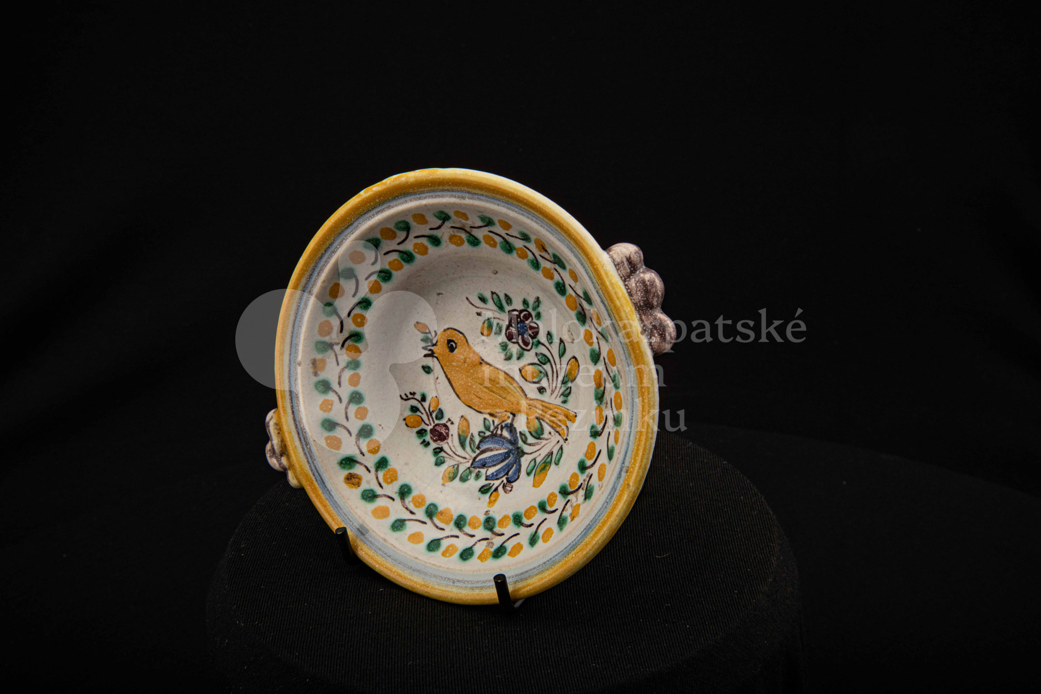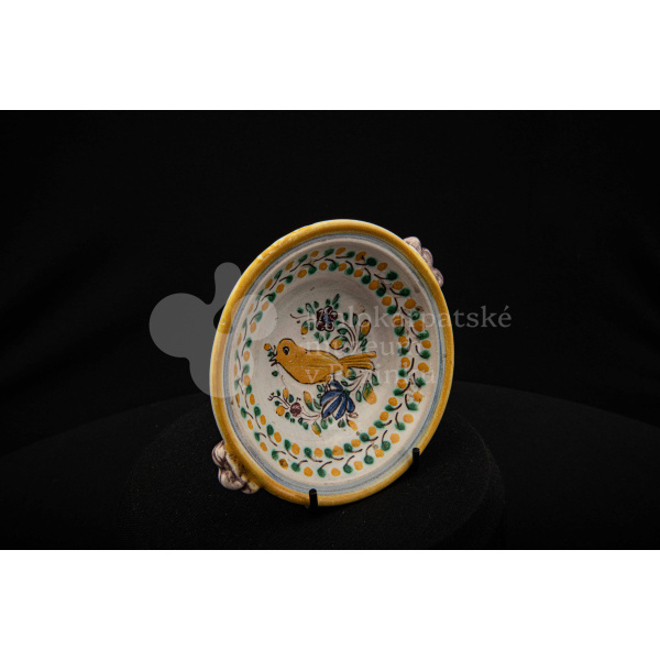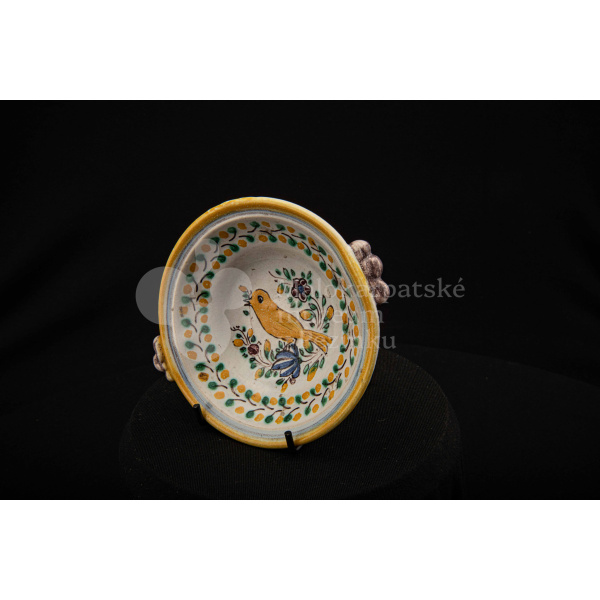 Tanierik fajansový – s dvoma ozdobnými uškami mangánovej farby. V strede maľovaný žltý vtáčik s kvetinovým dekorom, rovný okraj zdobený zelenými a žltými bobuľkami. Na dne značený FK.ST.