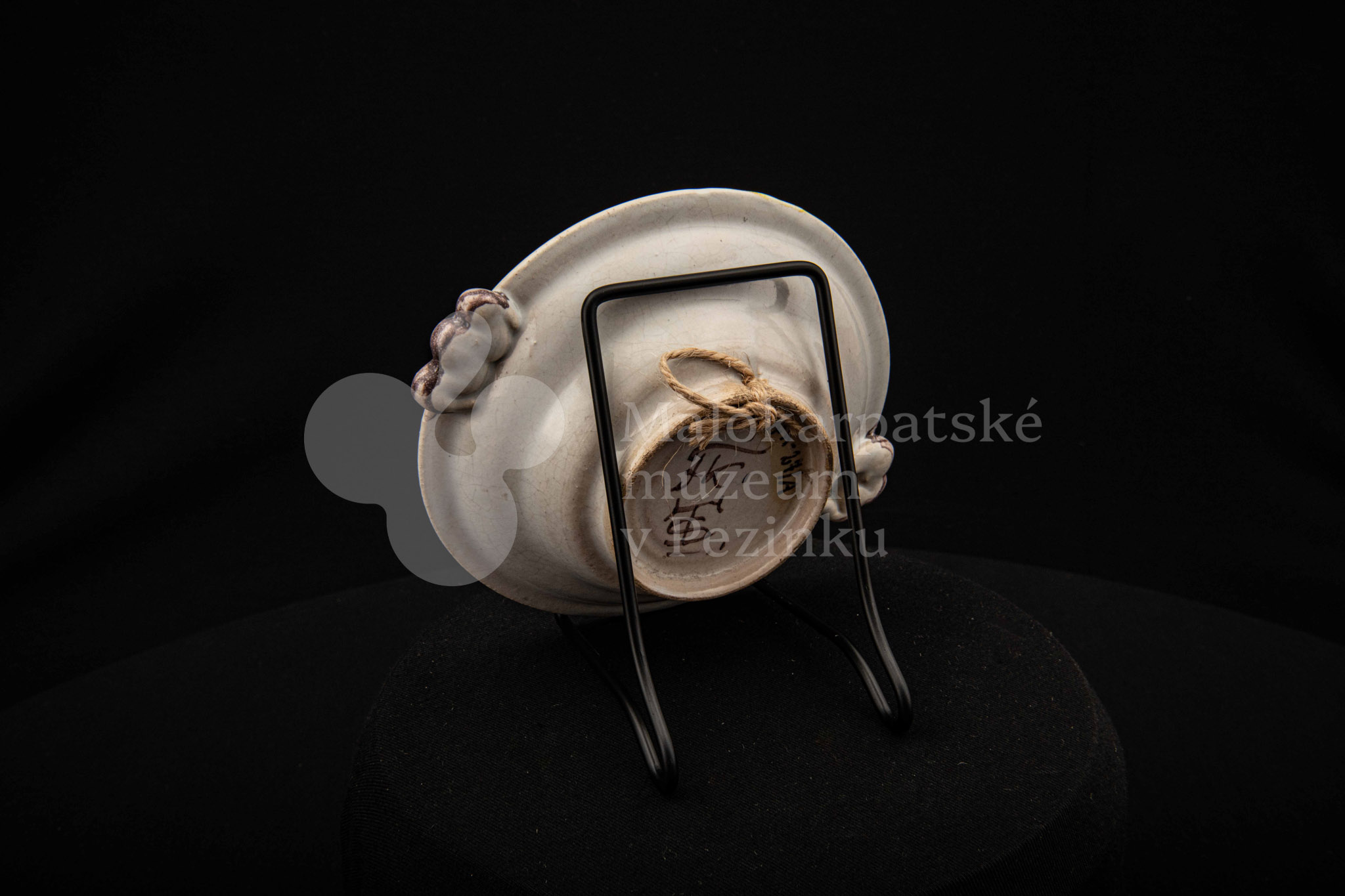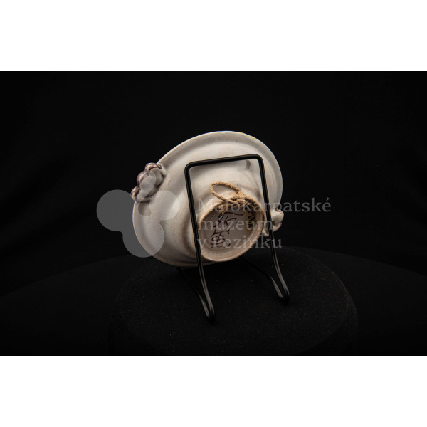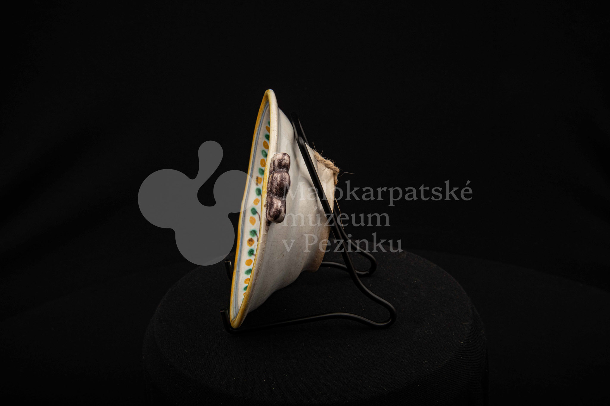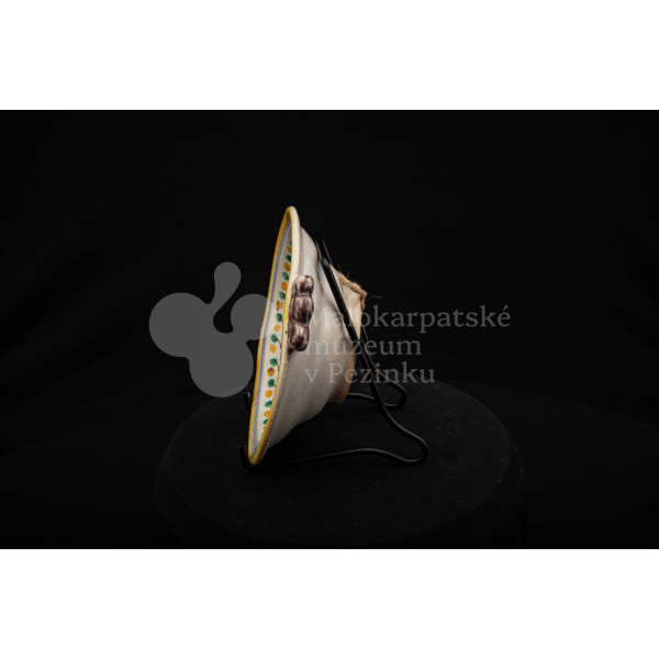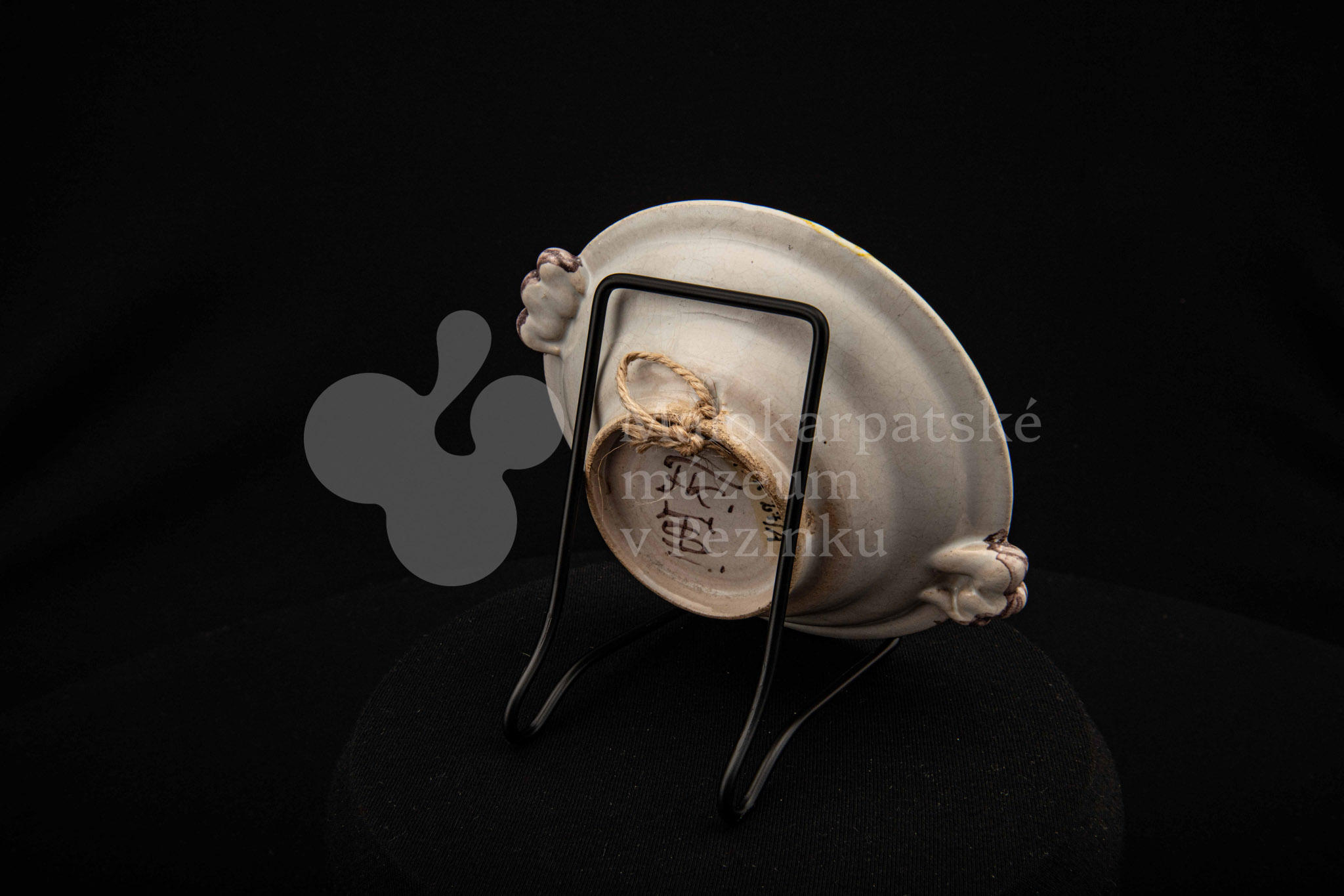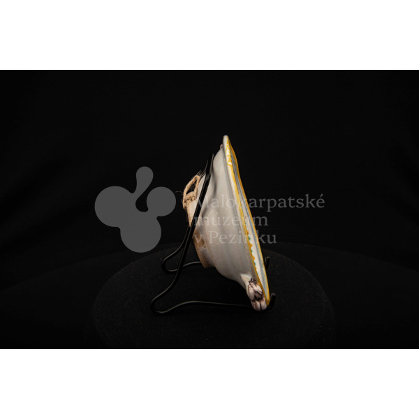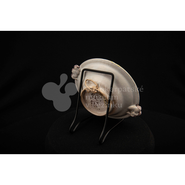 Tanierik fajansový – s dvoma ozdobnými uškami mangánovej farby. V strede maľovaný žltý vtáčik s kvetinovým dekorom, rovný okraj zdobený zelenými a žltými bobuľkami. Na dne značený FK.ST.