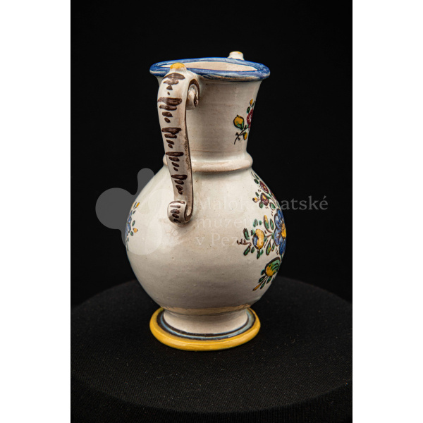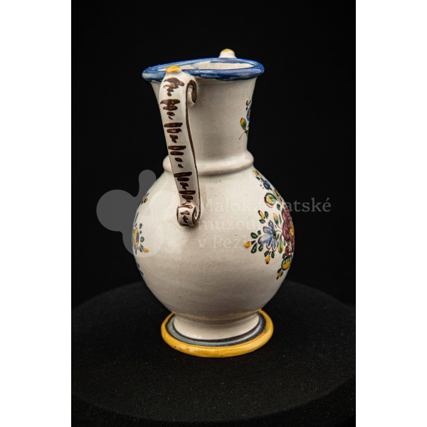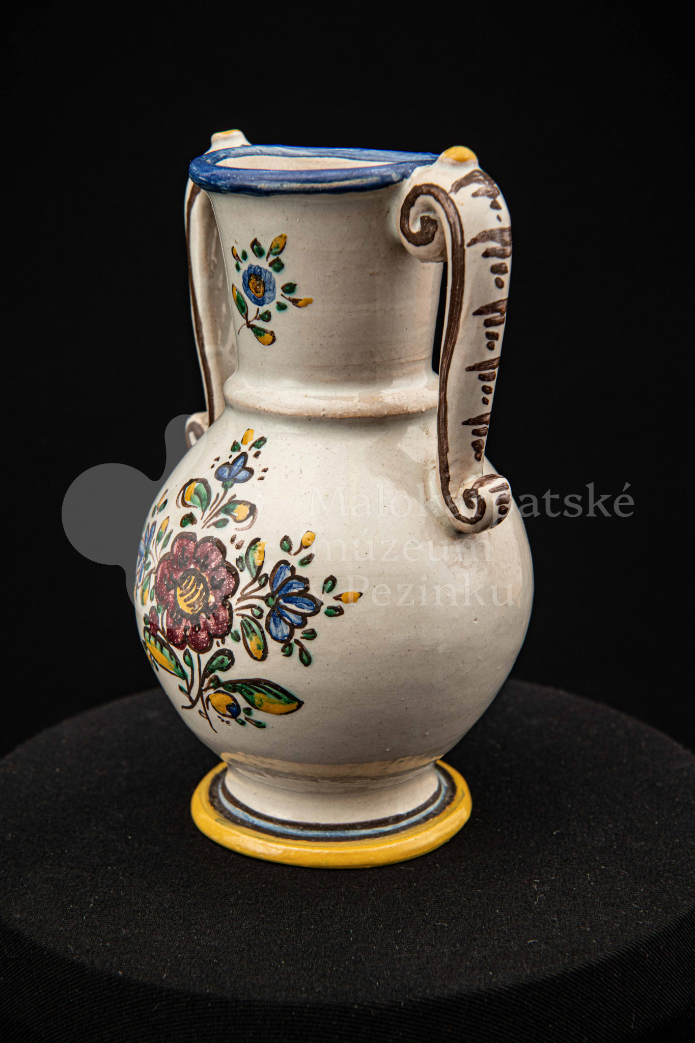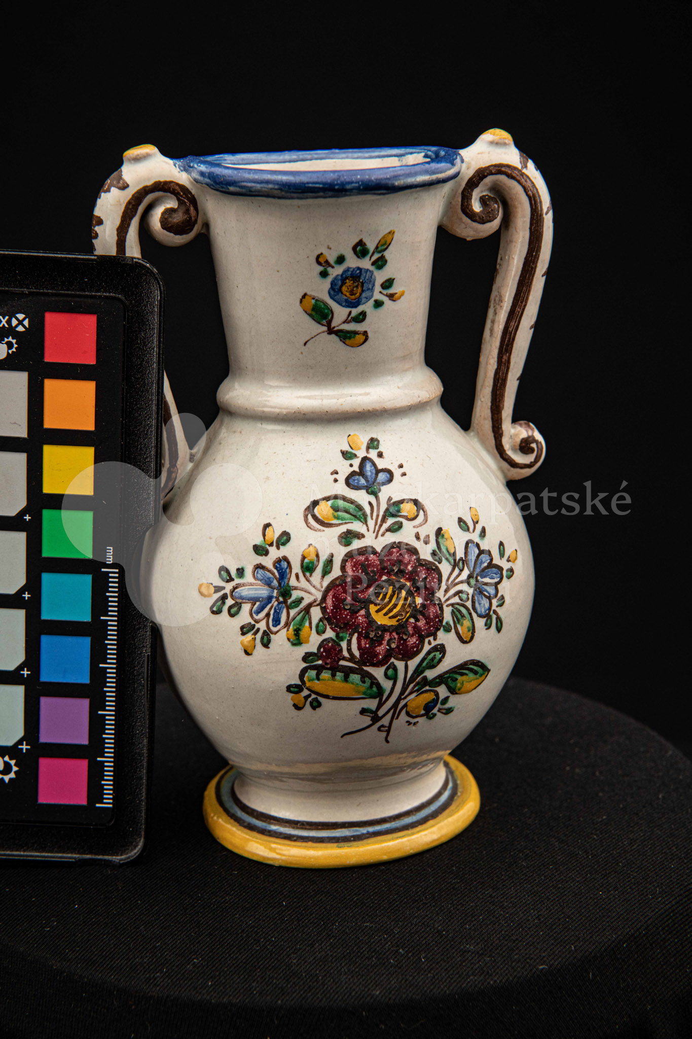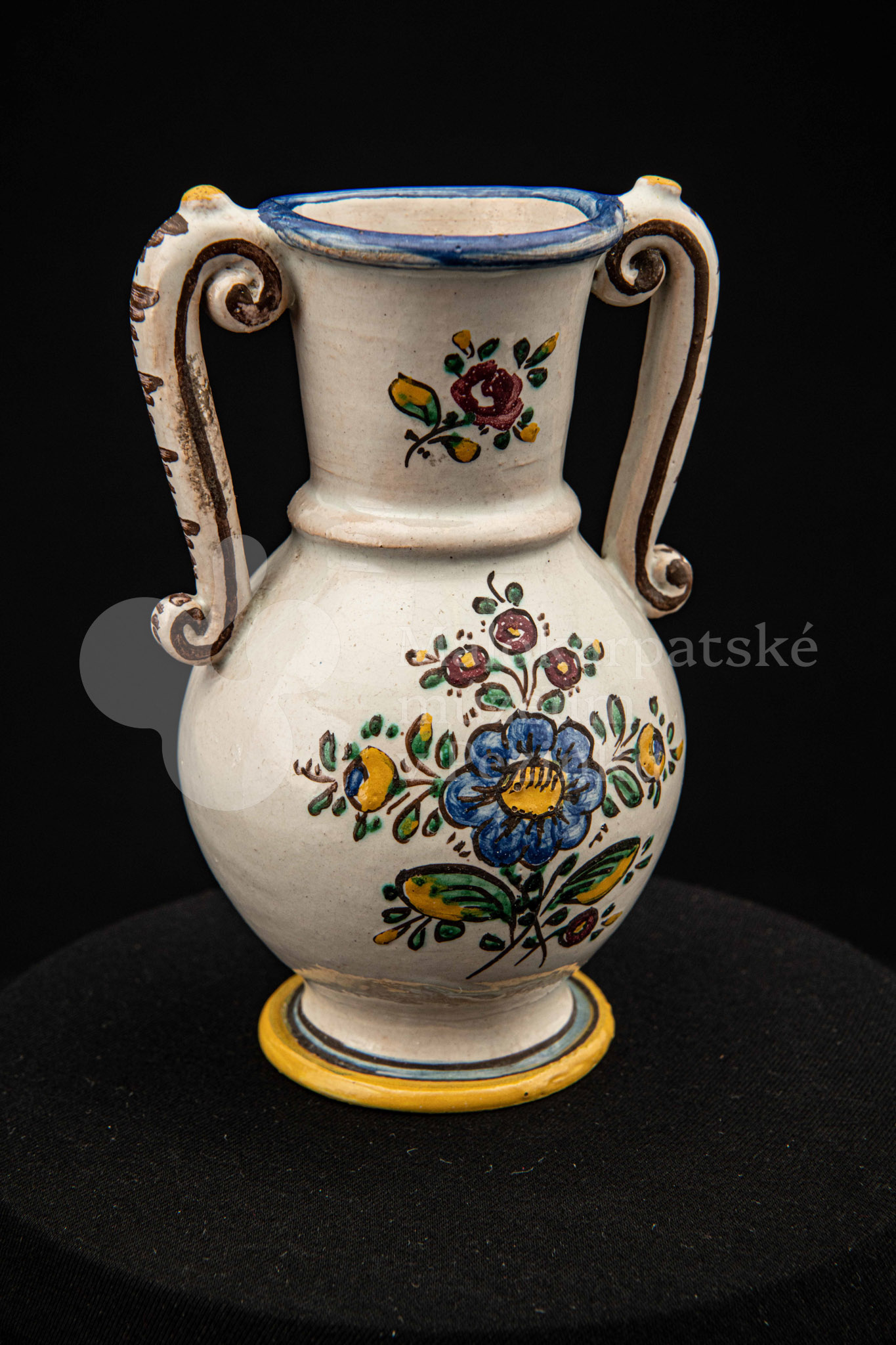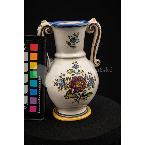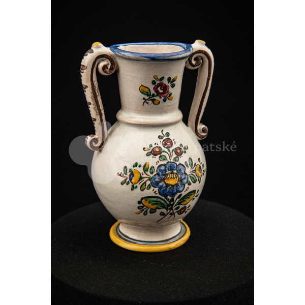 Vázička fajansová, z jednej strany maľovaná modrá ružička, z druhej červená. Točené ušká sú zdobené mangánovou farbou. Dekor rôznofarebný. Na dne je značenie FK.ST.