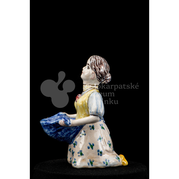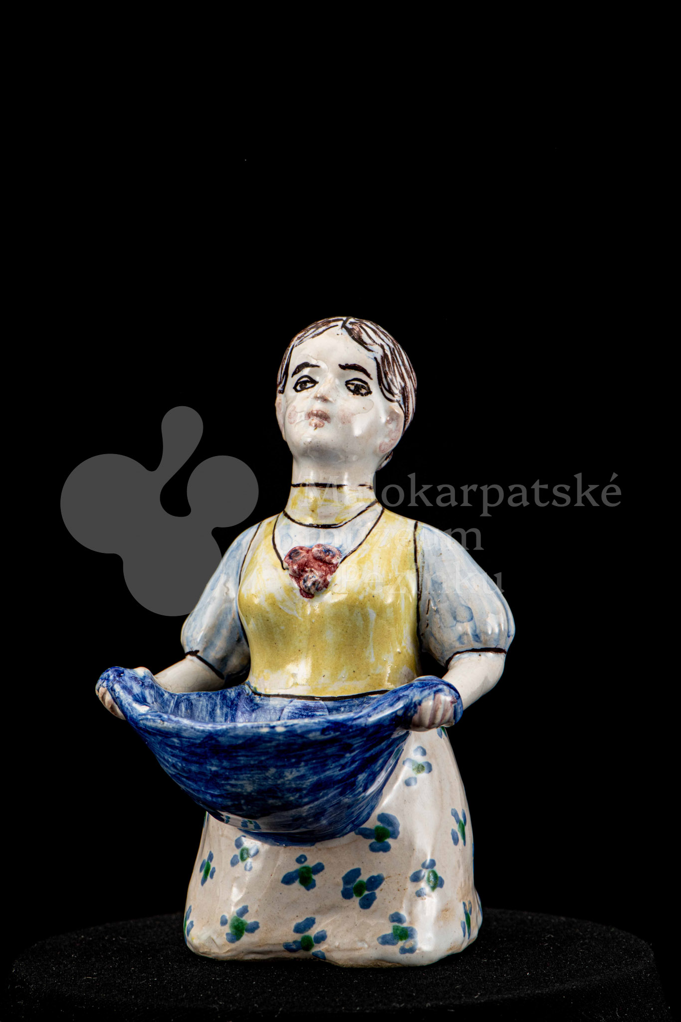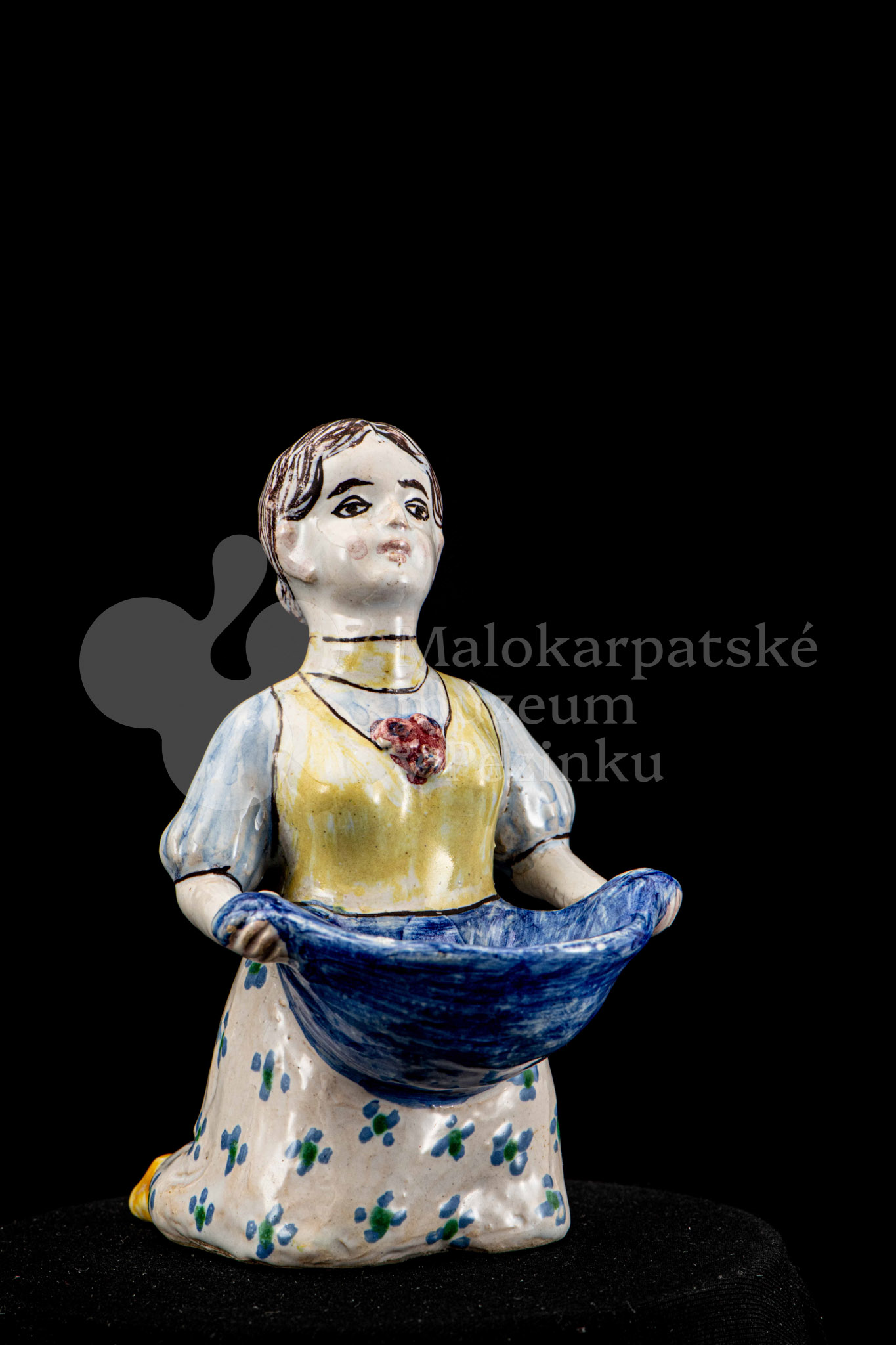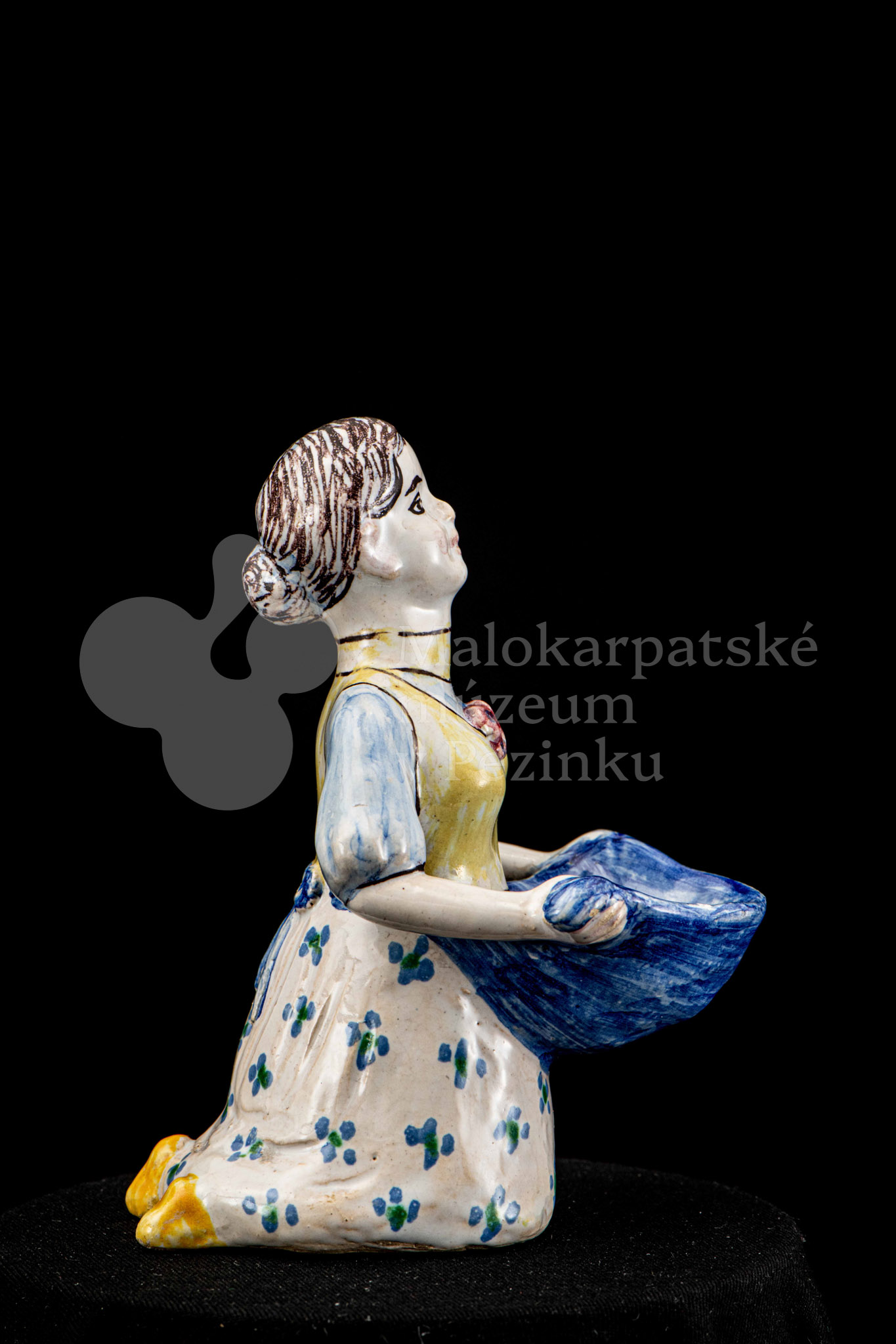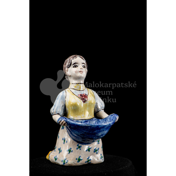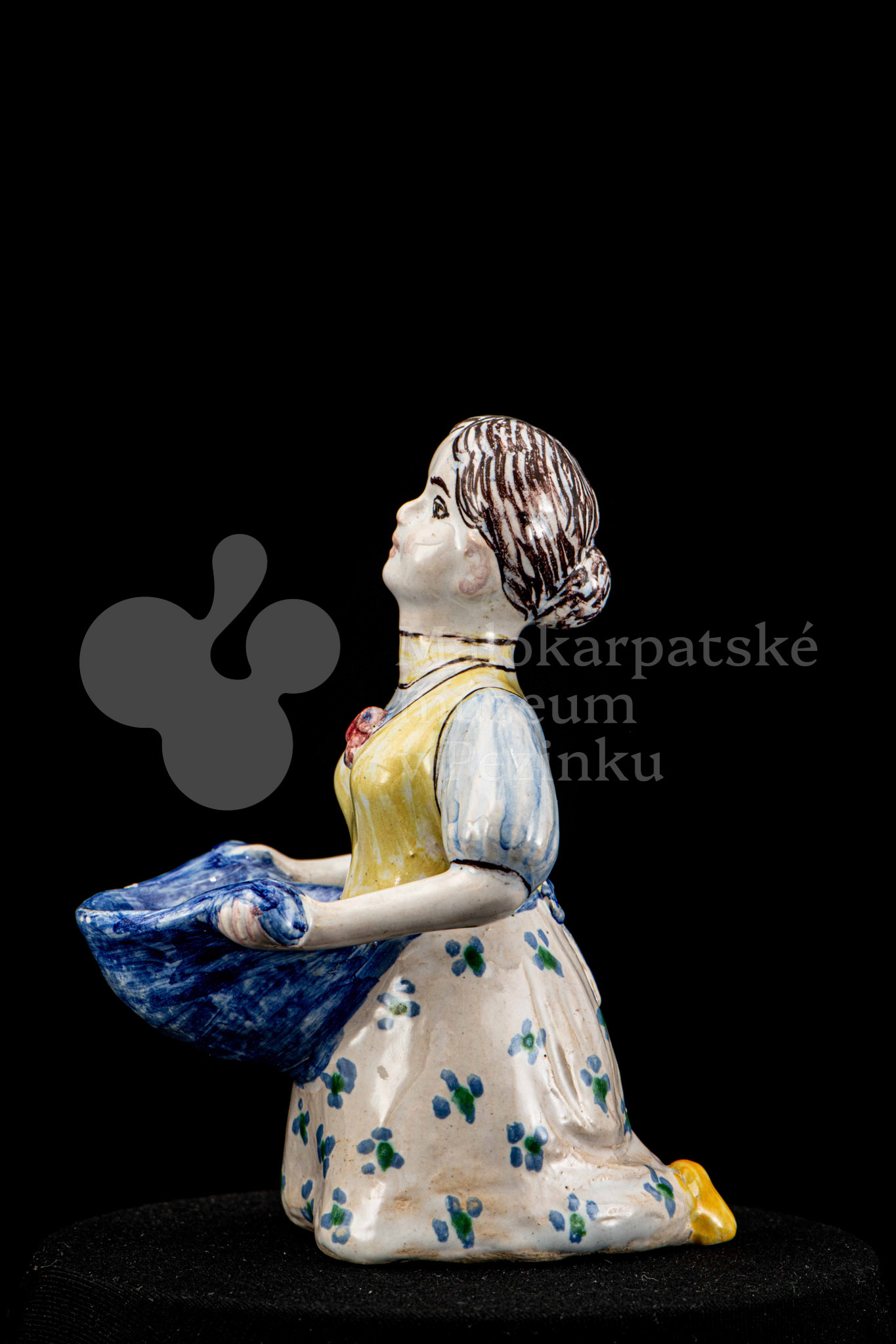 Plastika fajansová – kľačiaca žena, držiaca si zásteru, z ktorej tak vzniká popolník či soľnička. Zástera sýtomodrá, biela sukňa s modrozeleným kvietkovým dekorom. Zvnútra značená FK.ST.