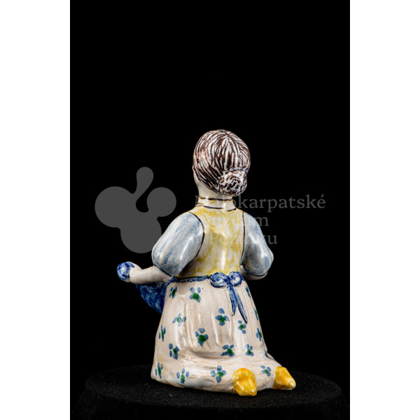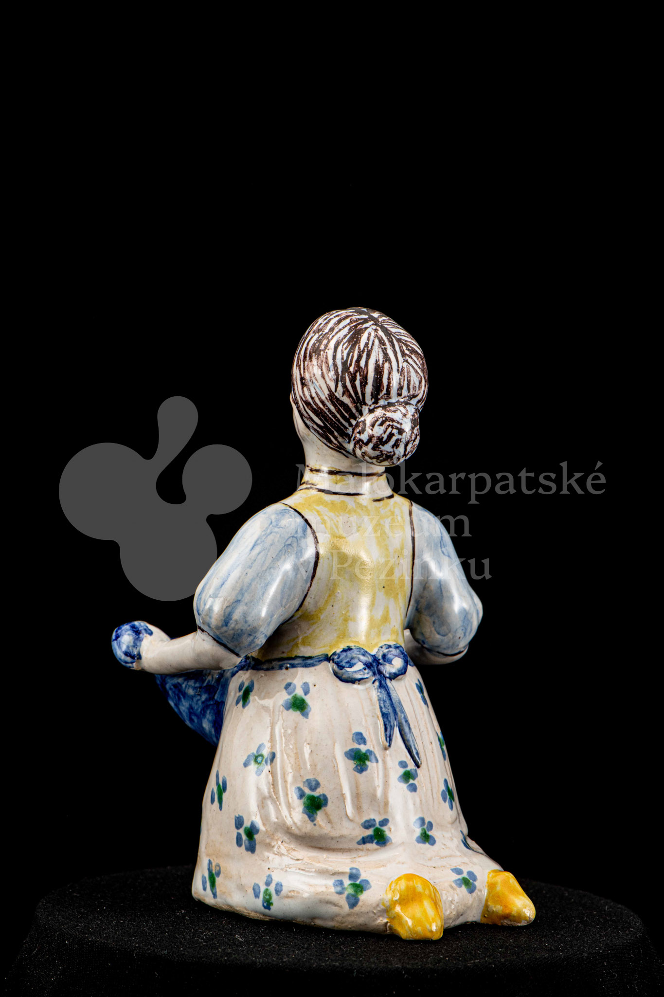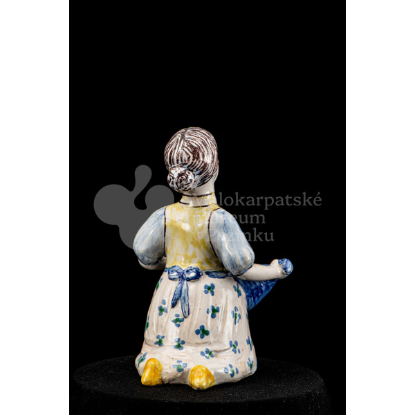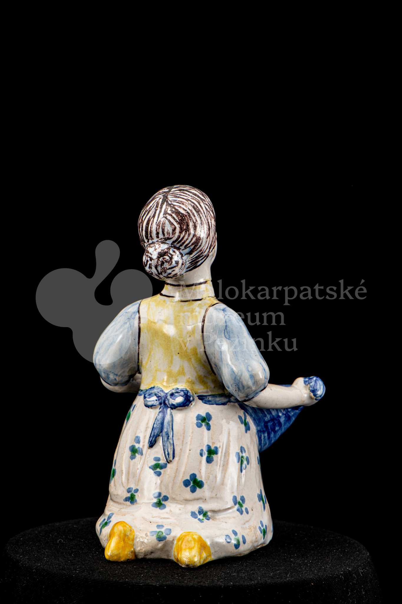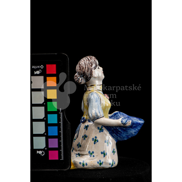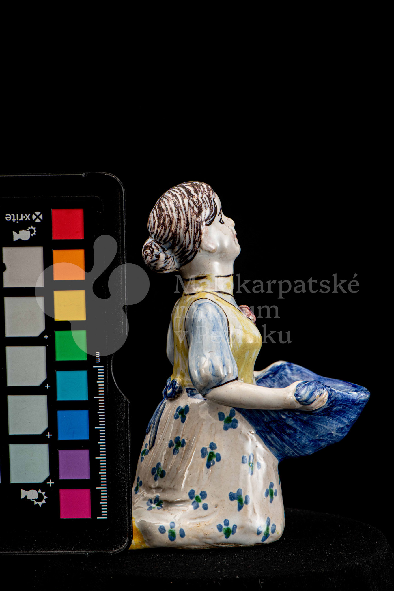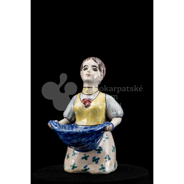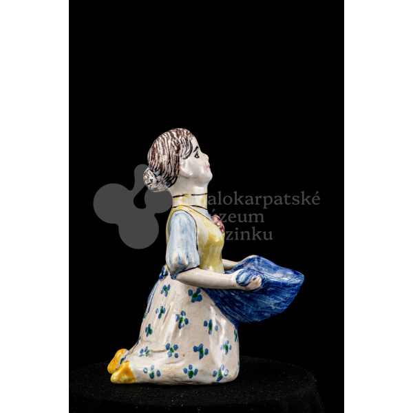 Plastika fajansová – kľačiaca žena, držiaca si zásteru, z ktorej tak vzniká popolník či soľnička. Zástera sýtomodrá, biela sukňa s modrozeleným kvietkovým dekorom. Zvnútra značená FK.ST.