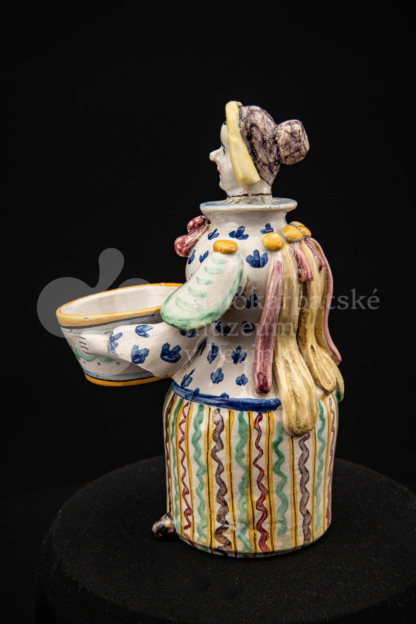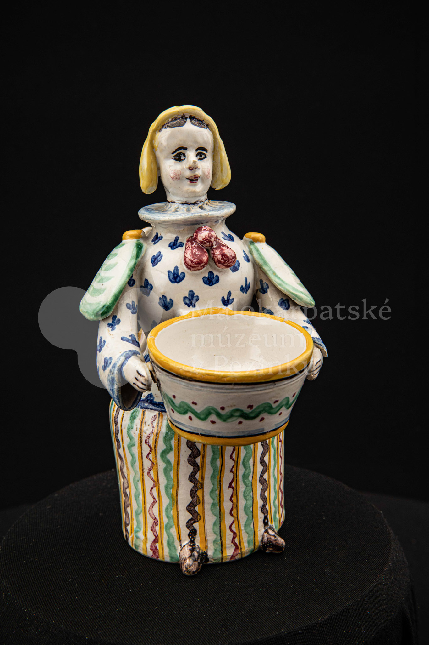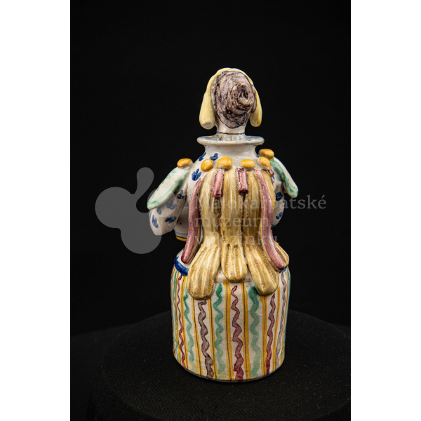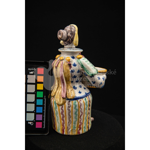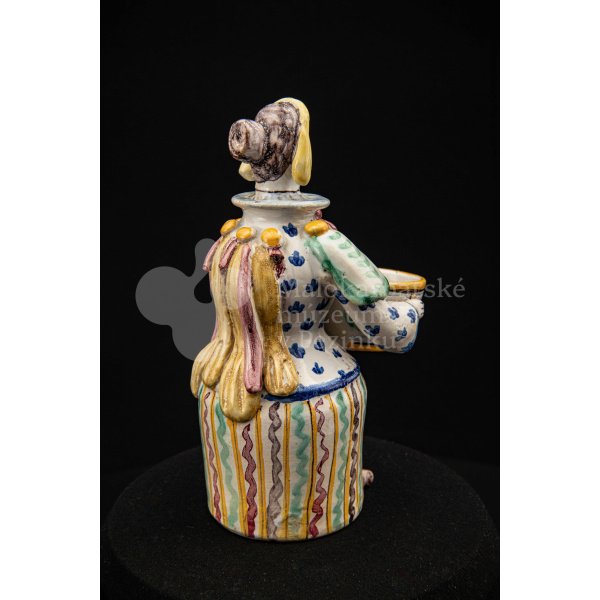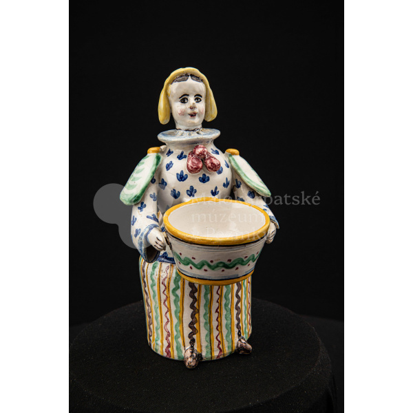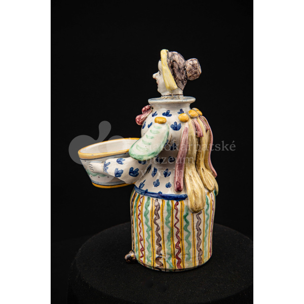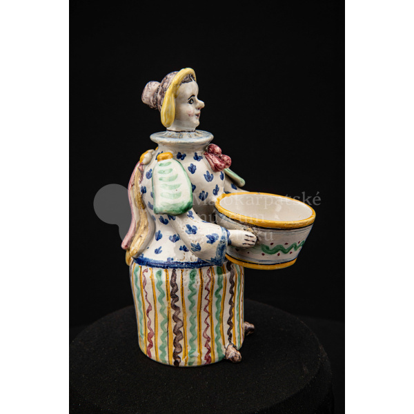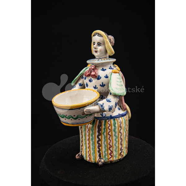 Plastika fajansová – štylizovaná postava ženy držiaca v oboch rukách nádobku na soľ. Farebnosť rôzna. Vnútri značené FK.ST.
