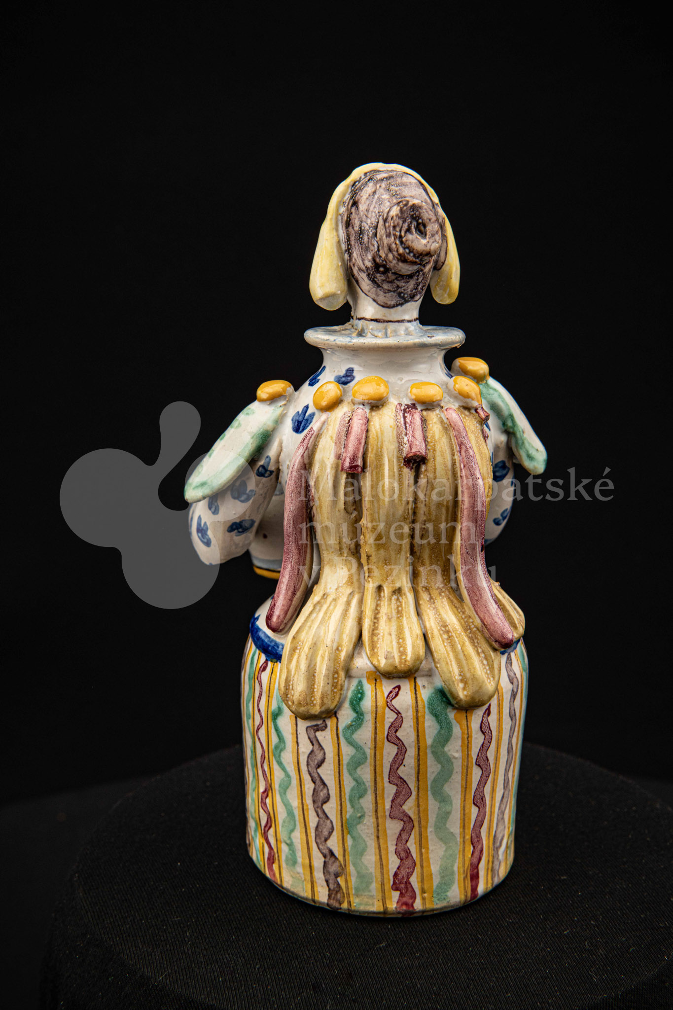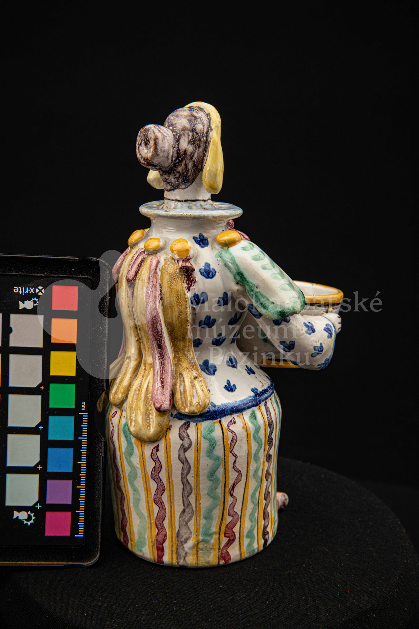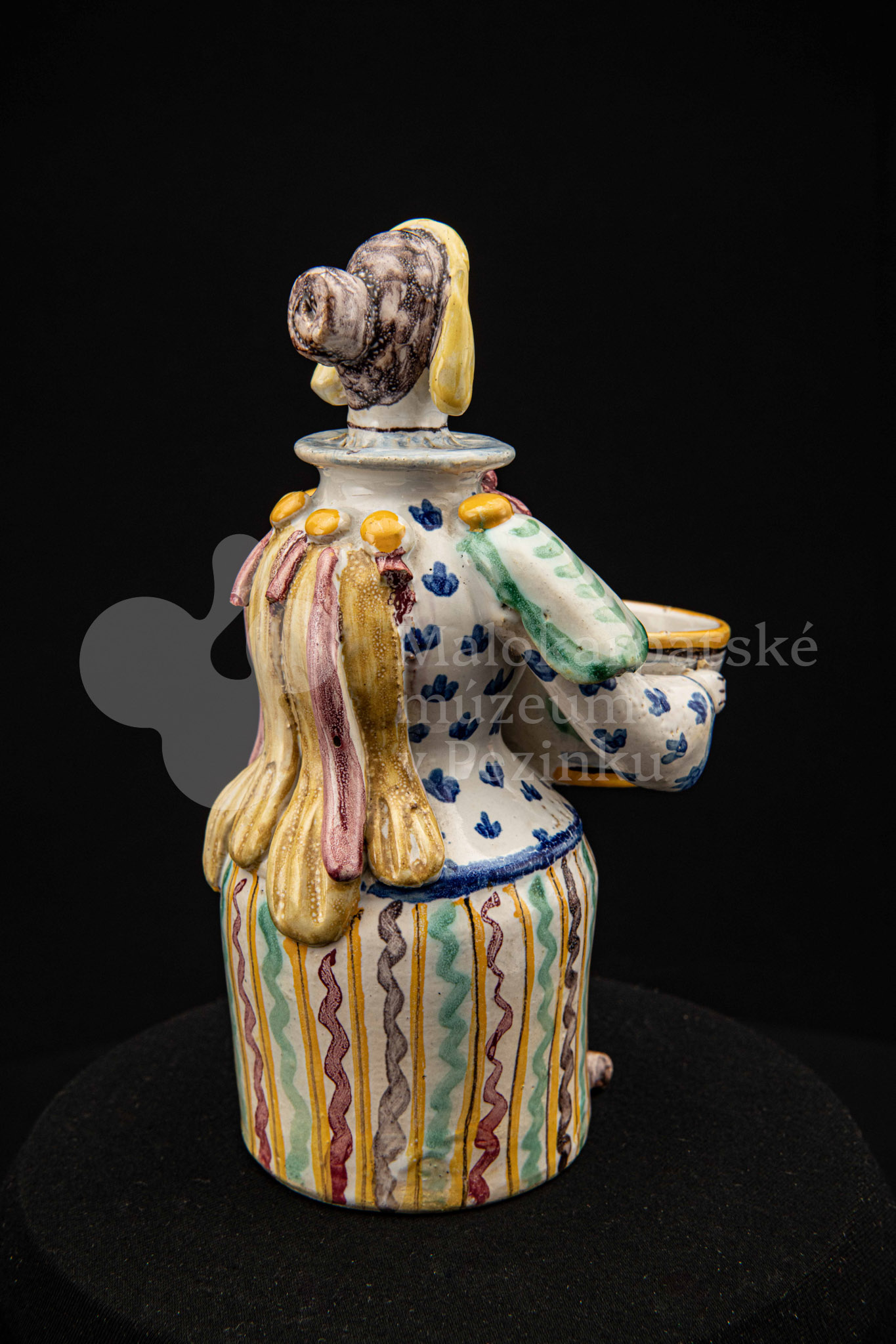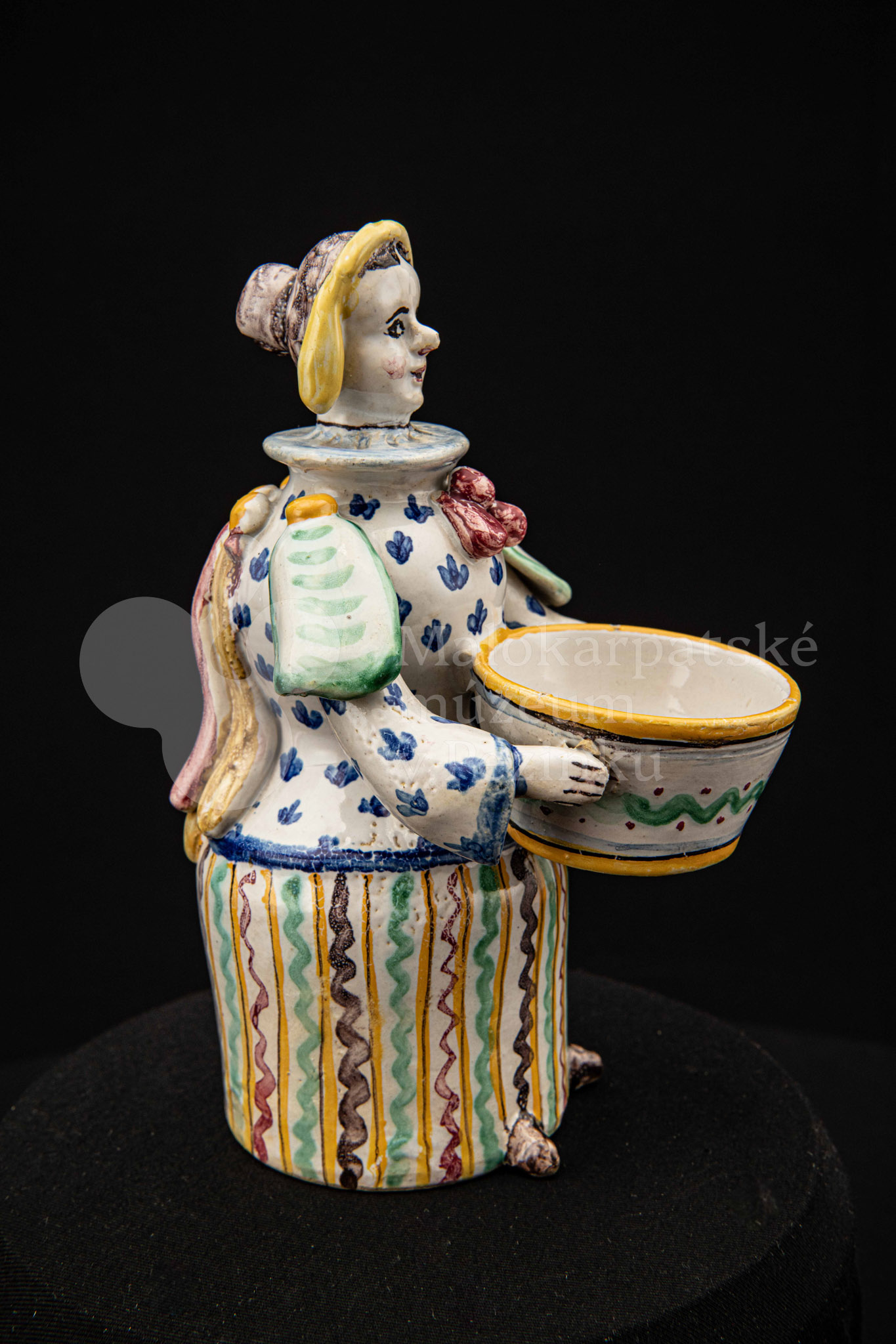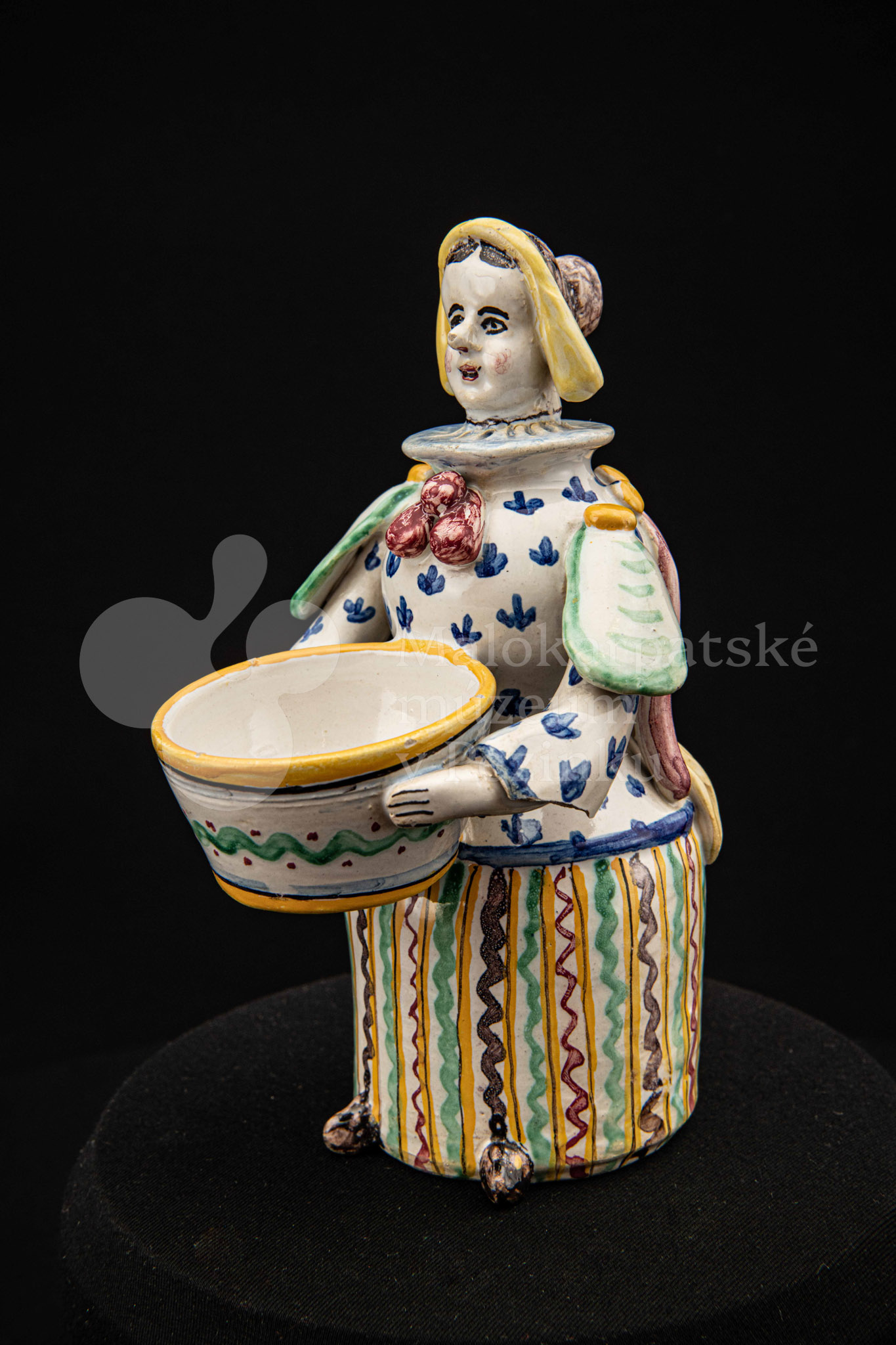 Plastika fajansová – štylizovaná postava ženy držiaca v oboch rukách nádobku na soľ. Farebnosť rôzna. Vnútri značené FK.ST.