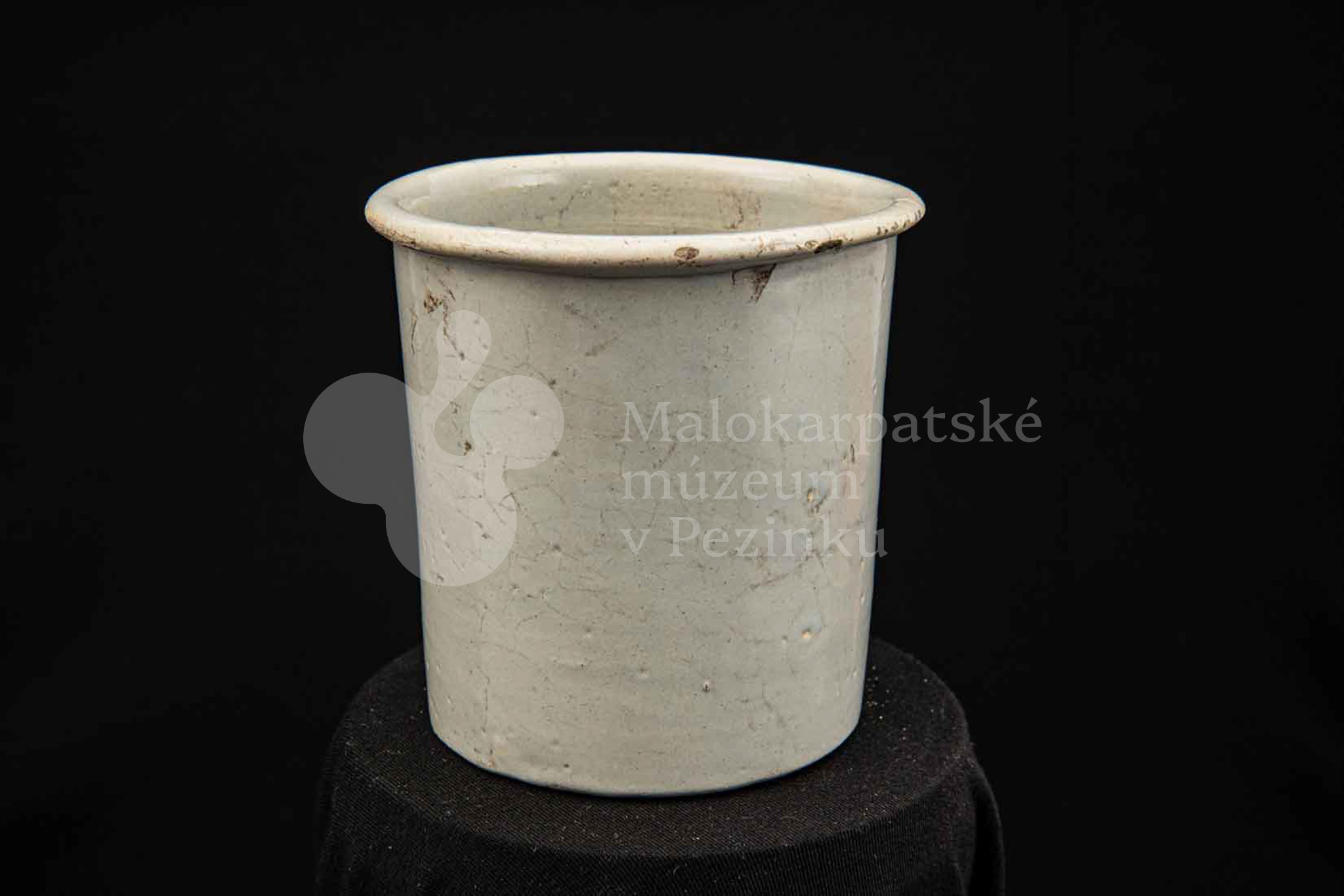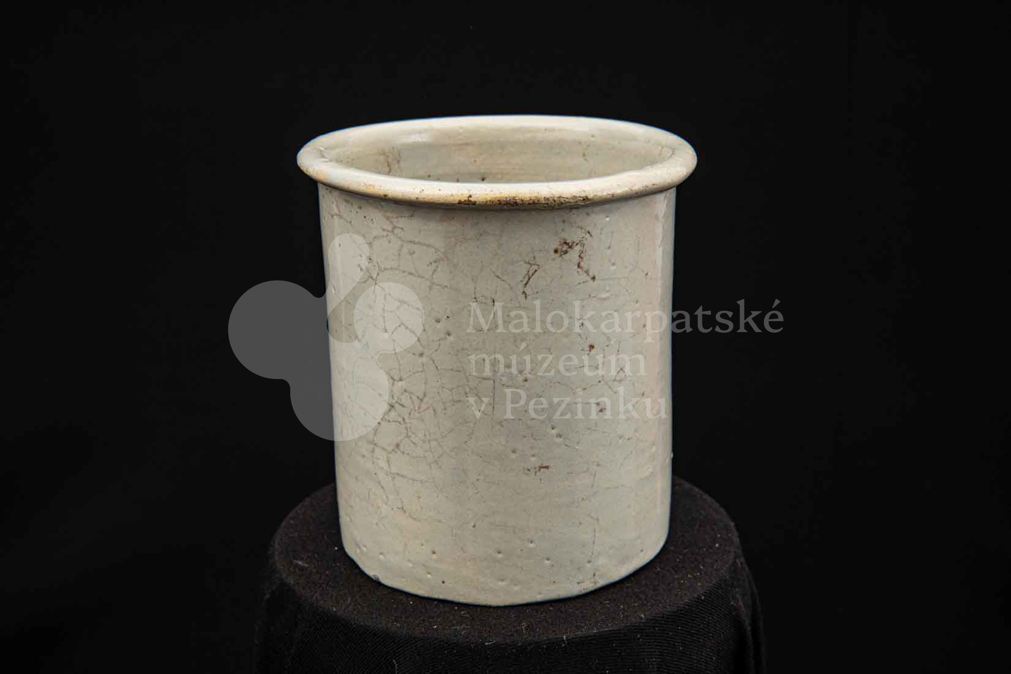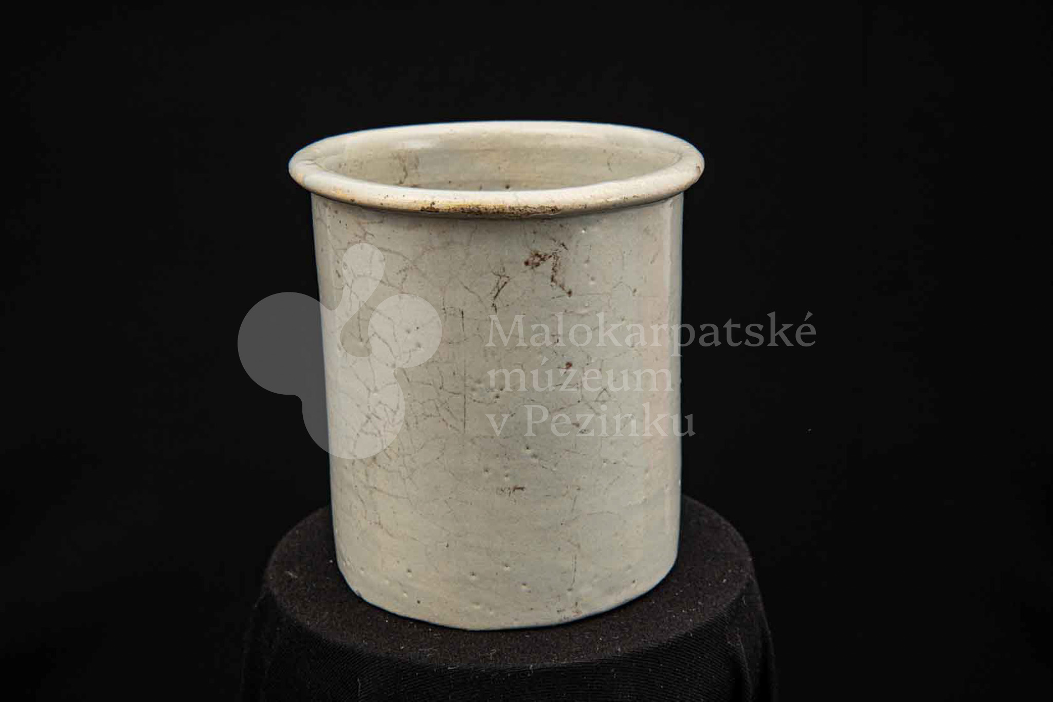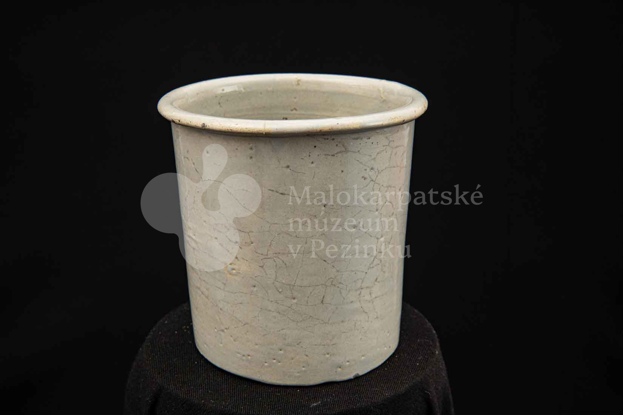 Nádoba keramická, valcového tvaru, bielo glazovaná, poškodená.