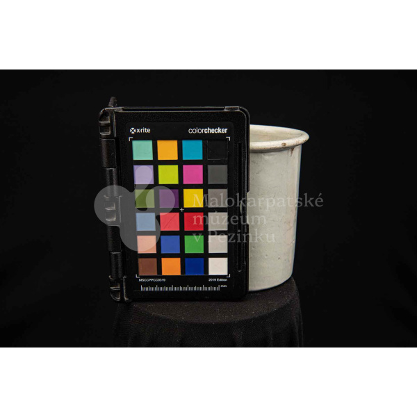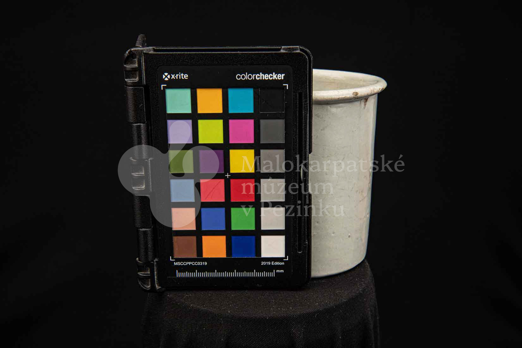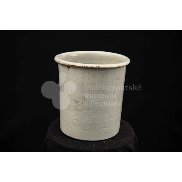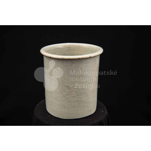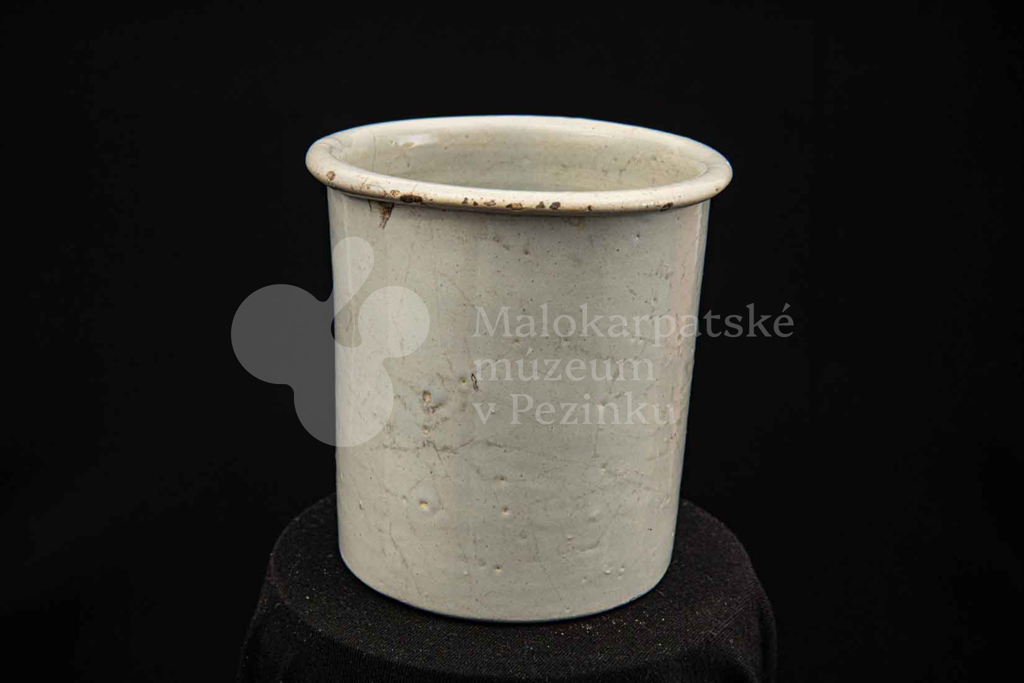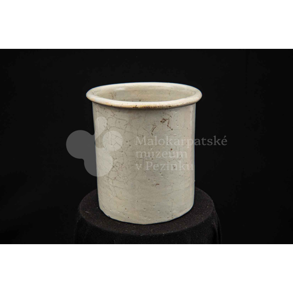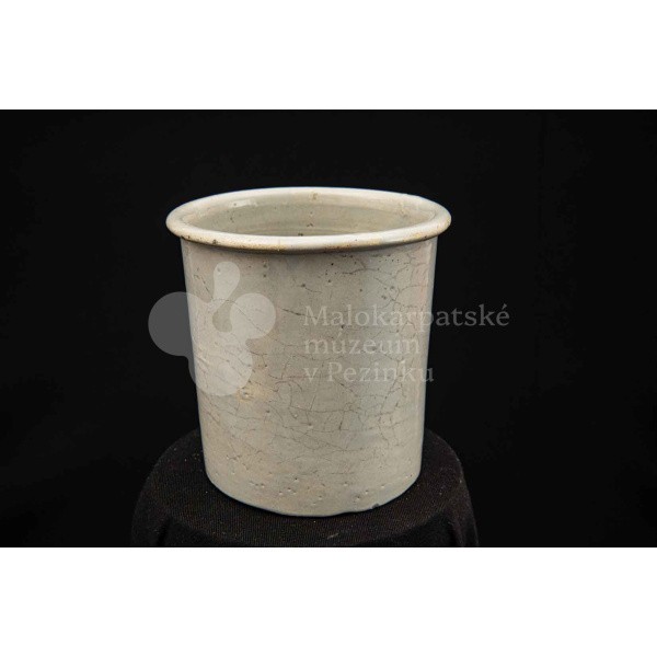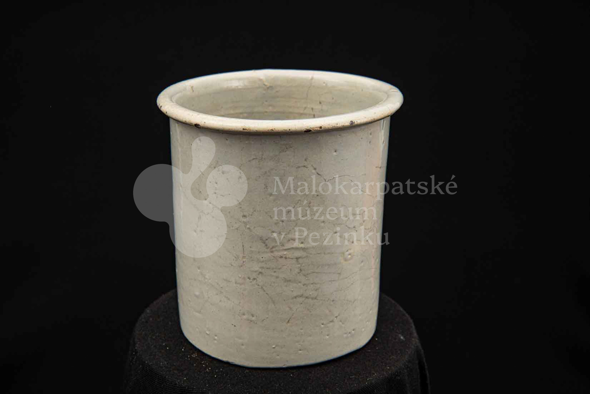 Nádoba keramická, valcového tvaru, bielo glazovaná, poškodená.